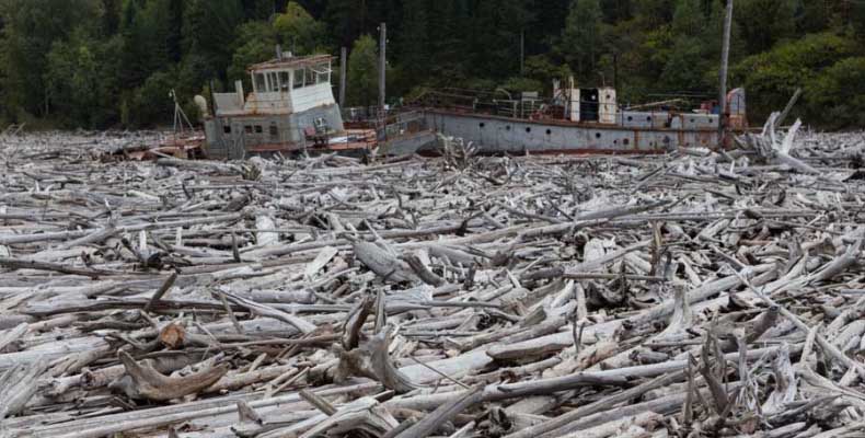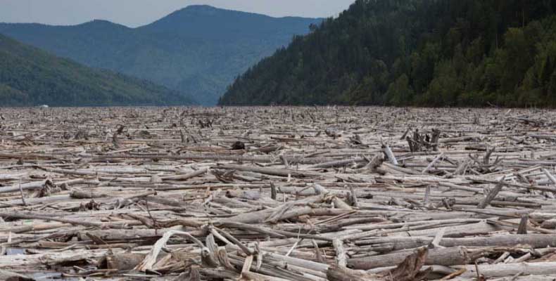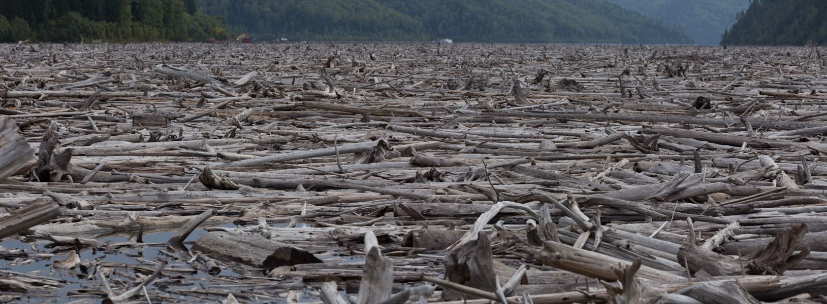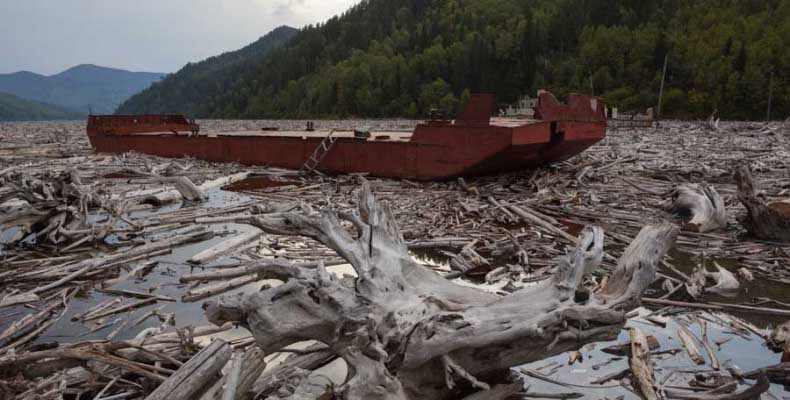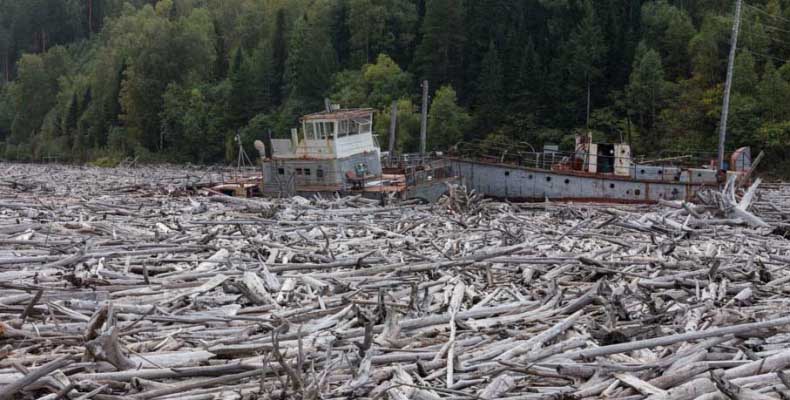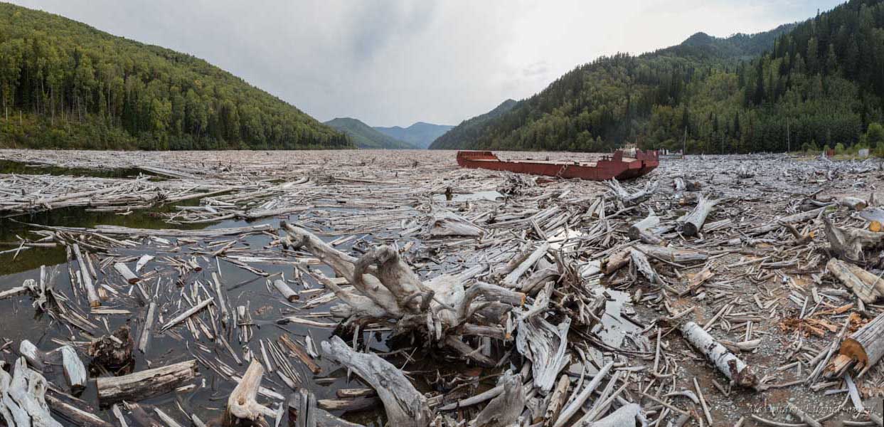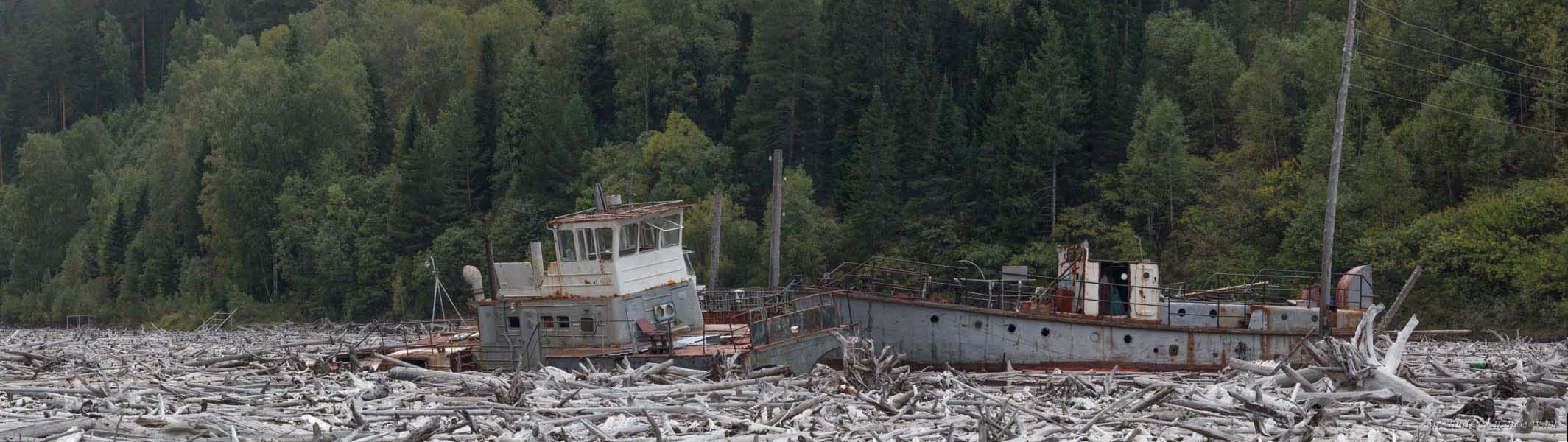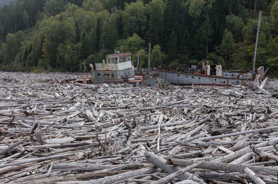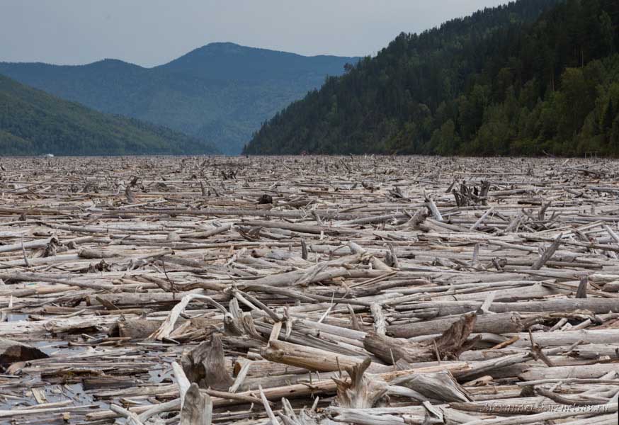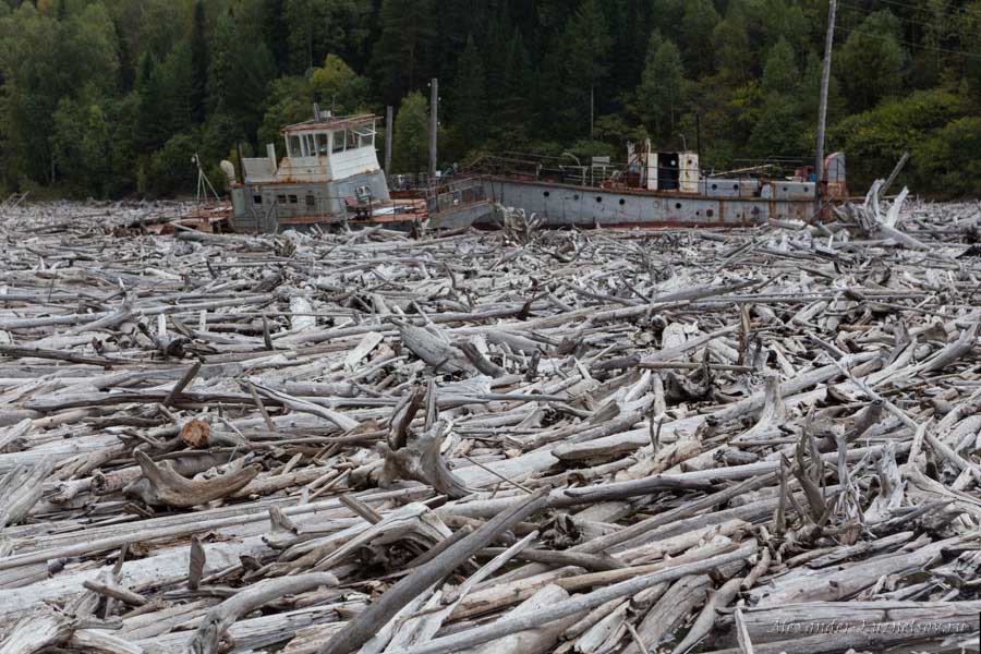 При затоплении очень много леса всплыло, и на берегу построили пилорамы, которые этот лес и пилили. А сейчас уже немного осталось. Место сюрреалистическое.
