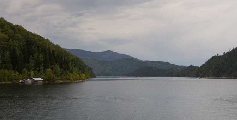 Мы хотели заехать на соседнюю гору, чтобы посмотреть на ГЭС сверху, но не нашли дороги. Доехали до водохранилища с другой стороны. Там в первой бухте очень много бревен, побелевших от времени в воде.