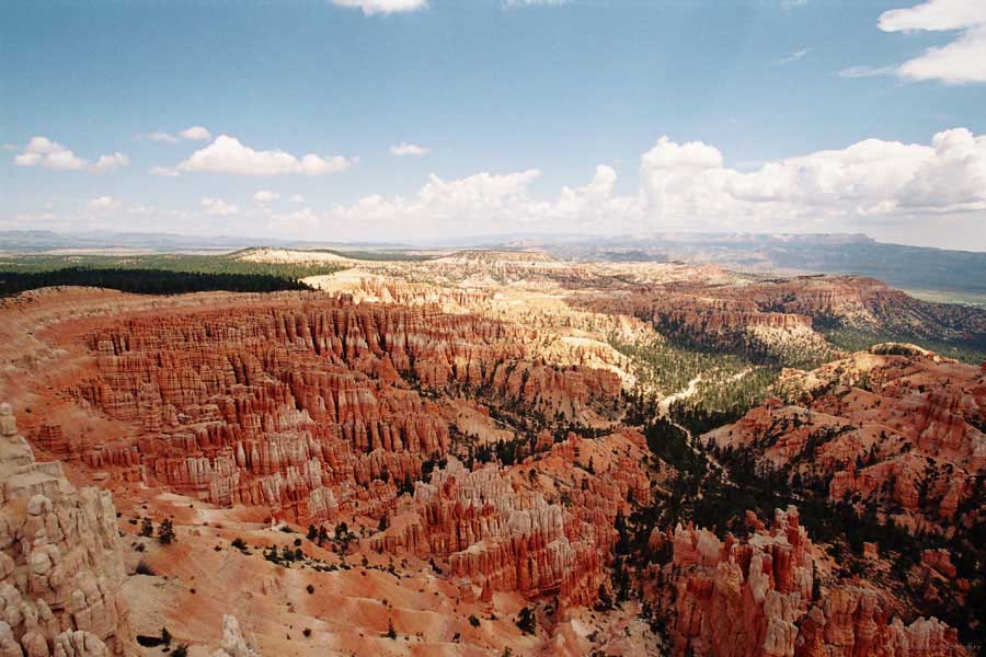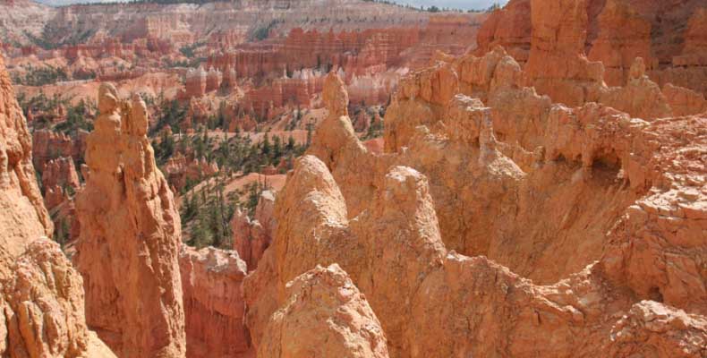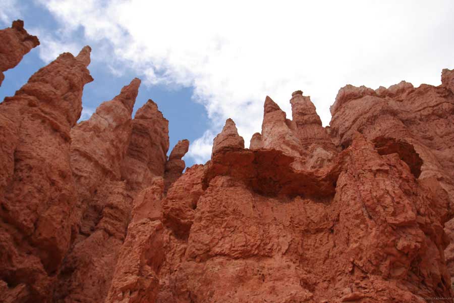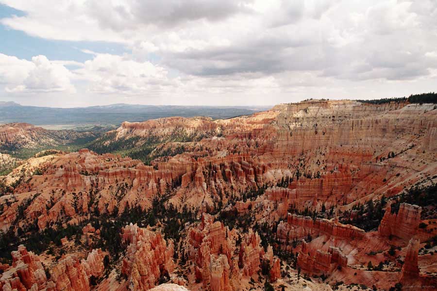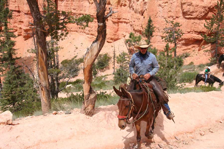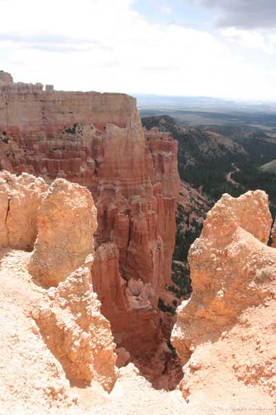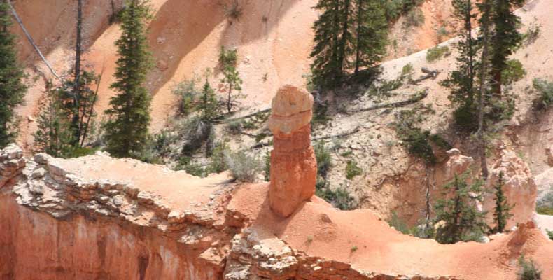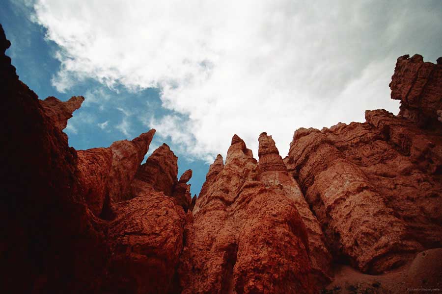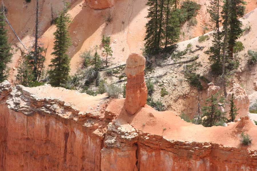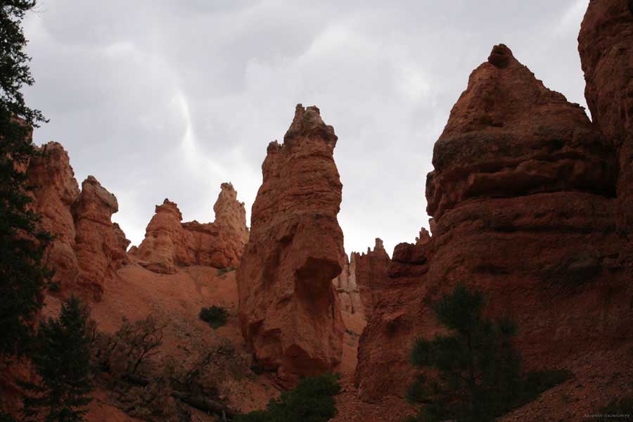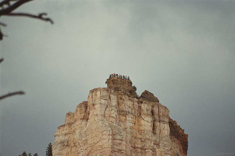 Следующее утро едем в Брайс Каньон (Bryce canyon), тоже молодой. До него миль 80. По дороге встречается Red canyon (красный). Все сразу из машин вылазят, фотографируют, но это лишнее. После Брайс на обратном пути вас уже там ничего не привлечет. Сразу скажу, что те панорамы, которые я помню из финала "Золото Макенны", я в Брайсе не увидел. Надо еще раз посмотреть фильм. Может, там что-то другое снимали. Но панорамы каньона действительно необычны. Причем сверху смотрится лучше. В Брайс, пройдя немного по краю и поснимав, я бросился вниз. Везде написано, по нему пройти от точки до точки надо 4-5 часов. Это, конечно, вранье. Не сильно напрягаясь, за два с половиной часа пройдете от Bryce point до Sunrise point, т.е. по всему низу.