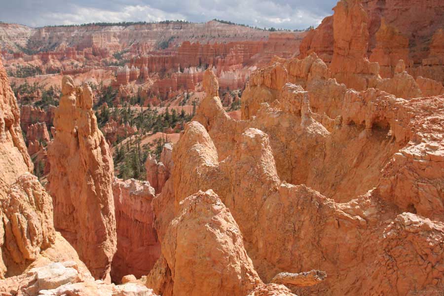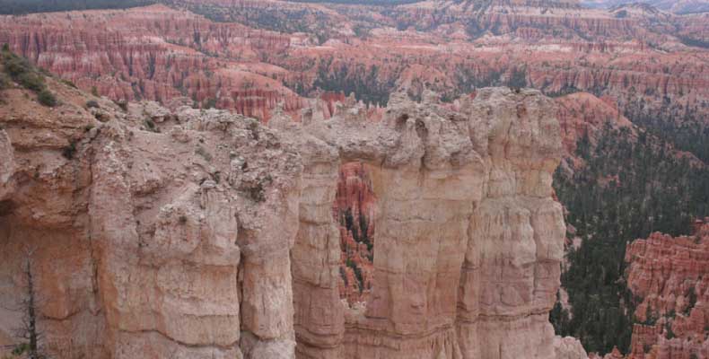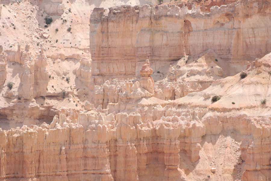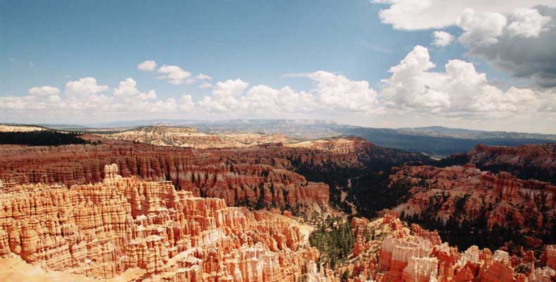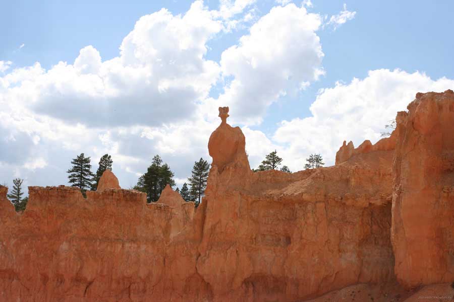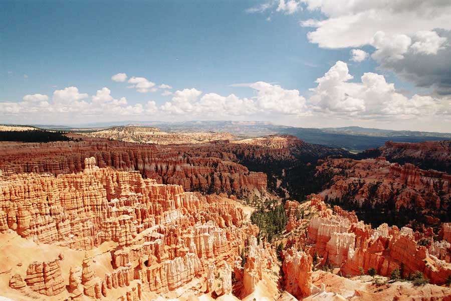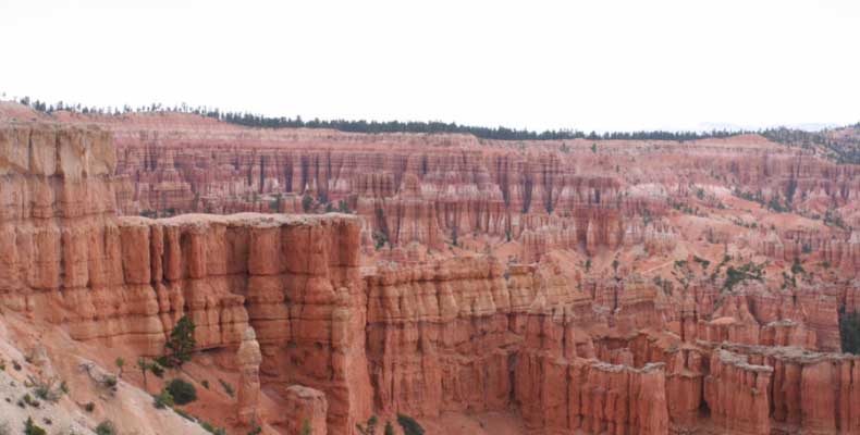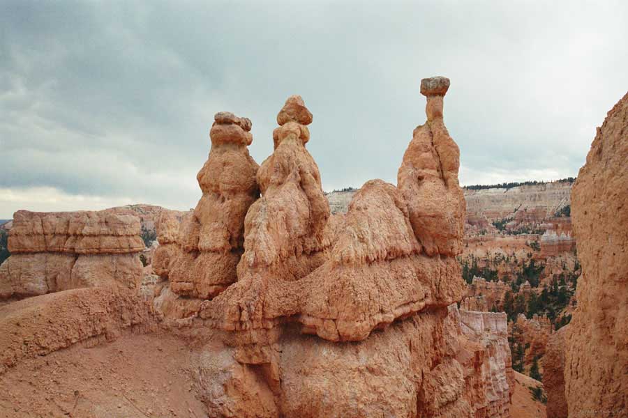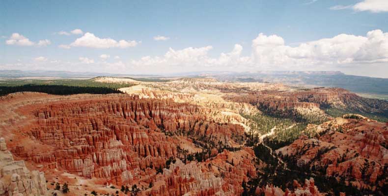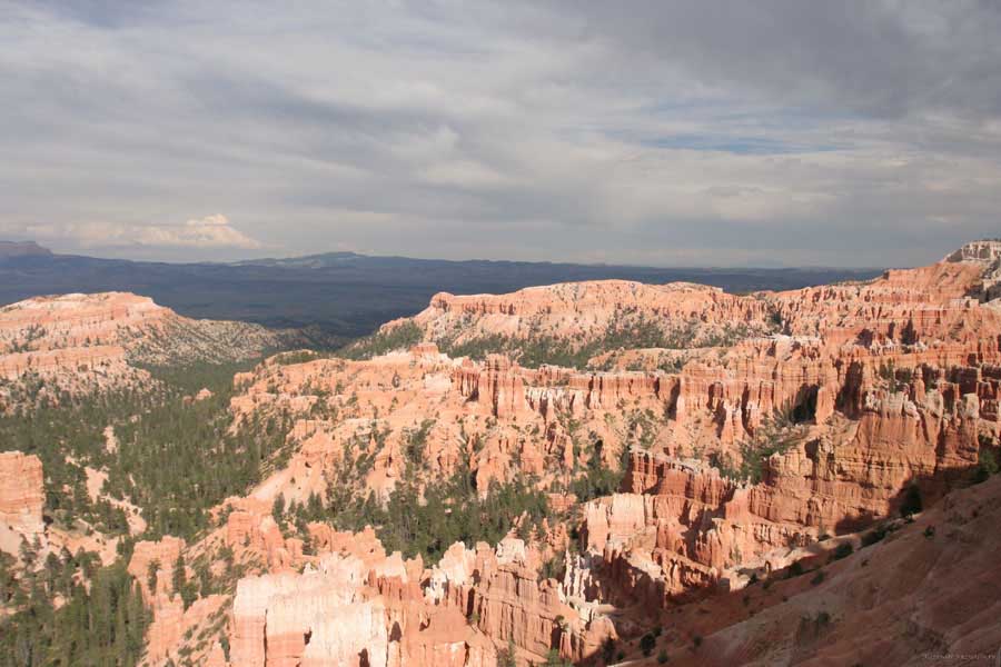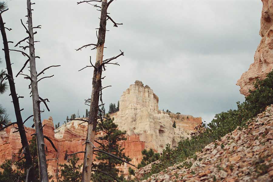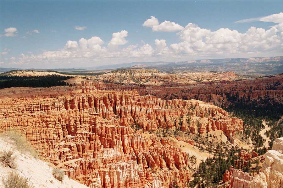 Следующее утро едем в Брайс Каньон (Bryce canyon), тоже молодой. До него миль 80. По дороге встречается Red canyon (красный). Все сразу из машин вылазят, фотографируют, но это лишнее. После Брайс на обратном пути вас уже там ничего не привлечет. Сразу скажу, что те панорамы, которые я помню из финала "Золото Макенны", я в Брайсе не увидел. Надо еще раз посмотреть фильм. Может, там что-то другое снимали. Но панорамы каньона действительно необычны. Причем сверху смотрится лучше. В Брайс, пройдя немного по краю и поснимав, я бросился вниз. Везде написано, по нему пройти от точки до точки надо 4-5 часов. Это, конечно, вранье. Не сильно напрягаясь, за два с половиной часа пройдете от Bryce point до Sunrise point, т.е. по всему низу.