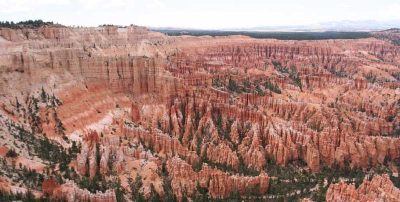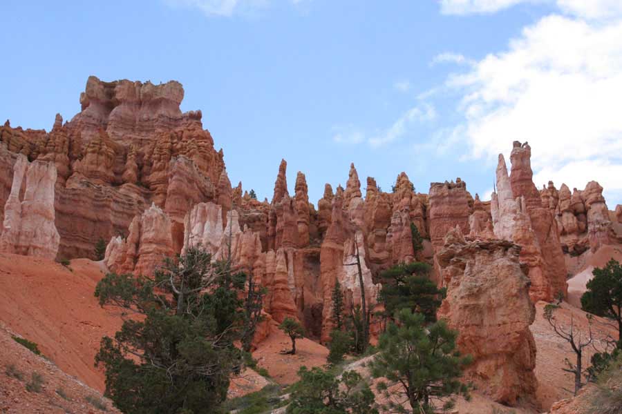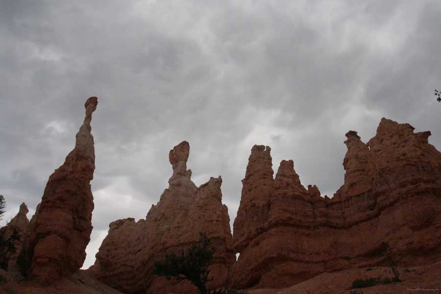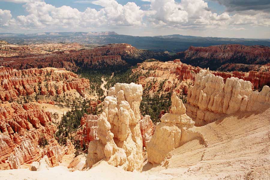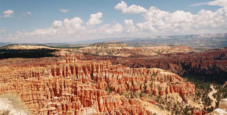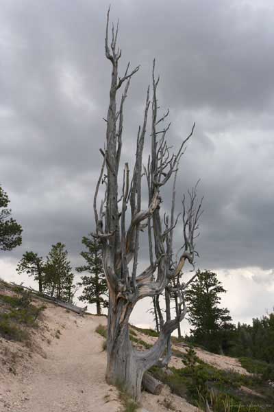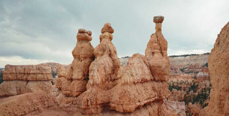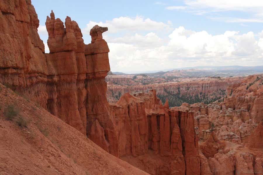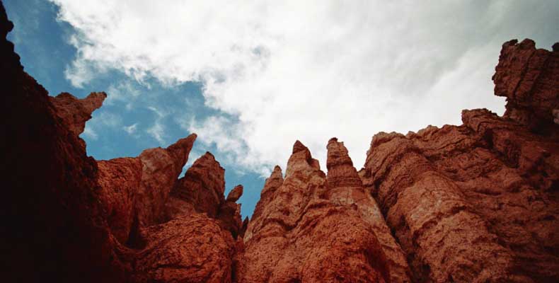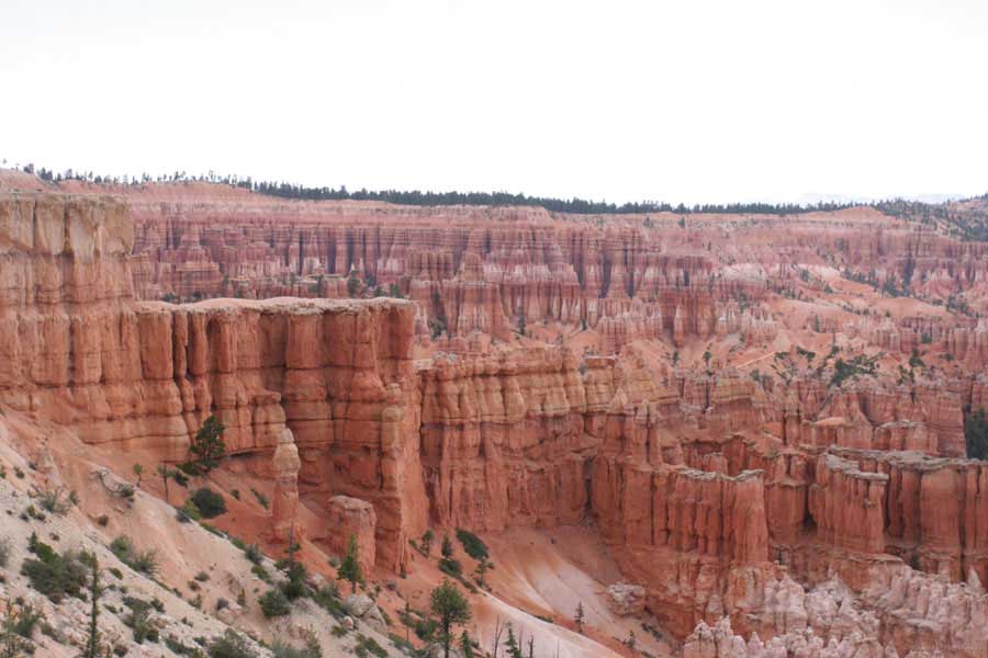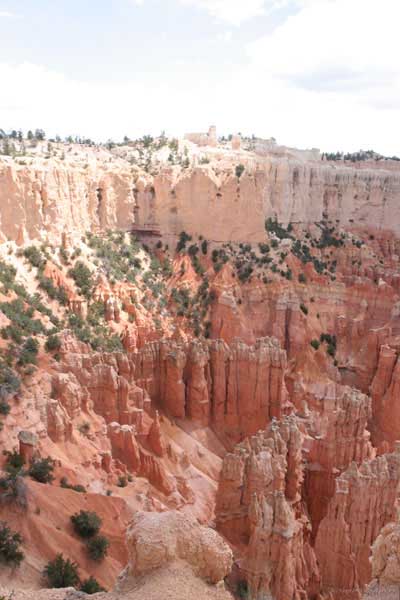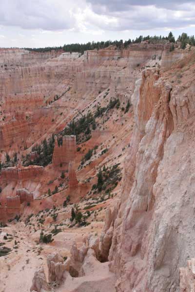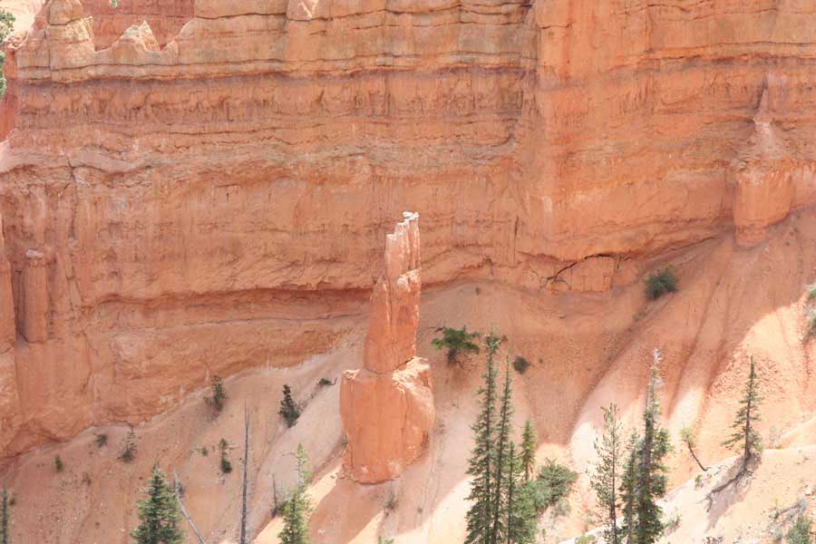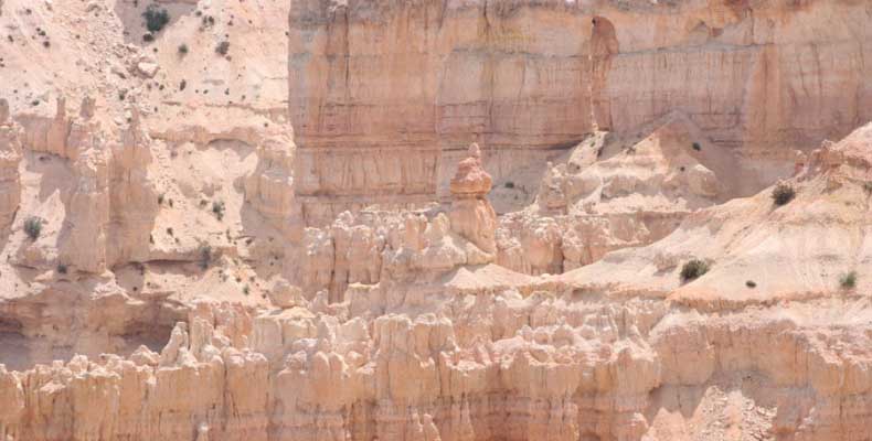 Следующее утро едем в Брайс Каньон (Bryce canyon), тоже молодой. До него миль 80. По дороге встречается Red canyon (красный). Все сразу из машин вылазят, фотографируют, но это лишнее. После Брайс на обратном пути вас уже там ничего не привлечет. Сразу скажу, что те панорамы, которые я помню из финала "Золото Макенны", я в Брайсе не увидел. Надо еще раз посмотреть фильм. Может, там что-то другое снимали. Но панорамы каньона действительно необычны. Причем сверху смотрится лучше. В Брайс, пройдя немного по краю и поснимав, я бросился вниз. Везде написано, по нему пройти от точки до точки надо 4-5 часов. Это, конечно, вранье. Не сильно напрягаясь, за два с половиной часа пройдете от Bryce point до Sunrise point, т.е. по всему низу.