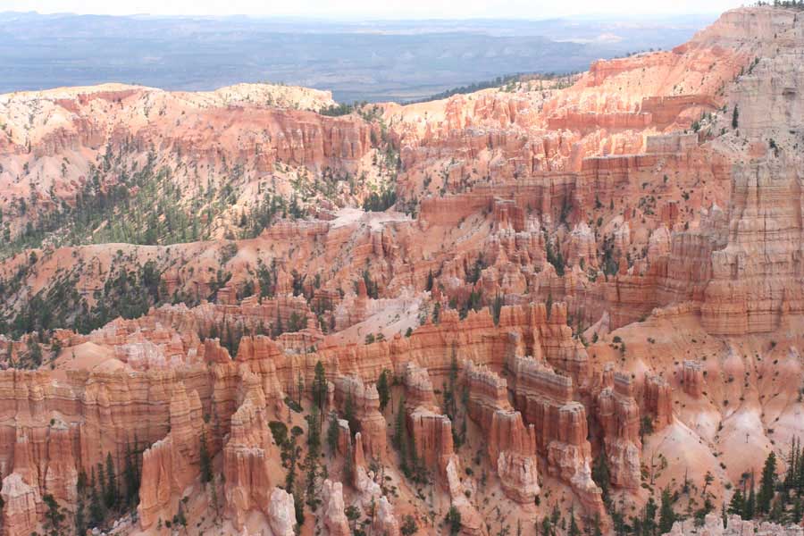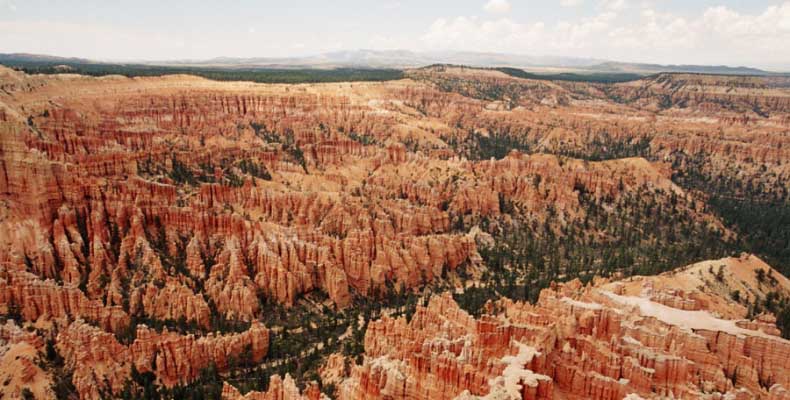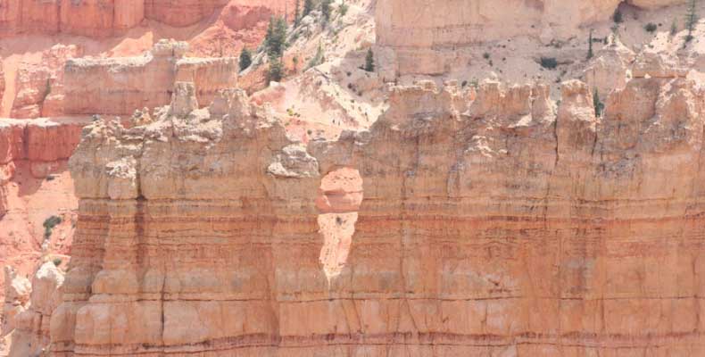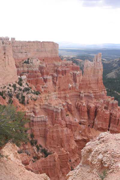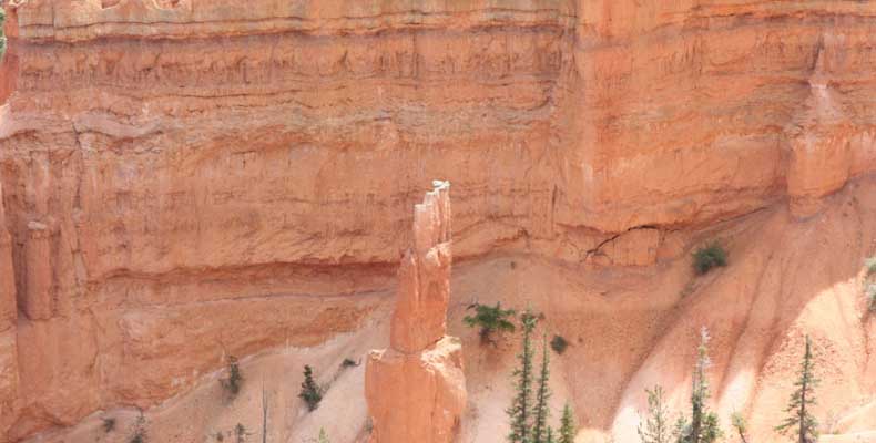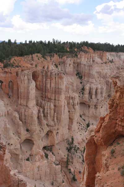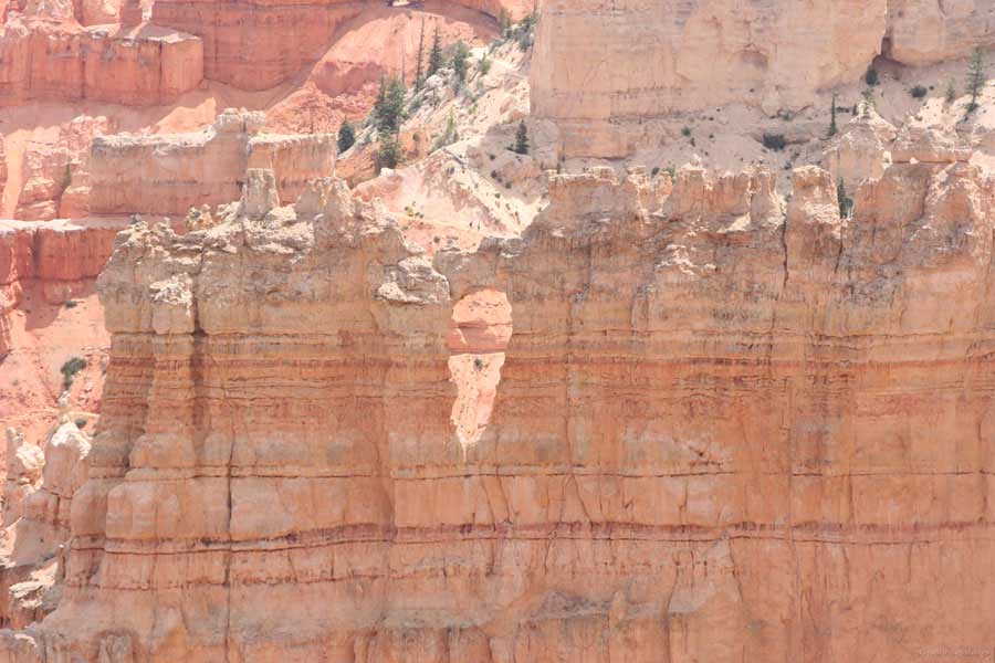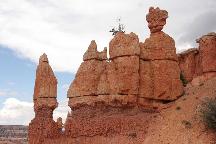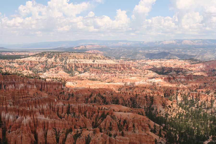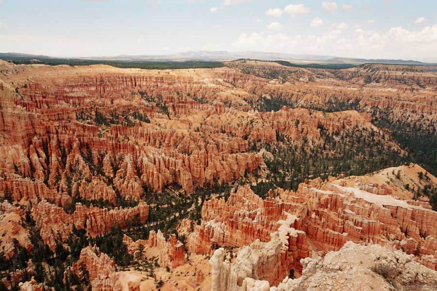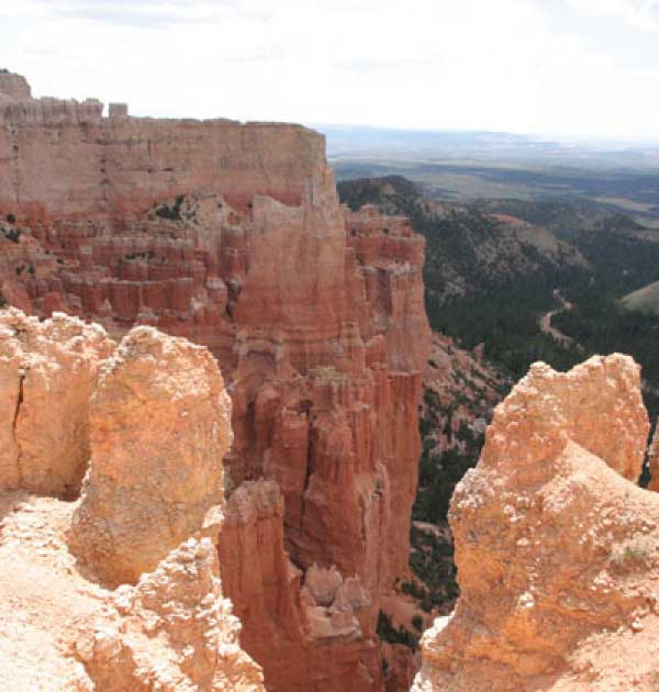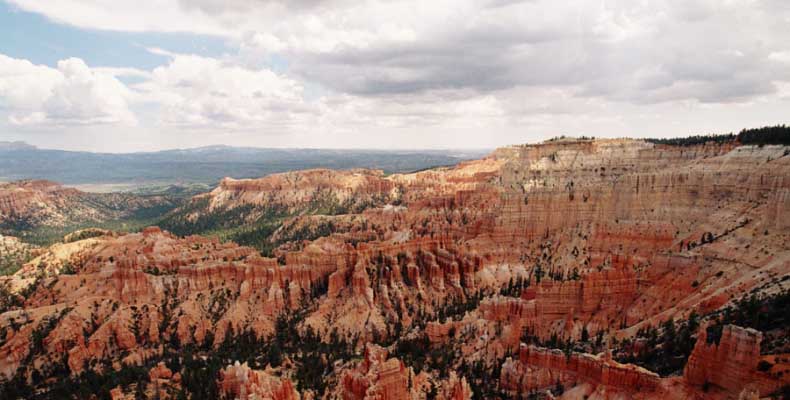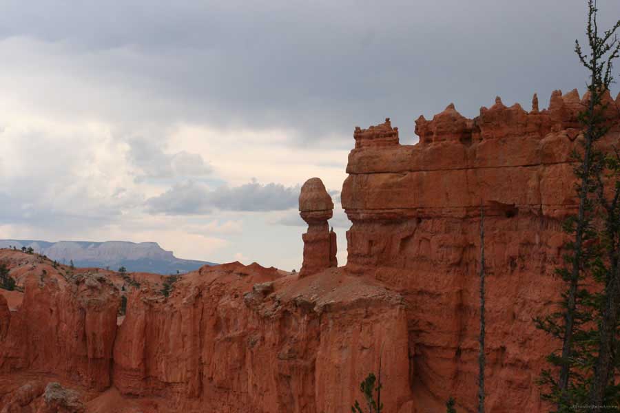 Следующее утро едем в Брайс Каньон (Bryce canyon), тоже молодой. До него миль 80. По дороге встречается Red canyon (красный). Все сразу из машин вылазят, фотографируют, но это лишнее. После Брайс на обратном пути вас уже там ничего не привлечет. Сразу скажу, что те панорамы, которые я помню из финала "Золото Макенны", я в Брайсе не увидел. Надо еще раз посмотреть фильм. Может, там что-то другое снимали. Но панорамы каньона действительно необычны. Причем сверху смотрится лучше. В Брайс, пройдя немного по краю и поснимав, я бросился вниз. Везде написано, по нему пройти от точки до точки надо 4-5 часов. Это, конечно, вранье. Не сильно напрягаясь, за два с половиной часа пройдете от Bryce point до Sunrise point, т.е. по всему низу.