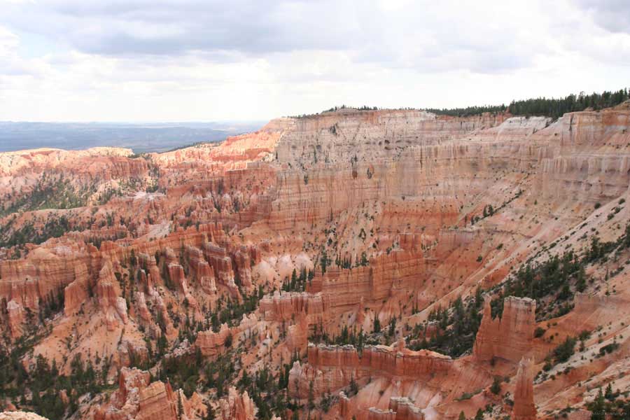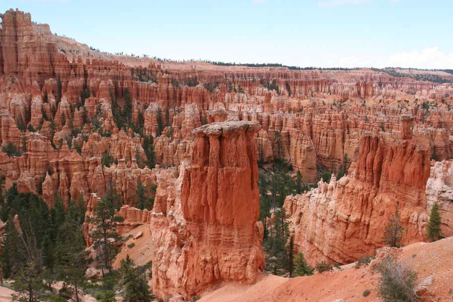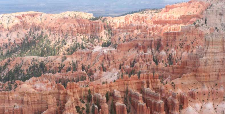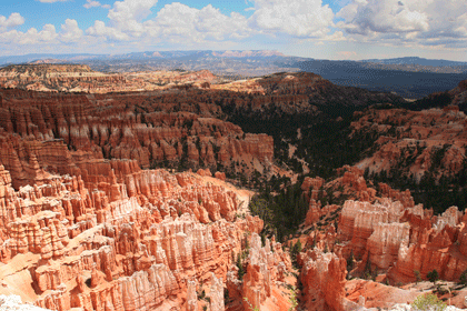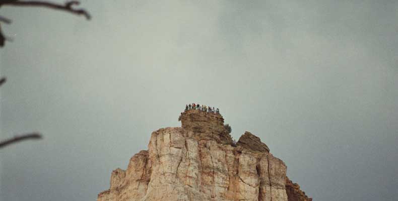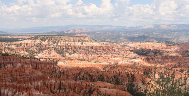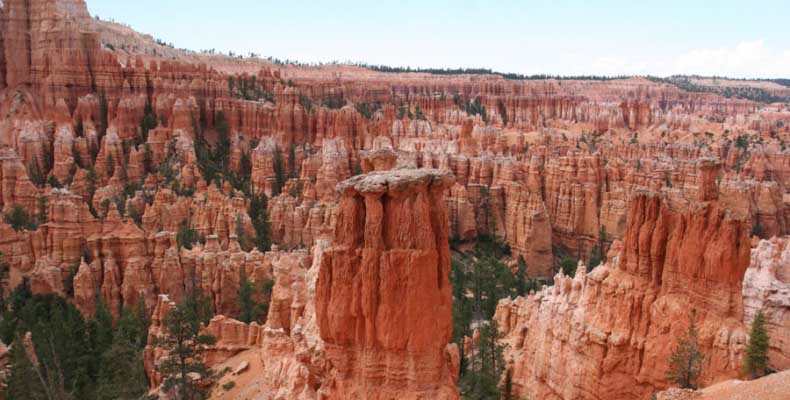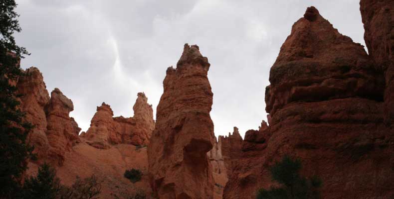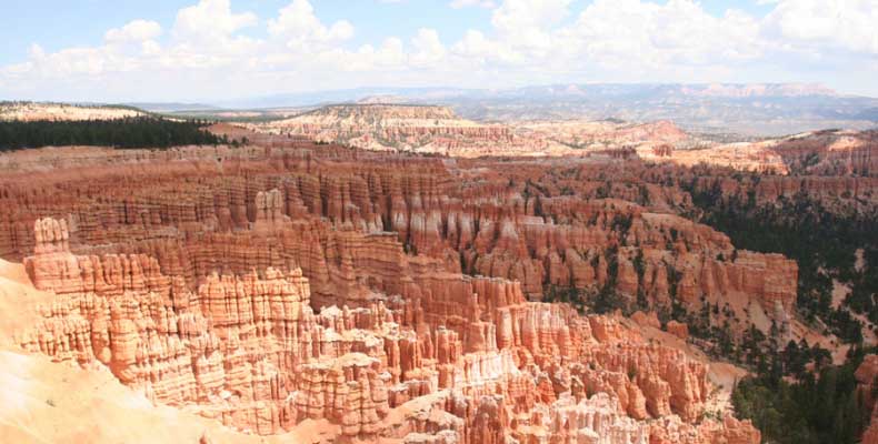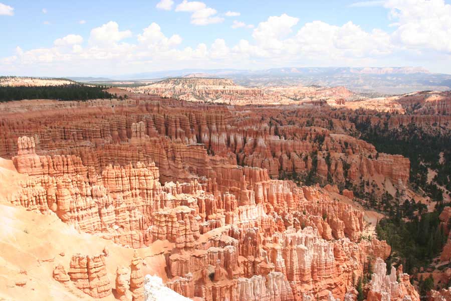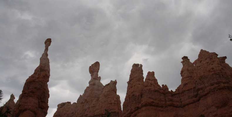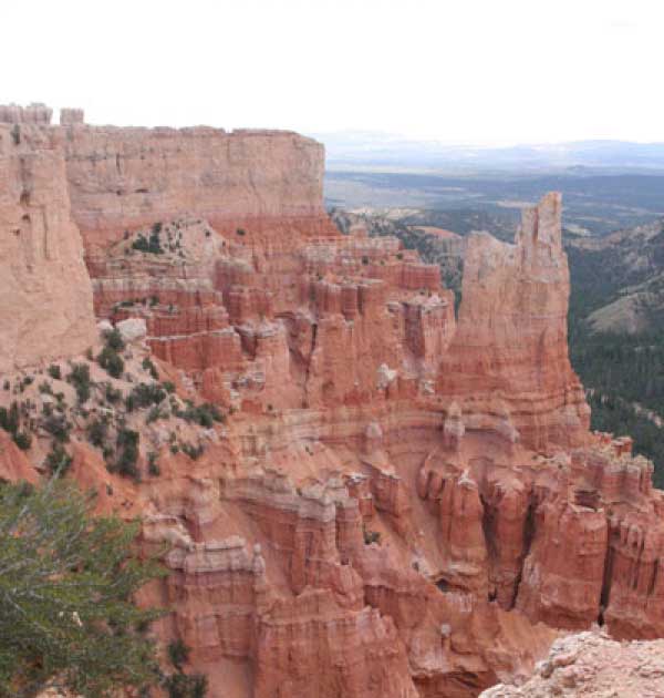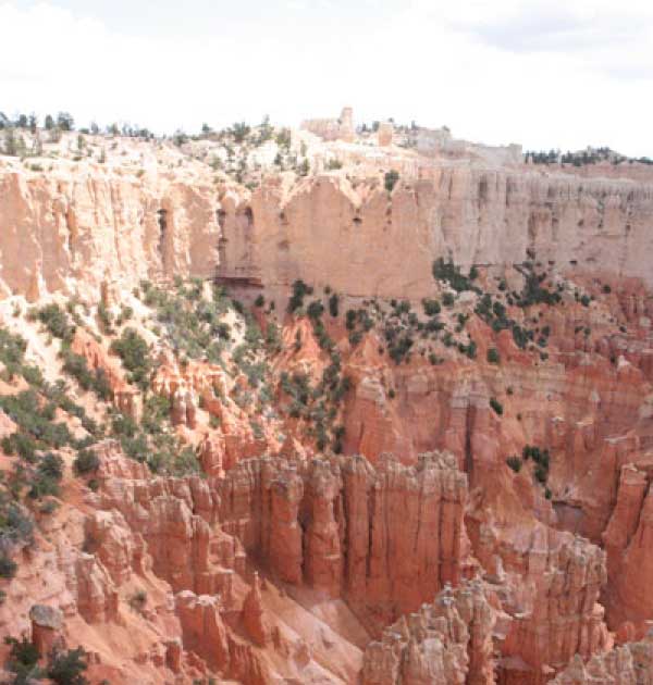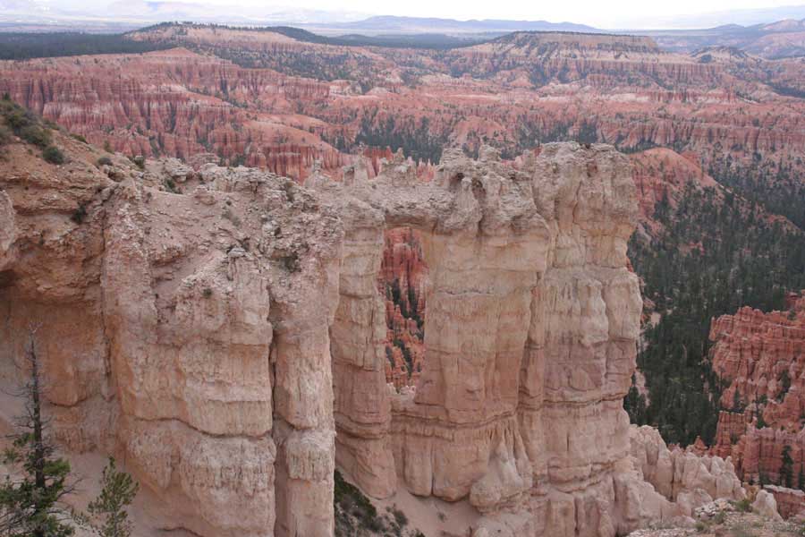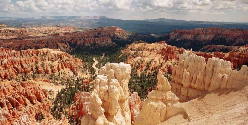 Следующее утро едем в Брайс Каньон (Bryce canyon), тоже молодой. До него миль 80. По дороге встречается Red canyon (красный). Все сразу из машин вылазят, фотографируют, но это лишнее. После Брайс на обратном пути вас уже там ничего не привлечет. Сразу скажу, что те панорамы, которые я помню из финала "Золото Макенны", я в Брайсе не увидел. Надо еще раз посмотреть фильм. Может, там что-то другое снимали. Но панорамы каньона действительно необычны. Причем сверху смотрится лучше. В Брайс, пройдя немного по краю и поснимав, я бросился вниз. Везде написано, по нему пройти от точки до точки надо 4-5 часов. Это, конечно, вранье. Не сильно напрягаясь, за два с половиной часа пройдете от Bryce point до Sunrise point, т.е. по всему низу.
