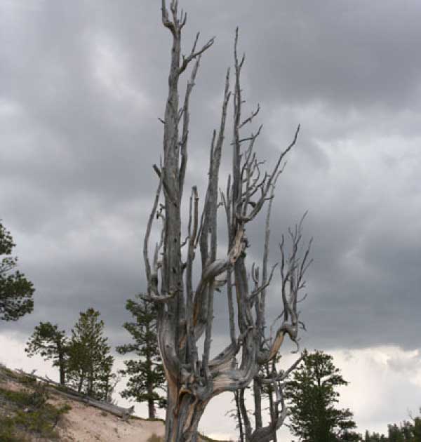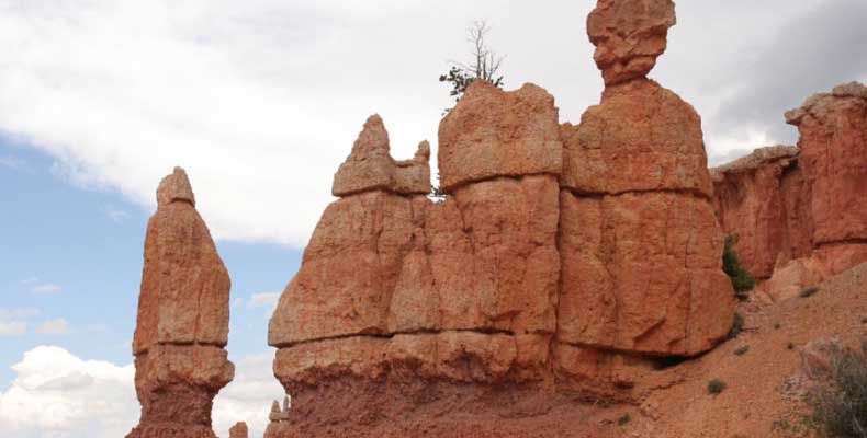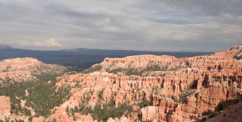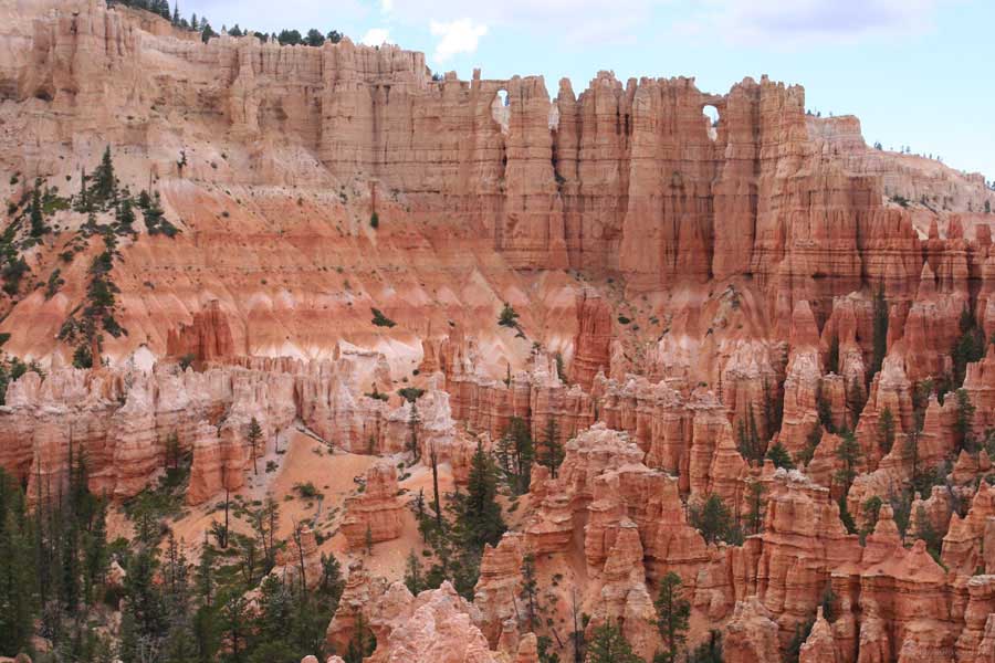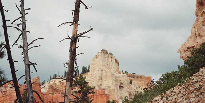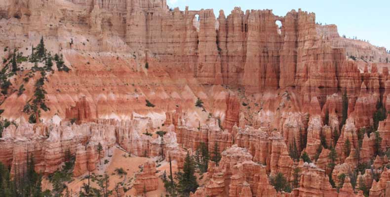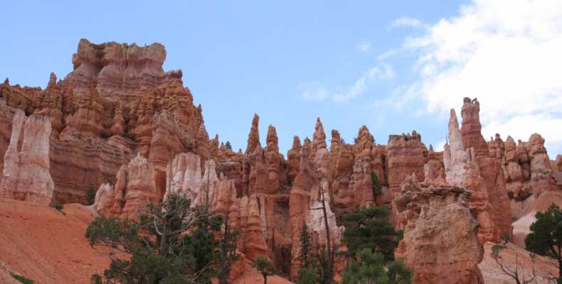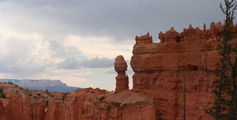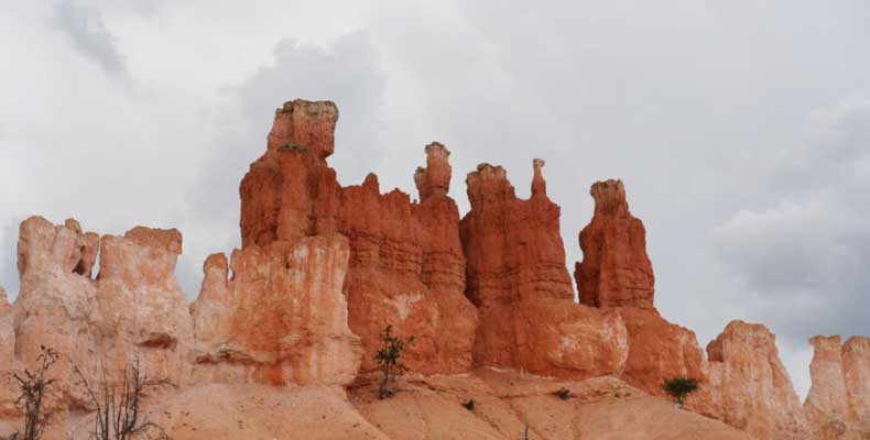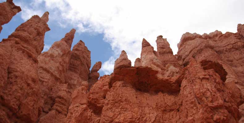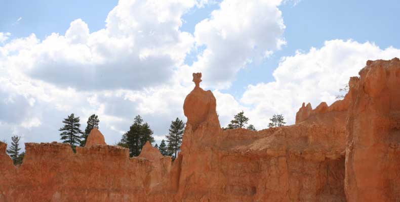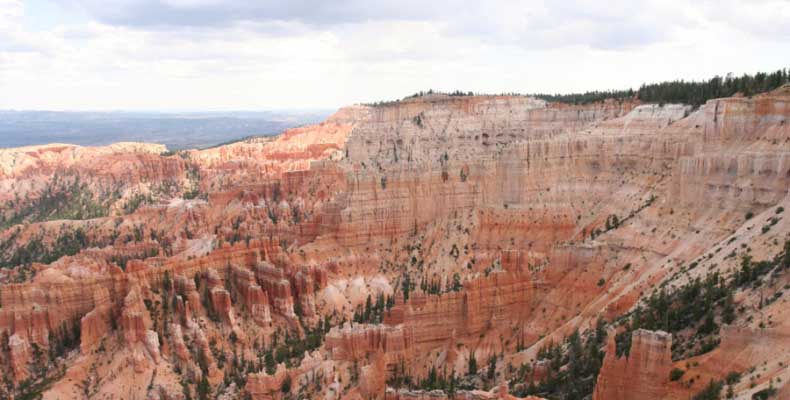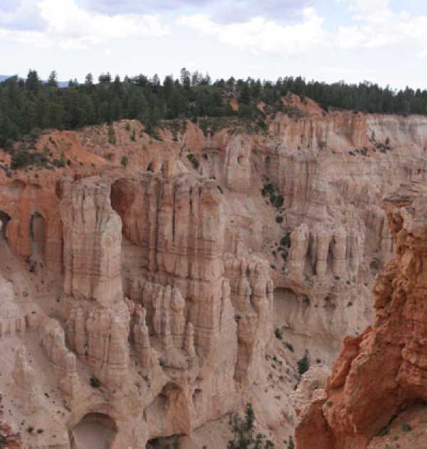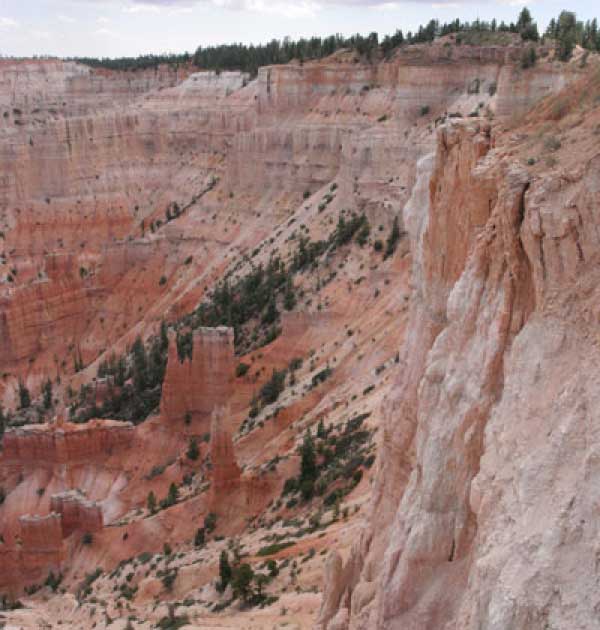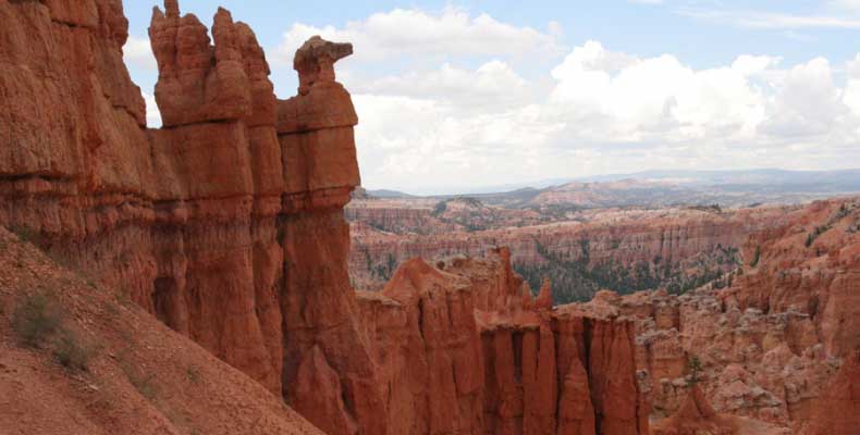 Следующее утро едем в Брайс Каньон (Bryce canyon), тоже молодой. До него миль 80. По дороге встречается Red canyon (красный). Все сразу из машин вылазят, фотографируют, но это лишнее. После Брайс на обратном пути вас уже там ничего не привлечет. Сразу скажу, что те панорамы, которые я помню из финала "Золото Макенны", я в Брайсе не увидел. Надо еще раз посмотреть фильм. Может, там что-то другое снимали. Но панорамы каньона действительно необычны. Причем сверху смотрится лучше. В Брайс, пройдя немного по краю и поснимав, я бросился вниз. Везде написано, по нему пройти от точки до точки надо 4-5 часов. Это, конечно, вранье. Не сильно напрягаясь, за два с половиной часа пройдете от Bryce point до Sunrise point, т.е. по всему низу.
