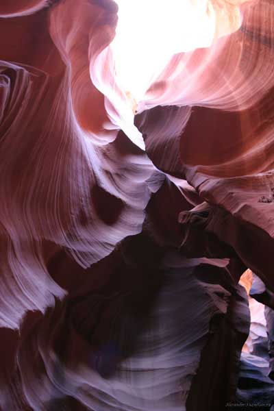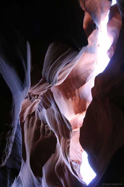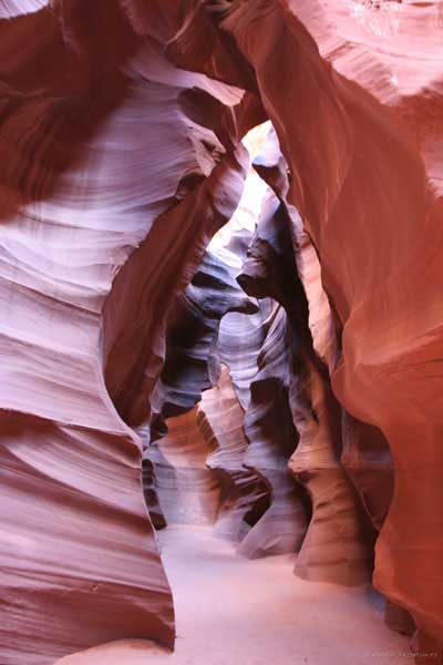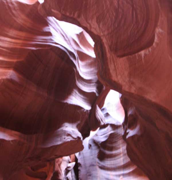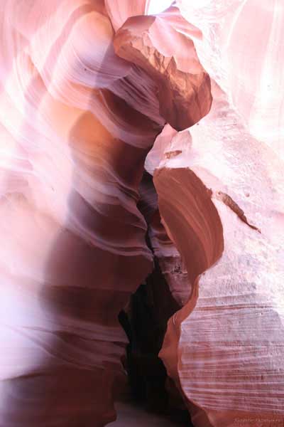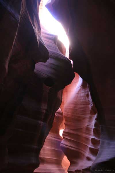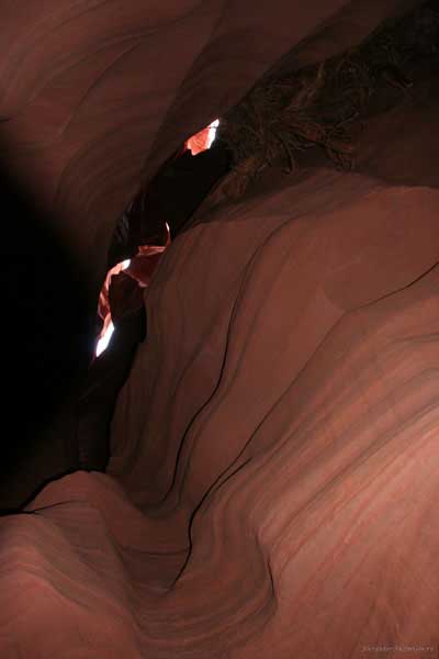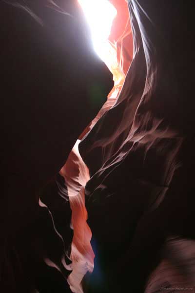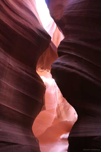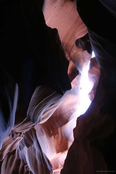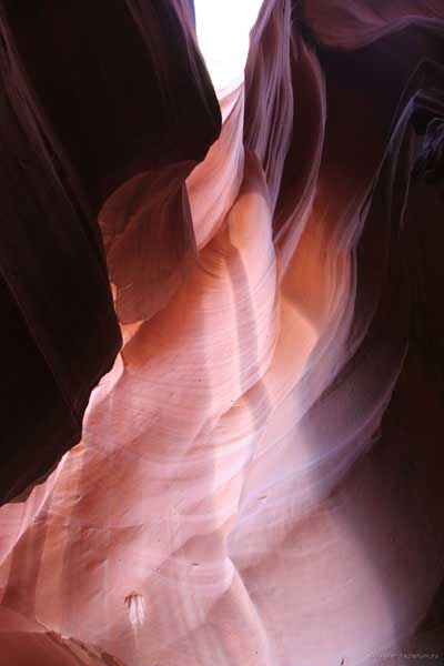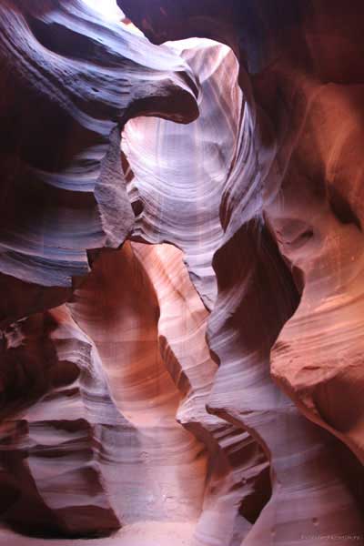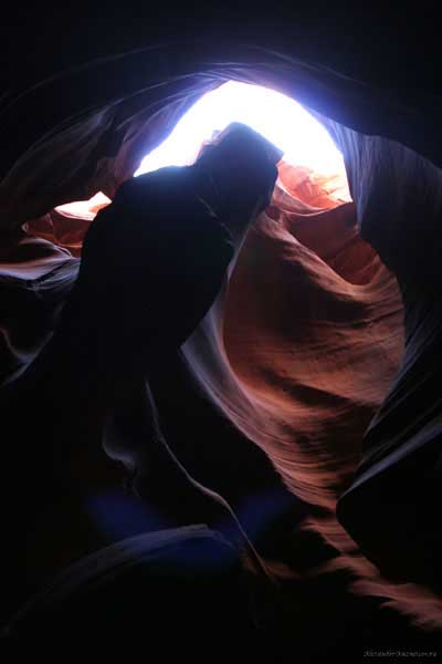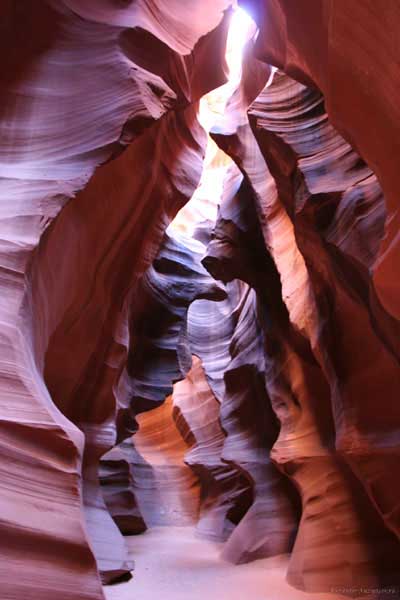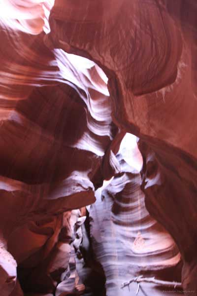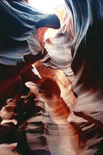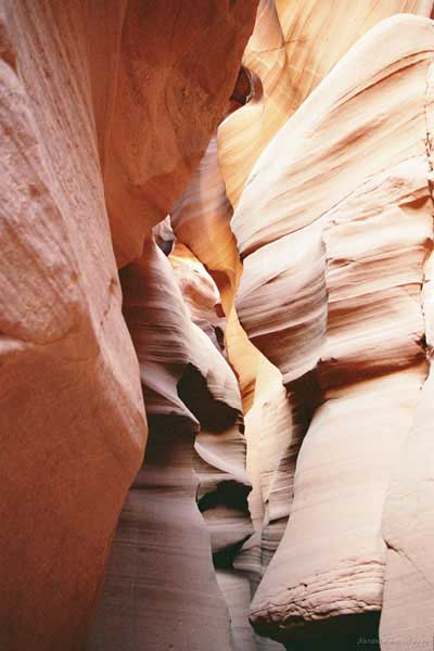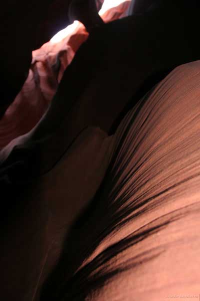 Девушка-навахо у шлагбаума сказала, что без экскурсии нельзя, езжайте обратно, ищите гида. Дала телефоны агентств (штук 6) и сказала, что через минут 20 они закрываются. Доехал до ближайшей бензоколонки и стал звонить, но все агентсва отказали. Сказали: давай завтра утром. Сначала, правда, хотели баксов 100 взять, но потом все равно отказали. Но не бросать же это дело так просто... И потом, что-то родное почудилось в индейцах у каньона... Короче, вернувшись к каньонам, обнаружил, что девушки у шлагбаума уже нет, но большая индейская семья еще толпится у экскурсионных грузовичков. Вступил в недолгие переговоры с пожилым папашей. После волшебного слова "кэш" все быстро пошло на лад. Правда, для солидности попросили обойти сарай с другой стороны, где было окошко. И в этом окошке здоровенная смуглая индианка взяла 30 баксов. После чего поехали в кузове грузовика вместе с двумя пареньками лет по 16-18 с километра полтора по песчаному, абсолютно сухому руслу. Ко входу в каньон. Теперь о каньонах Антилопы. Их два верхний, в котором мы были, и нижний - с другой стороны дороги. Эти каньоны не похожи на предыдущие. Это просто песчаное русло реки, но в этом месте, видимо, песок тверже и река не размыла это место, но образовала причудливой формы щель. Иногда при сильных потоках вода поднимается до самого верха. Так было в 2002, а в каком-то 80-м даже двое погибли. Но в основном русло сухое и все туда ездят на экскурсии. Зрелище фантастическое. Глубина каньона метров 15-20, вы идете по низу, и солнце вместе с песком образуют причудливые образы. Раньше я читал про специальную фотографическую экскурсию в каньон. Действительно, надо идти туда ближе к полудню, когда солнце в зените и пробивается острыми лучами внутрь, надо использовать штатив, специальную пленку и т.д. Все это вы можете посмотреть на сайте www.antelopecanyon.com и в журналах. Я же просто фотографировал наугад, под вечер и все равно вот что получилось. Сама экскурсия дурацкая. Ребята показывали какие-то профили на стенах. Часть из этих персонажей я не знаю, часть не понял, остальных не увидел. Фантазии видимо не хватило. Тем более, что после следующего дождя, я думаю, все поменяется. Сам каньон полмили длиной всего.