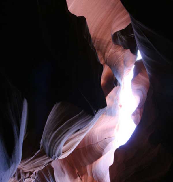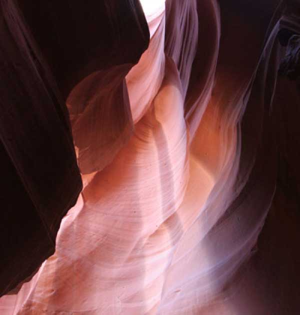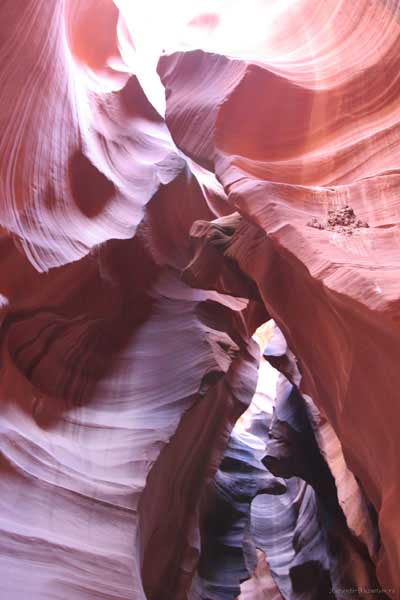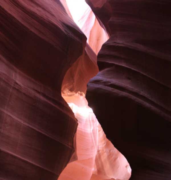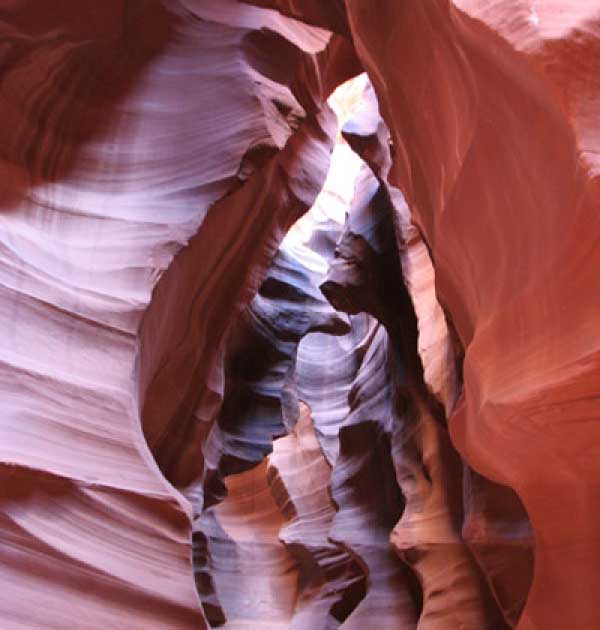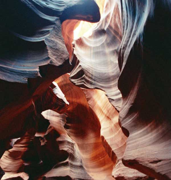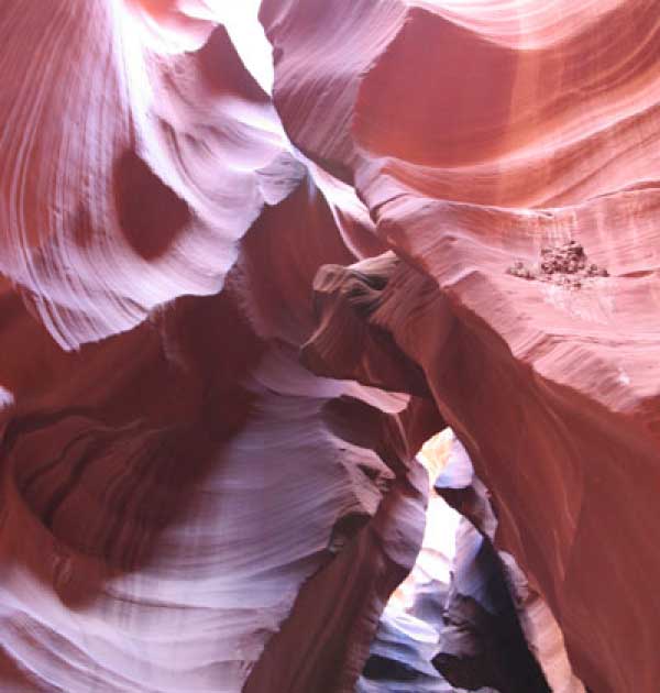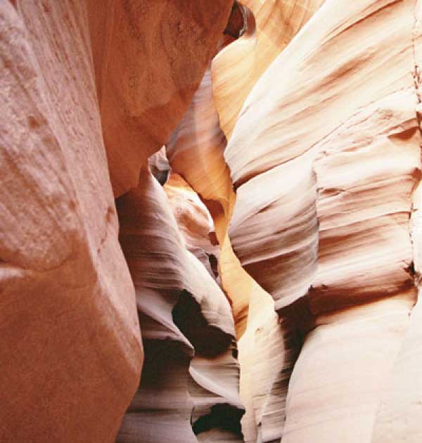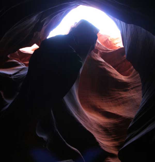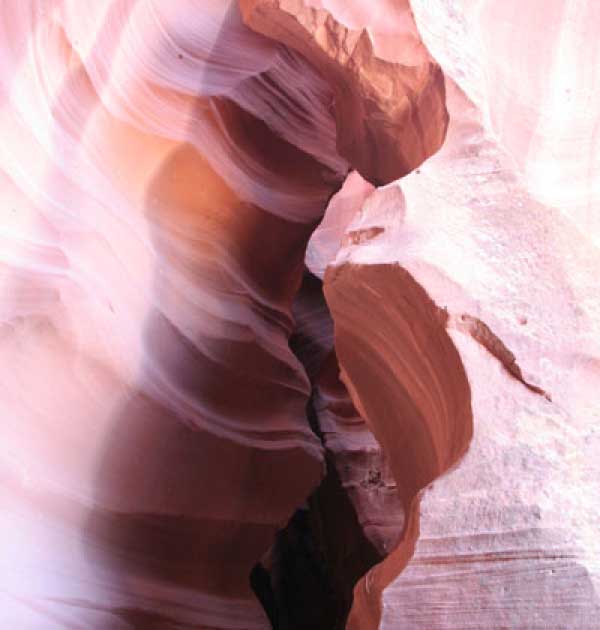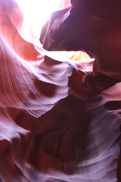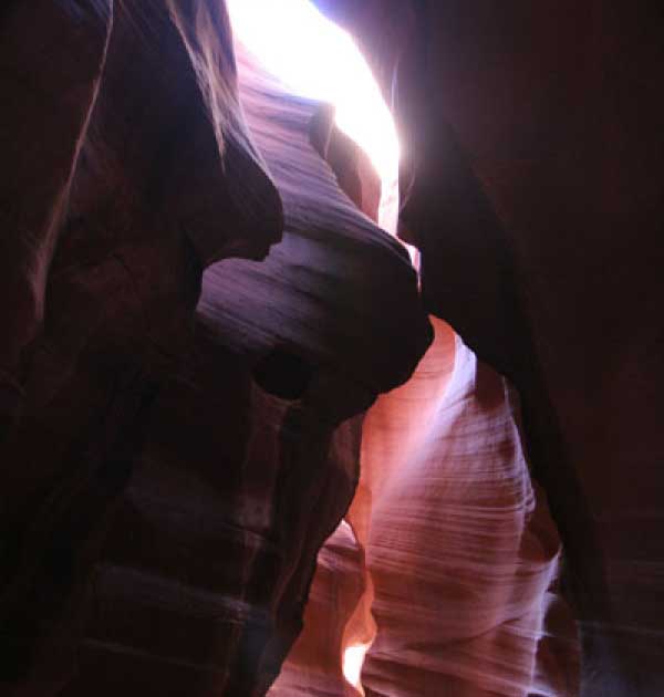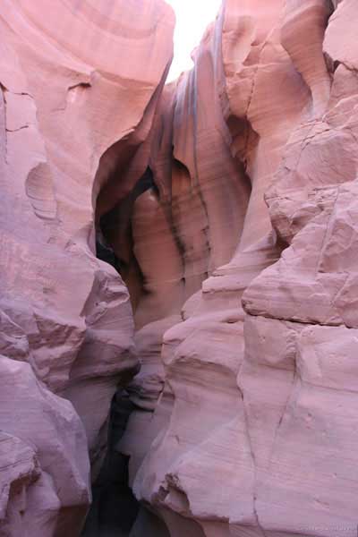Девушка-навахо у шлагбаума сказала, что без экскурсии нельзя, езжайте обратно, ищите гида. Дала телефоны агентств (штук 6) и сказала, что через минут 20 они закрываются. Доехал до ближайшей бензоколонки и стал звонить, но все агентсва отказали. Сказали: давай завтра утром. Сначала, правда, хотели баксов 100 взять, но потом все равно отказали. Но не бросать же это дело так просто... И потом, что-то родное почудилось в индейцах у каньона... Короче, вернувшись к каньонам, обнаружил, что девушки у шлагбаума уже нет, но большая индейская семья еще толпится у экскурсионных грузовичков. Вступил в недолгие переговоры с пожилым папашей. После волшебного слова "кэш" все быстро пошло на лад. Правда, для солидности попросили обойти сарай с другой стороны, где было окошко. И в этом окошке здоровенная смуглая индианка взяла 30 баксов. После чего поехали в кузове грузовика вместе с двумя пареньками лет по 16-18 с километра полтора по песчаному, абсолютно сухому руслу. Ко входу в каньон. Теперь о каньонах Антилопы. Их два верхний, в котором мы были, и нижний - с другой стороны дороги. Эти каньоны не похожи на предыдущие. Это просто песчаное русло реки, но в этом месте, видимо, песок тверже и река не размыла это место, но образовала причудливой формы щель. Иногда при сильных потоках вода поднимается до самого верха. Так было в 2002, а в каком-то 80-м даже двое погибли. Но в основном русло сухое и все туда ездят на экскурсии. Зрелище фантастическое. Глубина каньона метров 15-20, вы идете по низу, и солнце вместе с песком образуют причудливые образы. Раньше я читал про специальную фотографическую экскурсию в каньон. Действительно, надо идти туда ближе к полудню, когда солнце в зените и пробивается острыми лучами внутрь, надо использовать штатив, специальную пленку и т.д. Все это вы можете посмотреть на сайте www.antelopecanyon.com и в журналах. Я же просто фотографировал наугад, под вечер и все равно вот что получилось. Сама экскурсия дурацкая. Ребята показывали какие-то профили на стенах. Часть из этих персонажей я не знаю, часть не понял, остальных не увидел. Фантазии видимо не хватило. Тем более, что после следующего дождя, я думаю, все поменяется. Сам каньон полмили длиной всего.