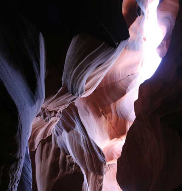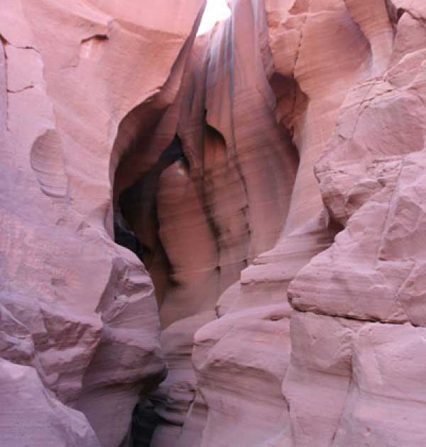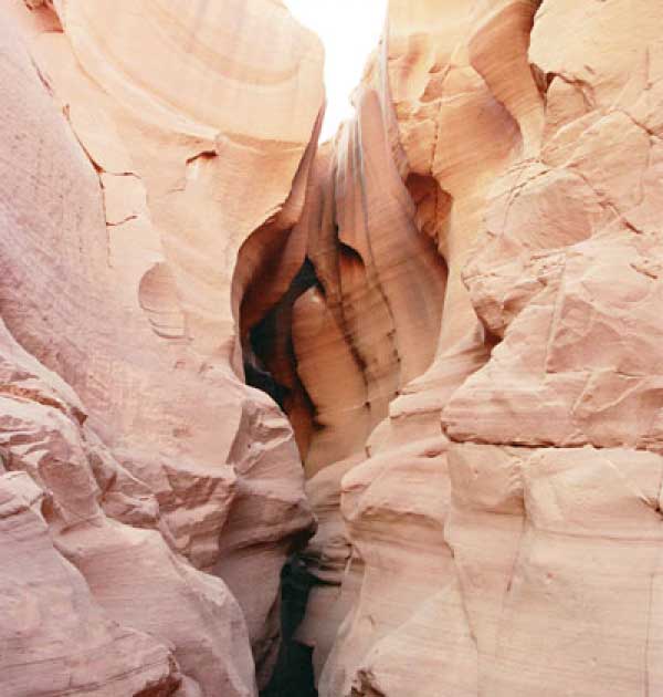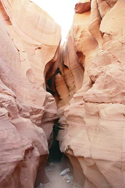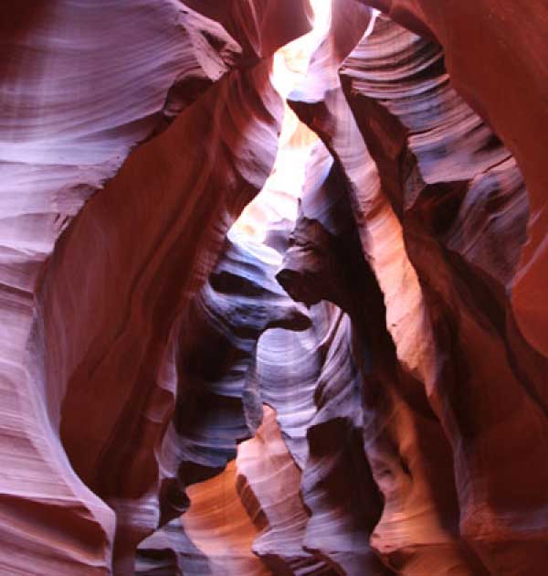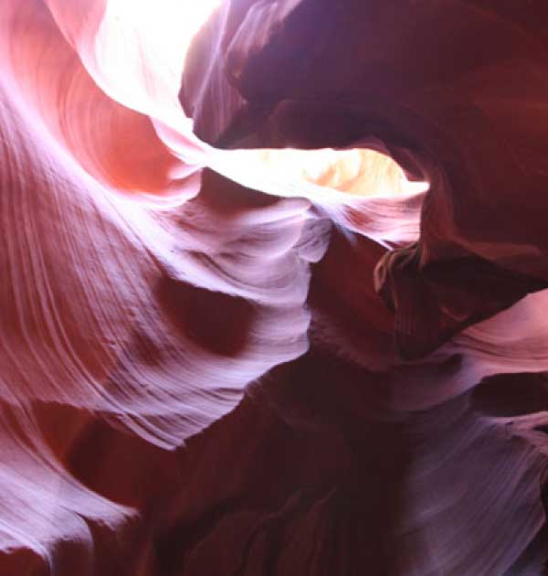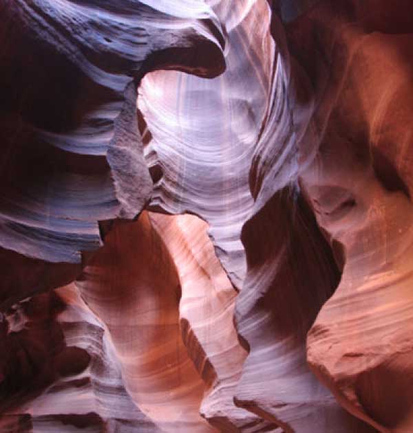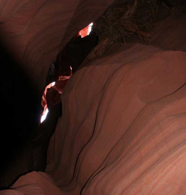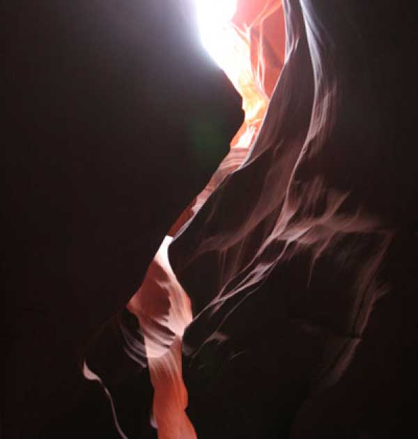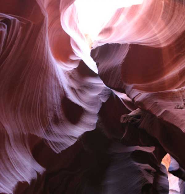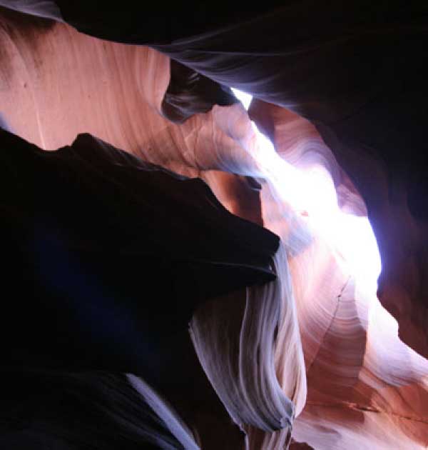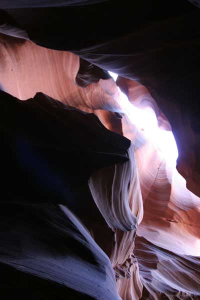 Девушка-навахо у шлагбаума сказала, что без экскурсии нельзя, езжайте обратно, ищите гида. Дала телефоны агентств (штук 6) и сказала, что через минут 20 они закрываются. Доехал до ближайшей бензоколонки и стал звонить, но все агентсва отказали. Сказали: давай завтра утром. Сначала, правда, хотели баксов 100 взять, но потом все равно отказали. Но не бросать же это дело так просто... И потом, что-то родное почудилось в индейцах у каньона... Короче, вернувшись к каньонам, обнаружил, что девушки у шлагбаума уже нет, но большая индейская семья еще толпится у экскурсионных грузовичков. Вступил в недолгие переговоры с пожилым папашей. После волшебного слова "кэш" все быстро пошло на лад. Правда, для солидности попросили обойти сарай с другой стороны, где было окошко. И в этом окошке здоровенная смуглая индианка взяла 30 баксов. После чего поехали в кузове грузовика вместе с двумя пареньками лет по 16-18 с километра полтора по песчаному, абсолютно сухому руслу. Ко входу в каньон. Теперь о каньонах Антилопы. Их два верхний, в котором мы были, и нижний - с другой стороны дороги. Эти каньоны не похожи на предыдущие. Это просто песчаное русло реки, но в этом месте, видимо, песок тверже и река не размыла это место, но образовала причудливой формы щель. Иногда при сильных потоках вода поднимается до самого верха. Так было в 2002, а в каком-то 80-м даже двое погибли. Но в основном русло сухое и все туда ездят на экскурсии. Зрелище фантастическое. Глубина каньона метров 15-20, вы идете по низу, и солнце вместе с песком образуют причудливые образы. Раньше я читал про специальную фотографическую экскурсию в каньон. Действительно, надо идти туда ближе к полудню, когда солнце в зените и пробивается острыми лучами внутрь, надо использовать штатив, специальную пленку и т.д. Все это вы можете посмотреть на сайте www.antelopecanyon.com и в журналах. Я же просто фотографировал наугад, под вечер и все равно вот что получилось. Сама экскурсия дурацкая. Ребята показывали какие-то профили на стенах. Часть из этих персонажей я не знаю, часть не понял, остальных не увидел. Фантазии видимо не хватило. Тем более, что после следующего дождя, я думаю, все поменяется. Сам каньон полмили длиной всего.