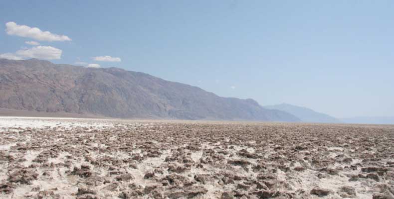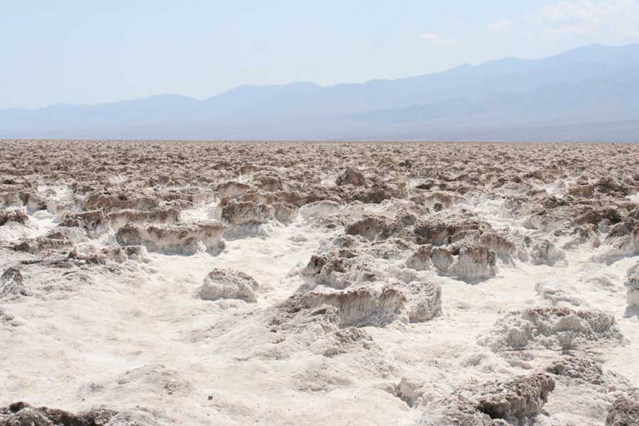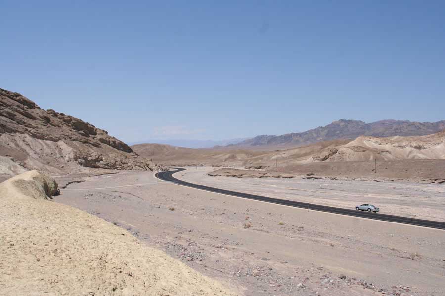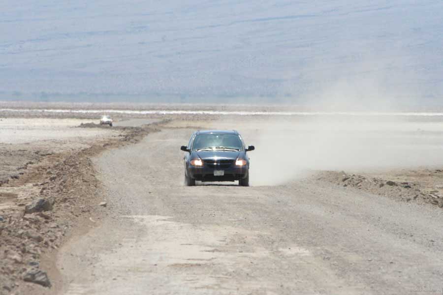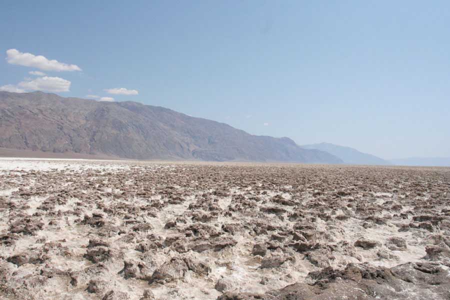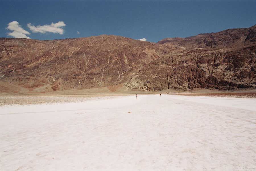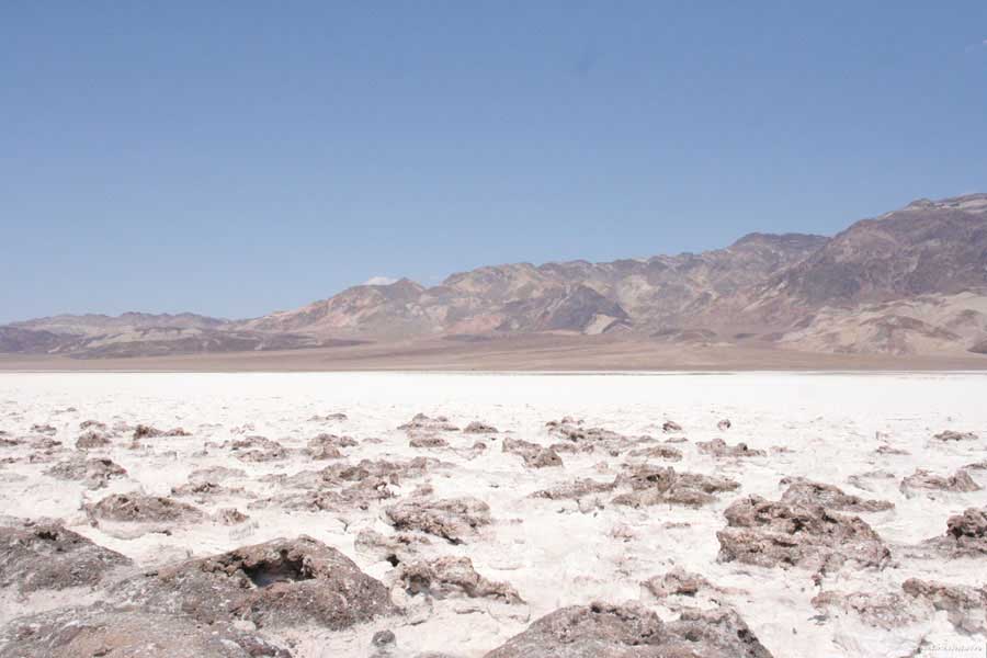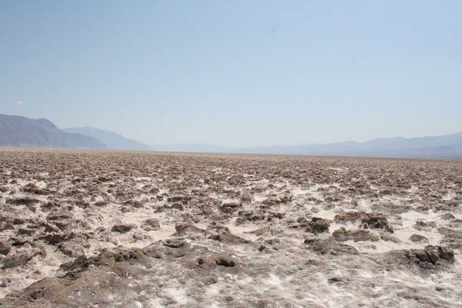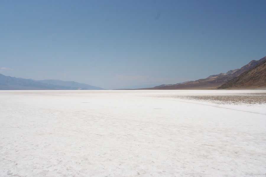 После этого, обогнув гряду, едешь около 30 миль к месту Плохая Вода "Badwater". Место знаменито тем, что это самая низкая точка Америки - 82 метра ниже уровня моря. Вода там действительно плохая. Очень соленая. И ее очень мало. Пока едешь по долине, кажется, что по краю течет река, так это не так. Не река это, соль одна. Панораму на фото видно. Обязательно сверните на Devil's golf course (дьявольский гольф). Въезжаешь на машине прямо в соль. Вот она дорога, а вот соль, такие холмики острые высотой сантиметров 30. Долина и правда похожа на смертельную, жара тяжелая, не растет почти ничего и соль эта...
