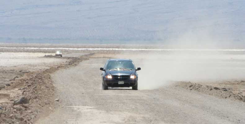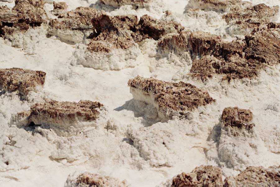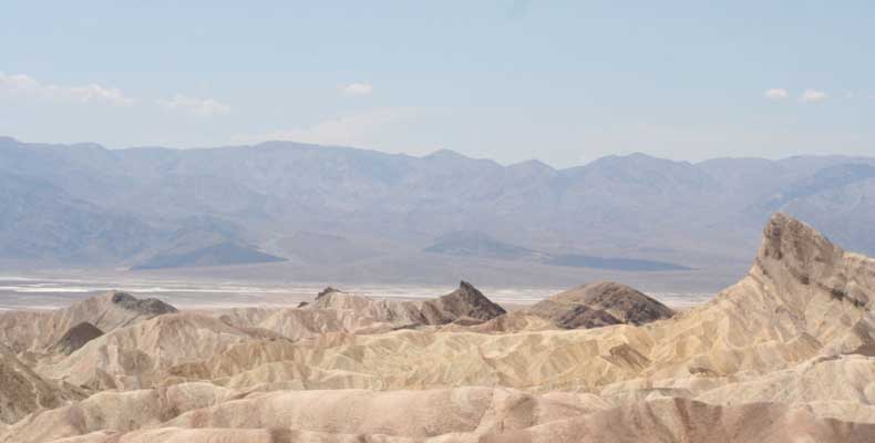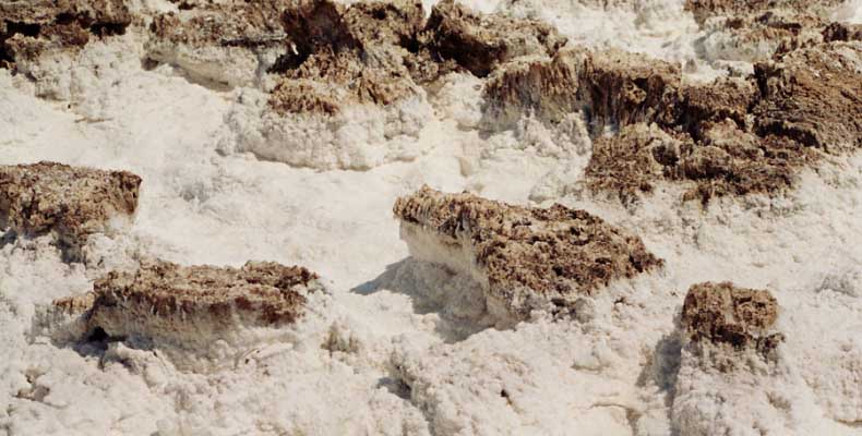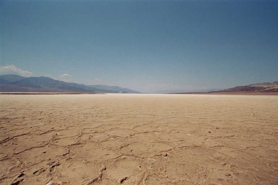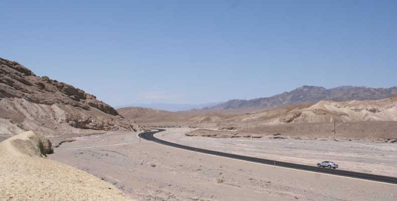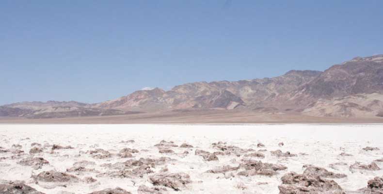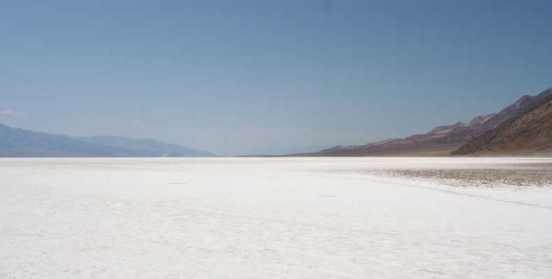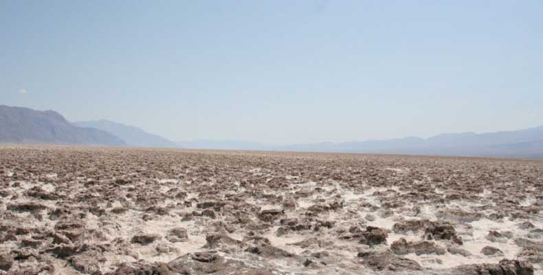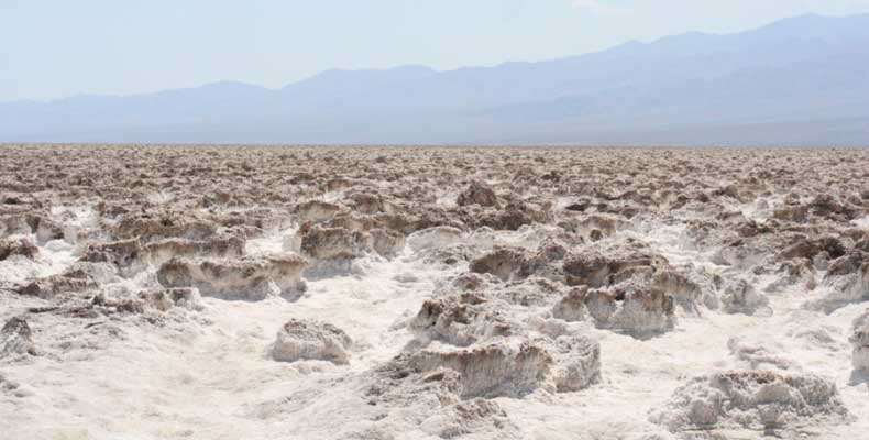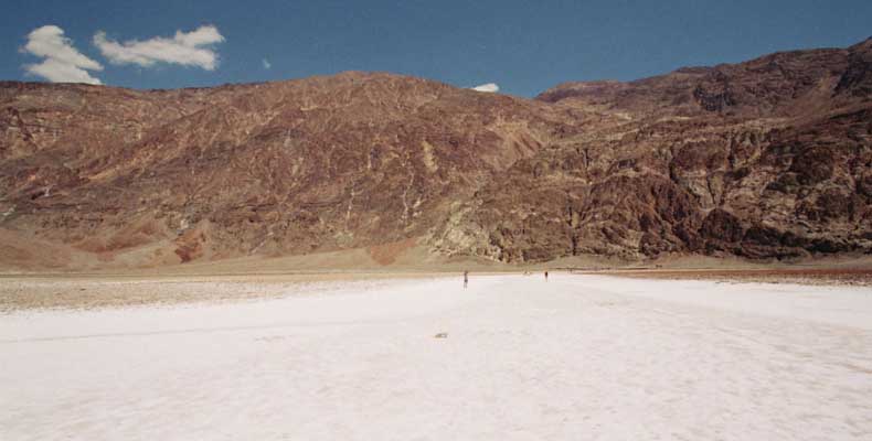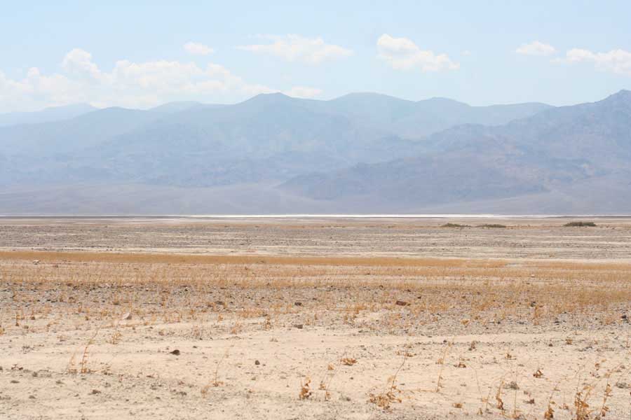 После этого, обогнув гряду, едешь около 30 миль к месту Плохая Вода "Badwater". Место знаменито тем, что это самая низкая точка Америки - 82 метра ниже уровня моря. Вода там действительно плохая. Очень соленая. И ее очень мало. Пока едешь по долине, кажется, что по краю течет река, так это не так. Не река это, соль одна. Панораму на фото видно. Обязательно сверните на Devil's golf course (дьявольский гольф). Въезжаешь на машине прямо в соль. Вот она дорога, а вот соль, такие холмики острые высотой сантиметров 30. Долина и правда похожа на смертельную, жара тяжелая, не растет почти ничего и соль эта...
