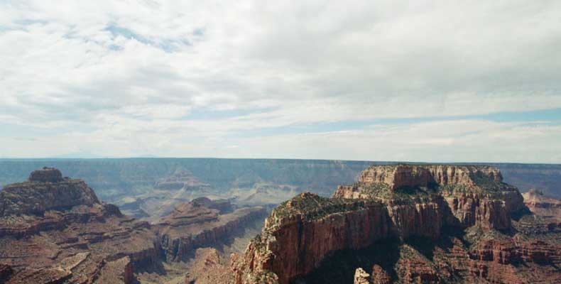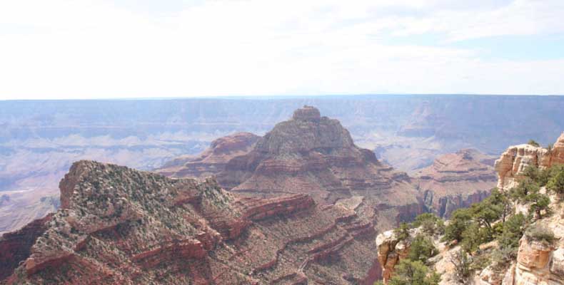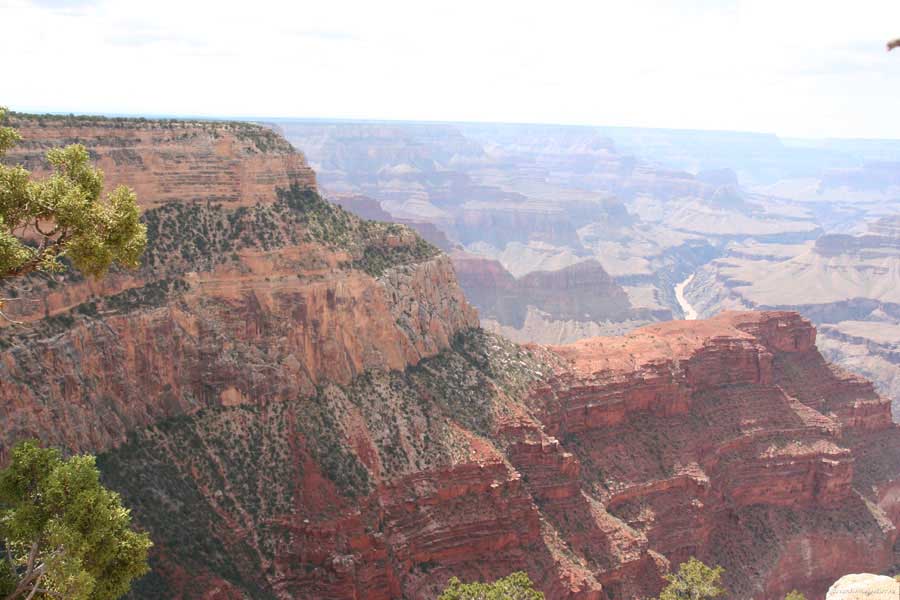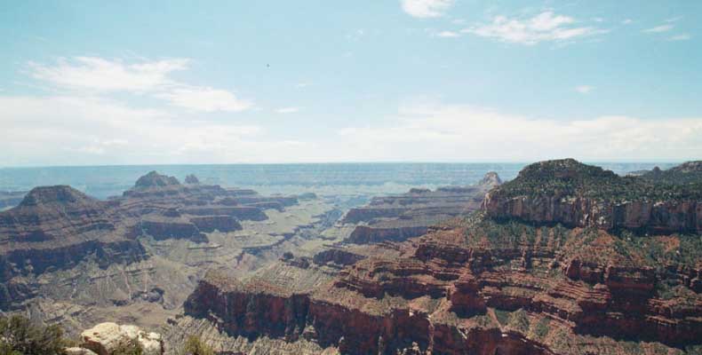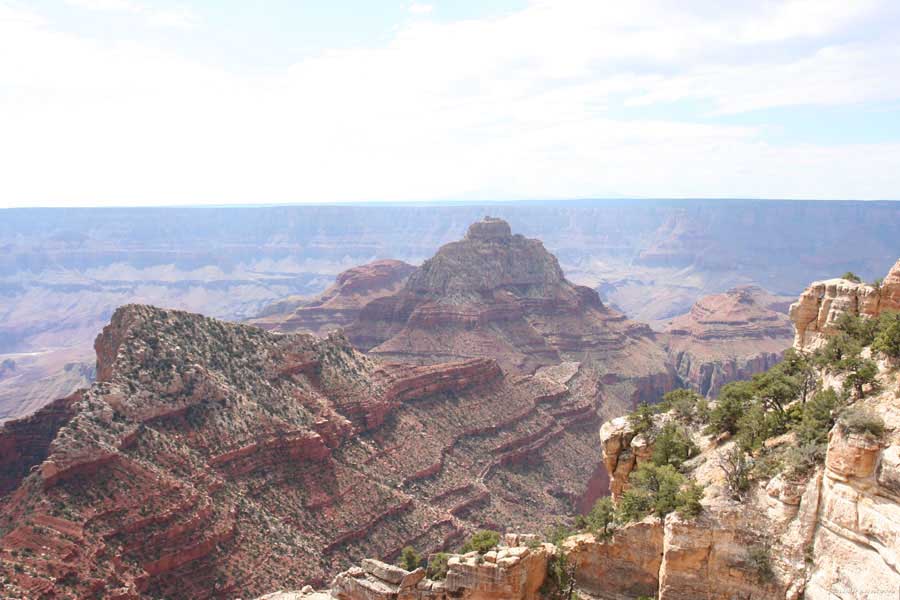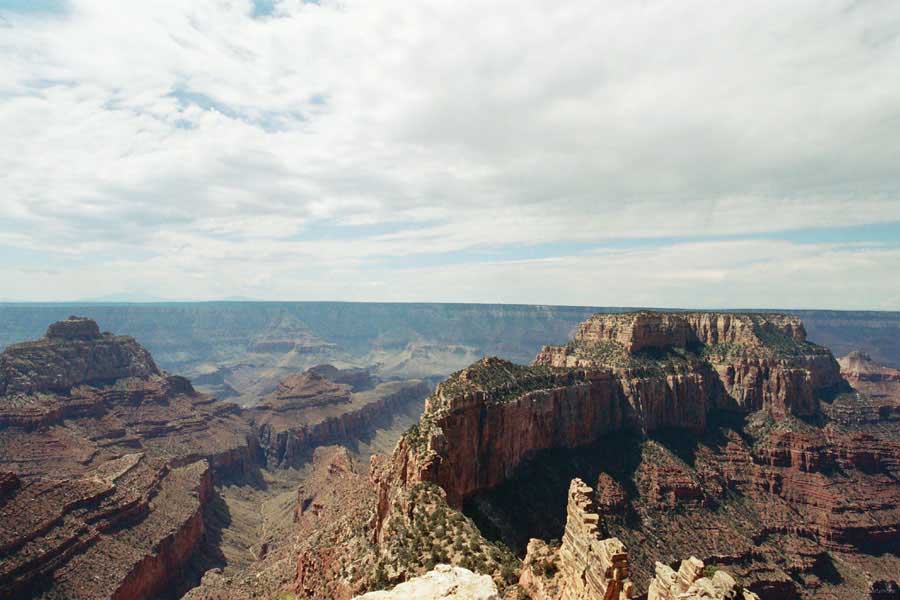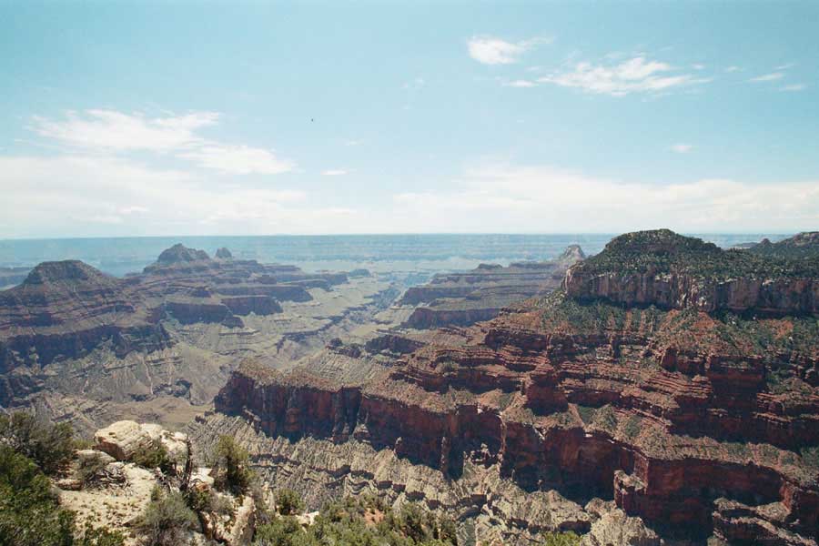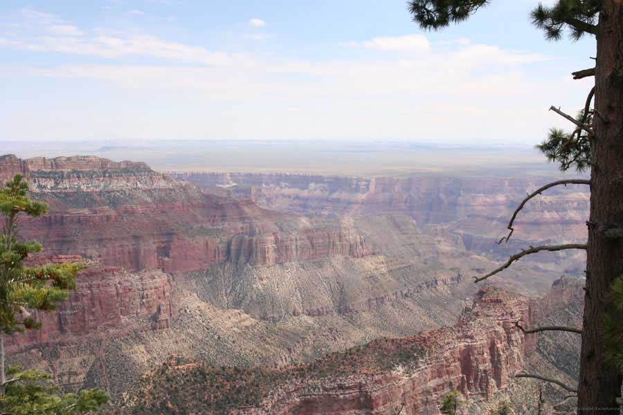 На следующий день я решил поехать на северный край (Northern Rim) Гранд-Каньона, для сравнения. Благо до него было 80 миль всего. Через час с небольшим въехали в парк. Пропускной пункт, не в пример южному, с одной полосой всего. Дорог мало, и всего три точки смотровых. Надо сказать, что северный край мне не показался. Перспективы нет, вы видите только несколько отрогов и небольшой (относительно) кусок каньона. Плюс еще какие-то мошки налетели. Правда, подозреваю, что просто уже панорамы каньонов немного приелись...