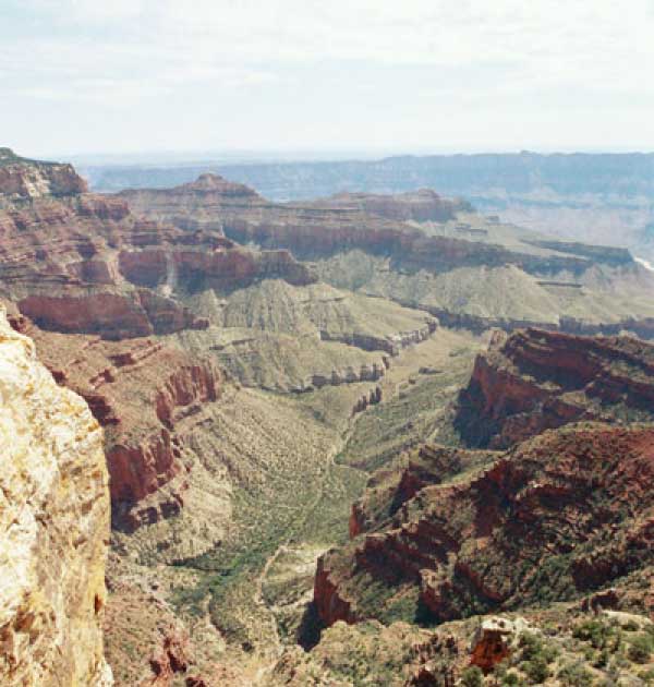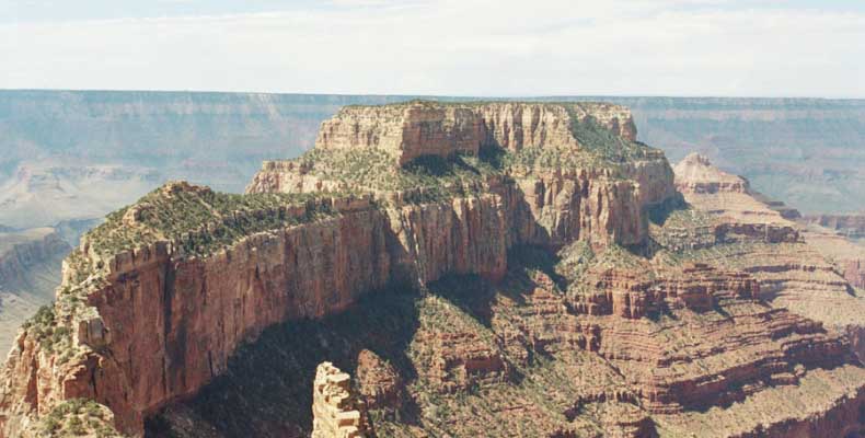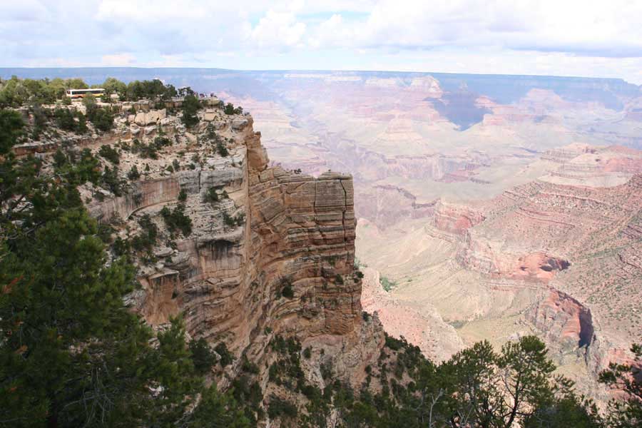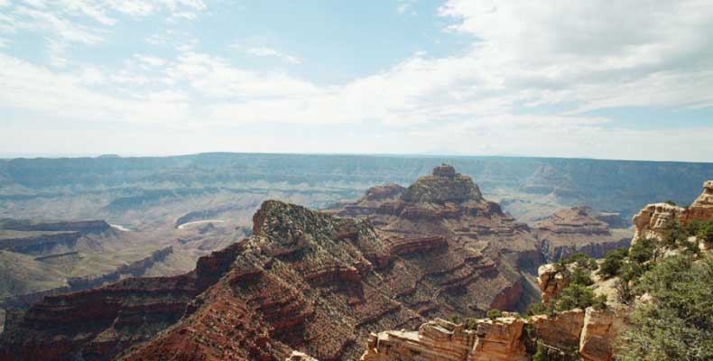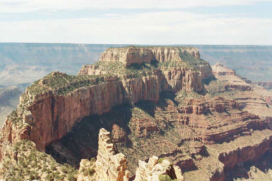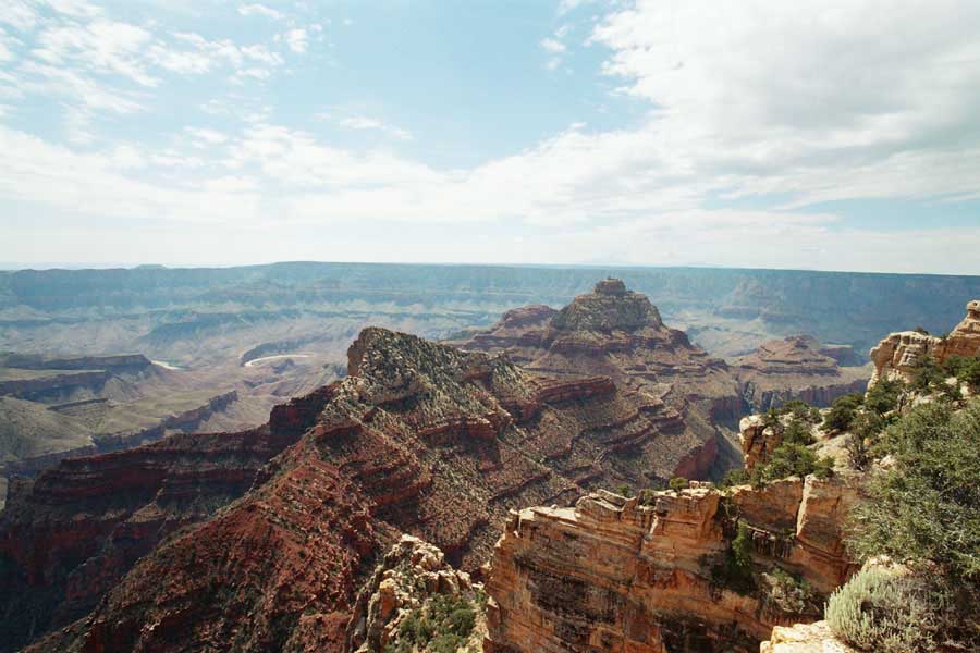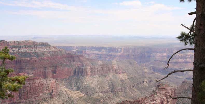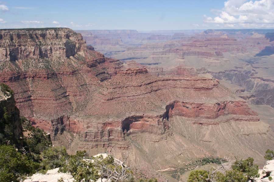 На следующий день я решил поехать на северный край (Northern Rim) Гранд-Каньона, для сравнения. Благо до него было 80 миль всего. Через час с небольшим въехали в парк. Пропускной пункт, не в пример южному, с одной полосой всего. Дорог мало, и всего три точки смотровых. Надо сказать, что северный край мне не показался. Перспективы нет, вы видите только несколько отрогов и небольшой (относительно) кусок каньона. Плюс еще какие-то мошки налетели. Правда, подозреваю, что просто уже панорамы каньонов немного приелись...