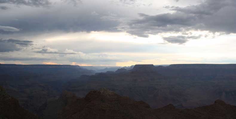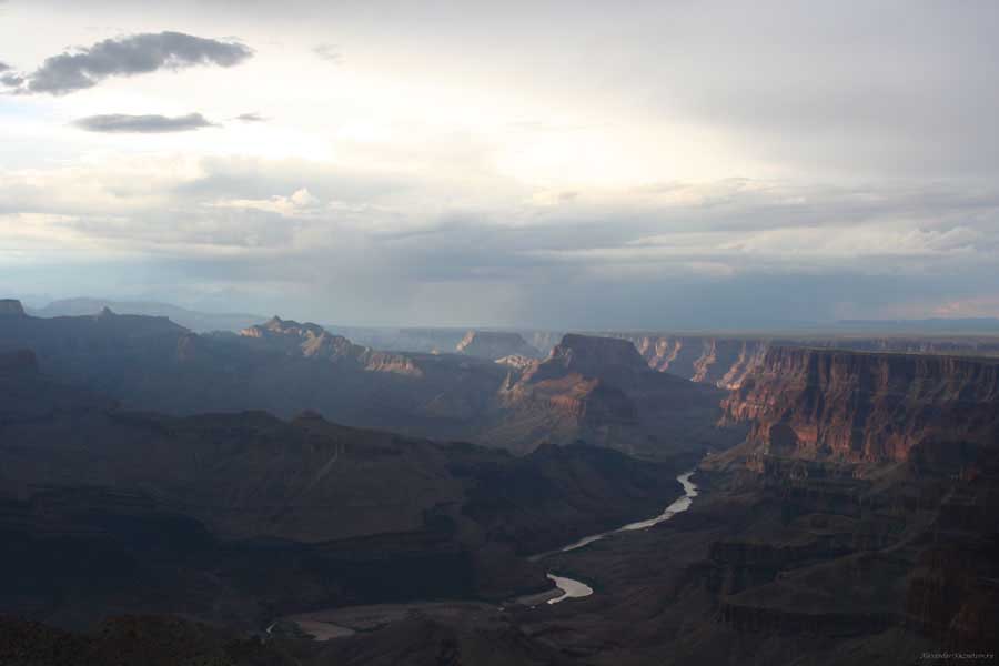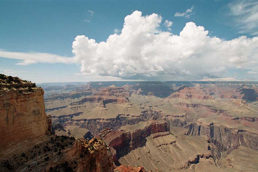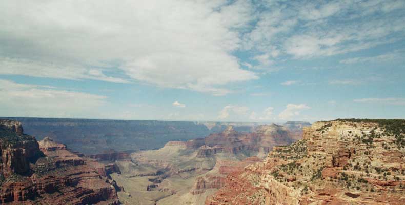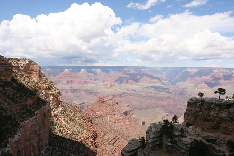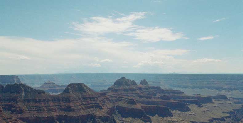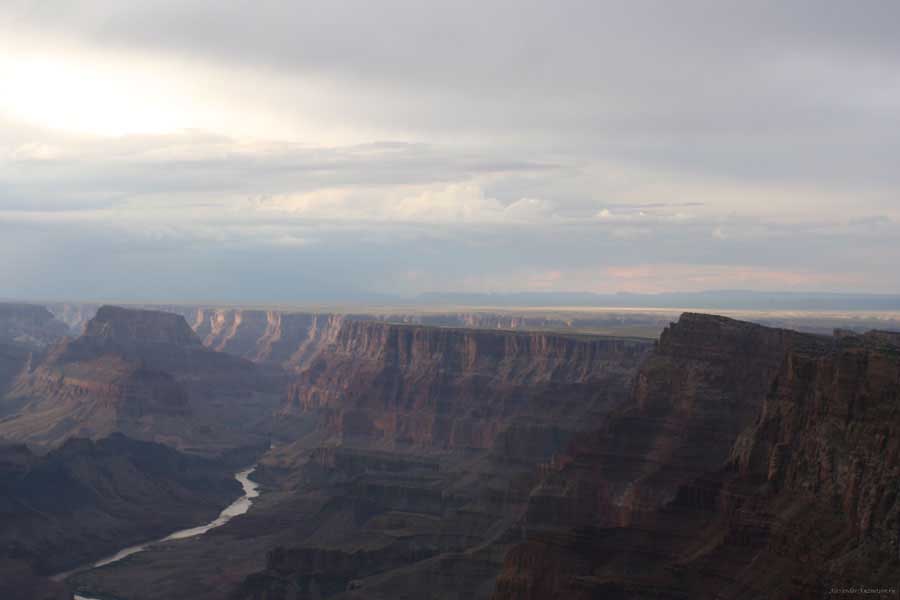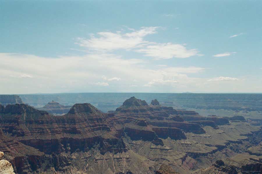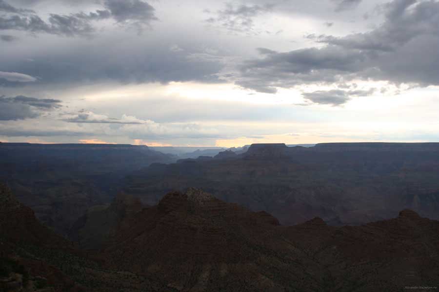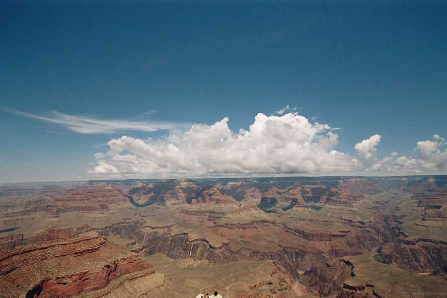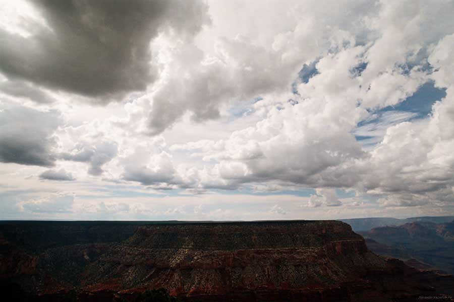 Южный берег обжит довольно сильно, много дорог, рестораны, отелей несколько, наконец, паровоз, который возит желающих вдоль каньона. Народу много. Несколько маршрутов вниз погулять, но каньон за день не перейти, слишком долго. Гранд каньон очень старый, сколько-то там миллионов лет. Речка Колорадо (Colorado River) прогрызла его очень глубоко. Средняя глубина, как пишут, одна миля. Я вниз не пошел, а долго ходил вдоль края и снимал разные ракурсы. За семь лет панорама не изменилась, не тот срок, но каждый раз, забираясь на очередной мыс, или в зависимости от положения солнца, вы видите его по-другому. Честно говоря, очень красиво. Ты стоишь на краю, а в 20 километрах другой берег, абсолютно на том же уровне, и уходящие вниз разноцветные слои, и образовавшиеся замки (или храмы) между берегами внизу. У меня с собой был неплохой бинокль, кстати, вешь необходимая. Все так и ходят с биноклем и фотоаппаратом и камерой. К сожалению, дымка была в этот день. Забегая вперед, скажу, что с северной стороны вид не тот, панорамы нет. Сама речка Колорадо, виновница каньона, видна иногда внизу. Это мутный поток, грязно-желтого цвета. Как на нем устраивают рафтинг, я не знаю. Наверное, где-нибудь выше по течению. Весь день я проходил по берегу, а вечером, когда начало темнеть, поехал к восточному выходу, чтобы каньон обогнуть. Впереди были другие виды. У восточного выхода есть сторожевая башня, по-моему, построенная в псевдоиндейском стиле. Я сделал несколько снимков каньона на закате... и небо снял. Небо вообще меня зачаровывало на этих просторах. В Москве и даже Подмосковье такого, конечно, не встретишь.