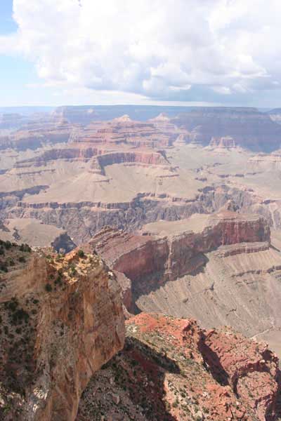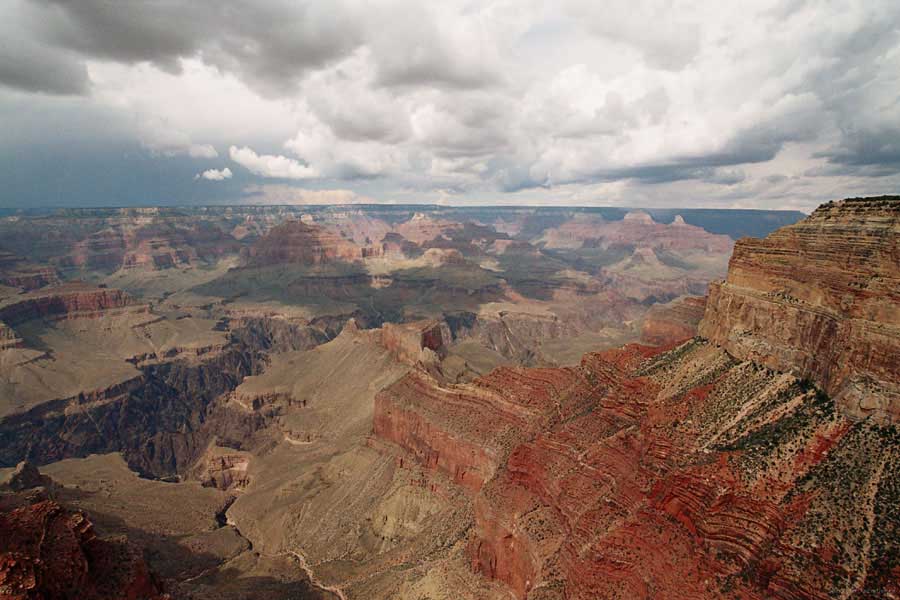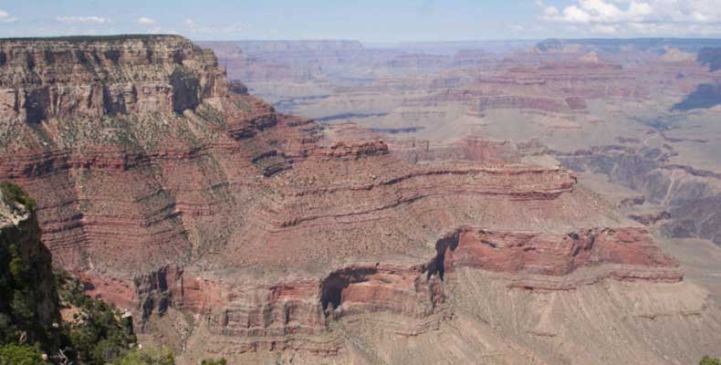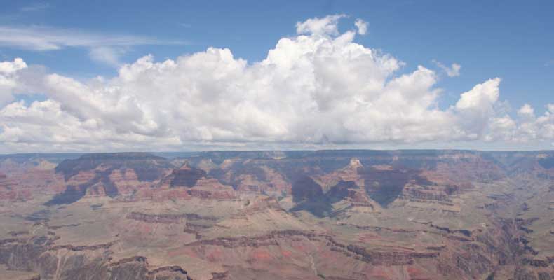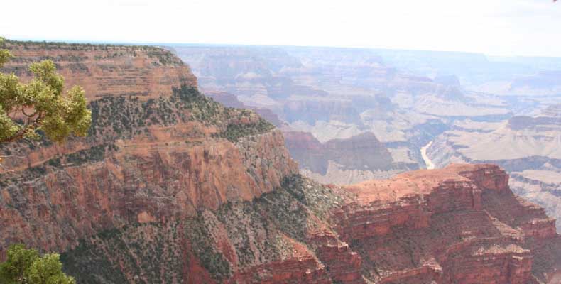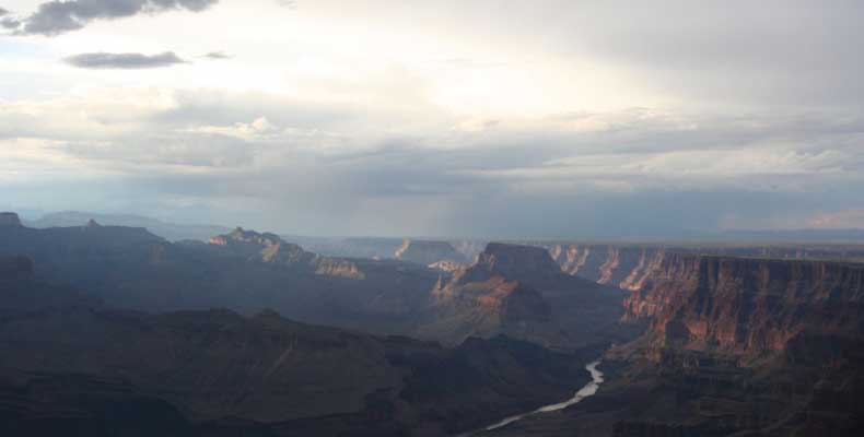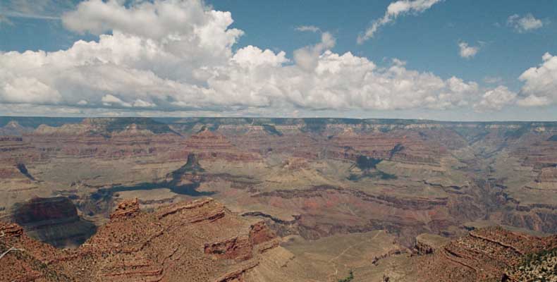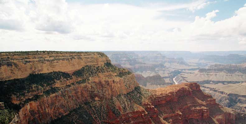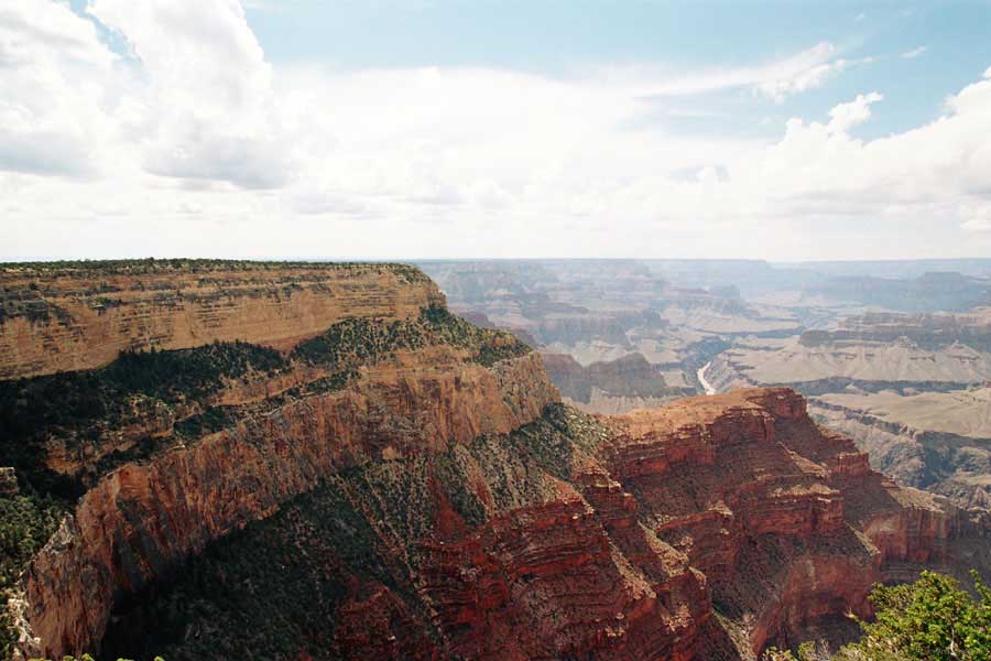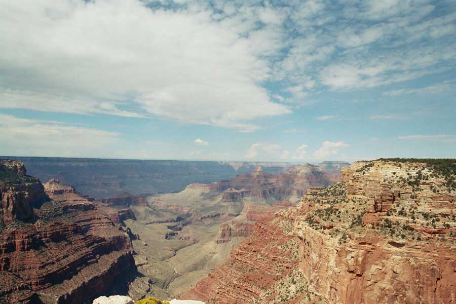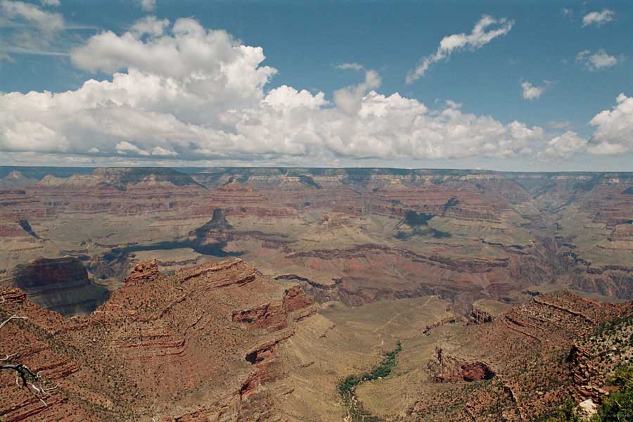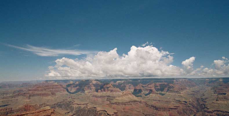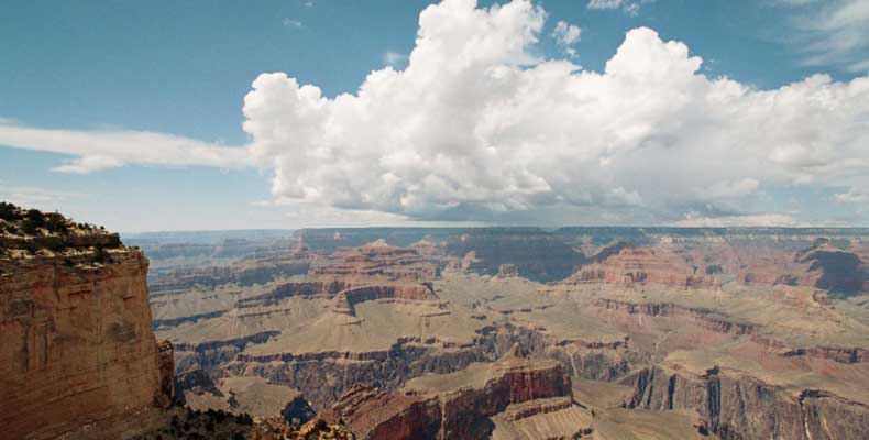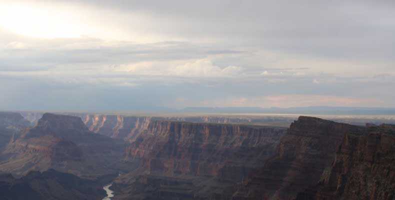 Южный берег обжит довольно сильно, много дорог, рестораны, отелей несколько, наконец, паровоз, который возит желающих вдоль каньона. Народу много. Несколько маршрутов вниз погулять, но каньон за день не перейти, слишком долго. Гранд каньон очень старый, сколько-то там миллионов лет. Речка Колорадо (Colorado River) прогрызла его очень глубоко. Средняя глубина, как пишут, одна миля. Я вниз не пошел, а долго ходил вдоль края и снимал разные ракурсы. За семь лет панорама не изменилась, не тот срок, но каждый раз, забираясь на очередной мыс, или в зависимости от положения солнца, вы видите его по-другому. Честно говоря, очень красиво. Ты стоишь на краю, а в 20 километрах другой берег, абсолютно на том же уровне, и уходящие вниз разноцветные слои, и образовавшиеся замки (или храмы) между берегами внизу. У меня с собой был неплохой бинокль, кстати, вешь необходимая. Все так и ходят с биноклем и фотоаппаратом и камерой. К сожалению, дымка была в этот день. Забегая вперед, скажу, что с северной стороны вид не тот, панорамы нет. Сама речка Колорадо, виновница каньона, видна иногда внизу. Это мутный поток, грязно-желтого цвета. Как на нем устраивают рафтинг, я не знаю. Наверное, где-нибудь выше по течению. Весь день я проходил по берегу, а вечером, когда начало темнеть, поехал к восточному выходу, чтобы каньон обогнуть. Впереди были другие виды. У восточного выхода есть сторожевая башня, по-моему, построенная в псевдоиндейском стиле. Я сделал несколько снимков каньона на закате... и небо снял. Небо вообще меня зачаровывало на этих просторах. В Москве и даже Подмосковье такого, конечно, не встретишь.