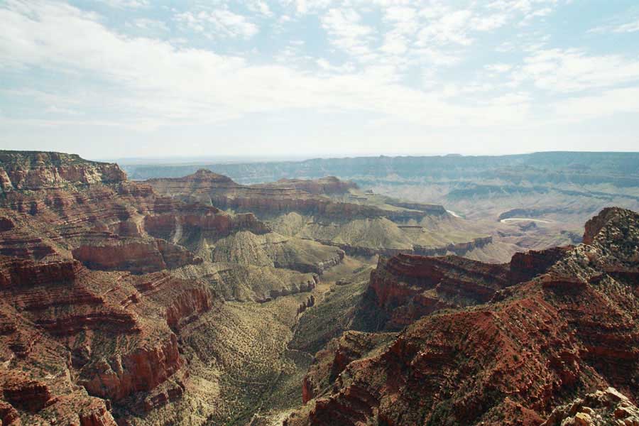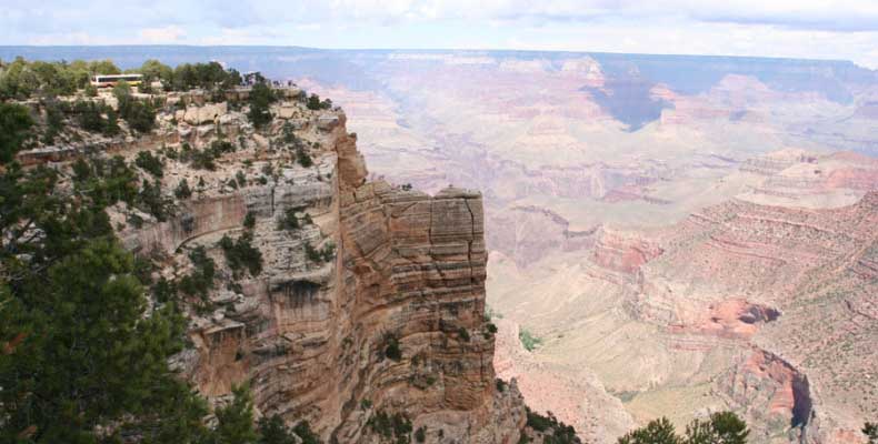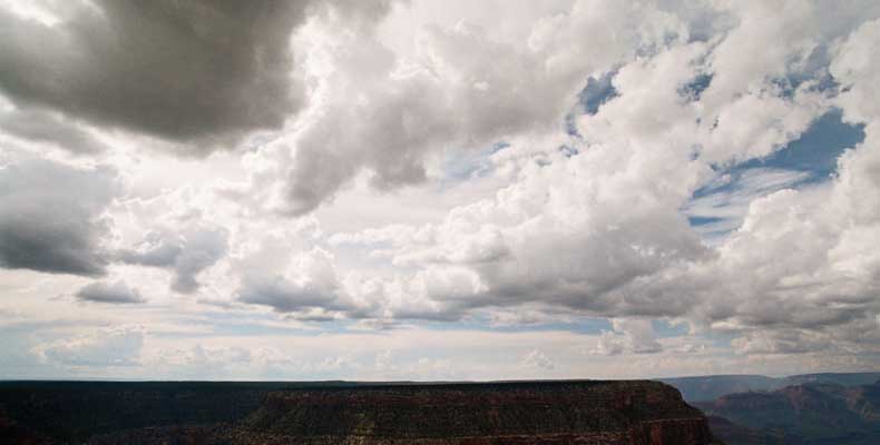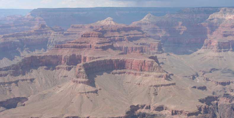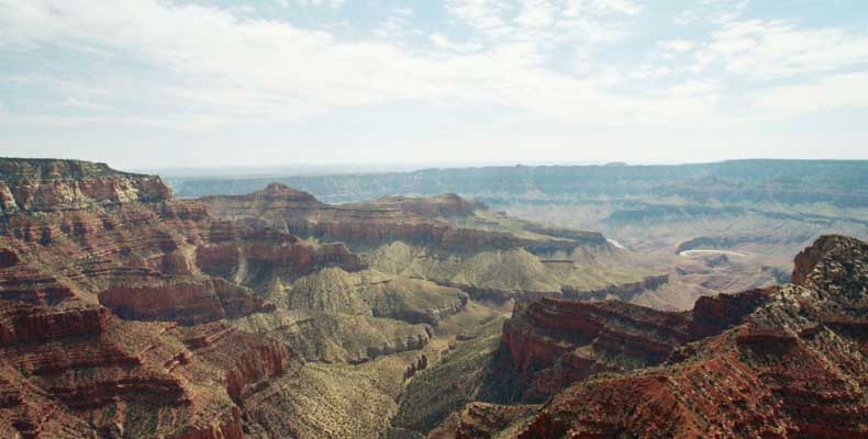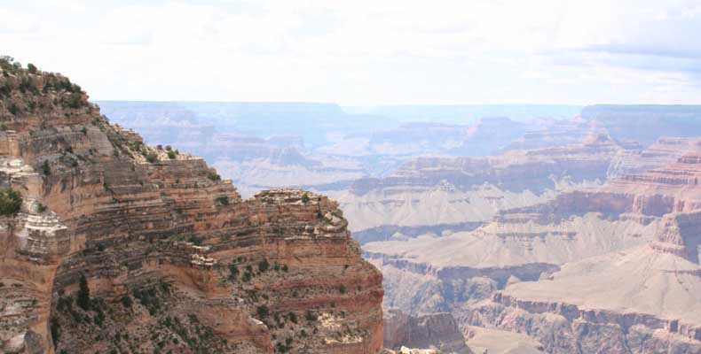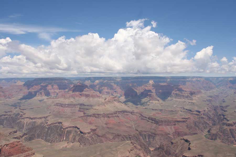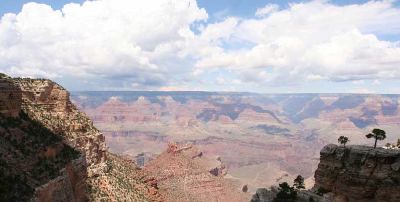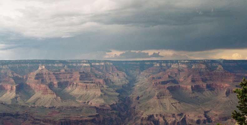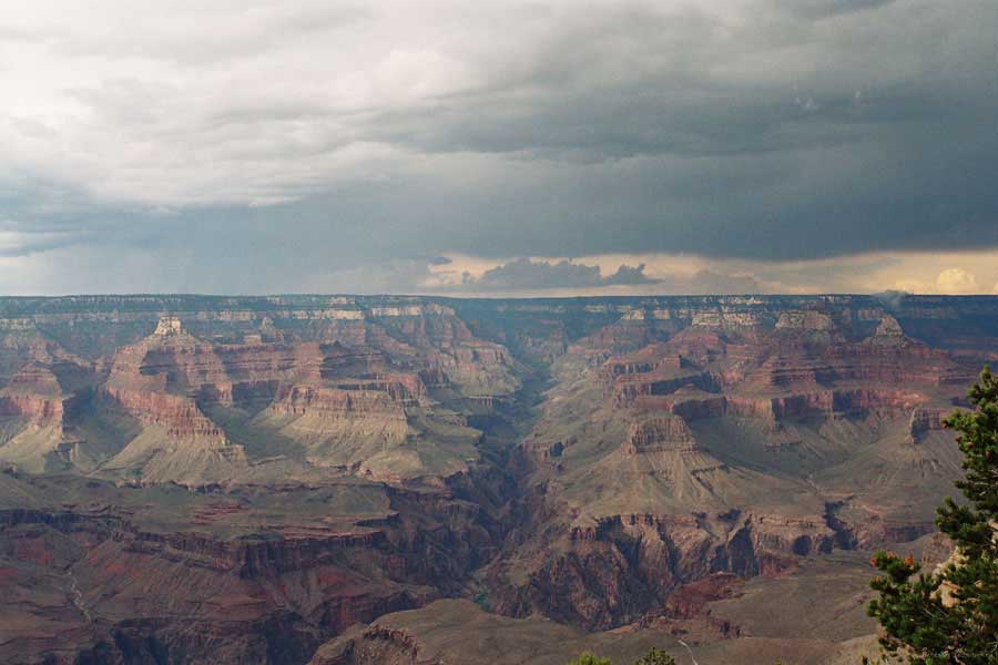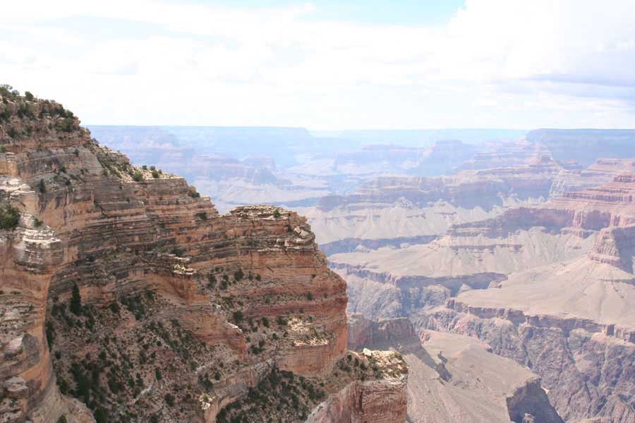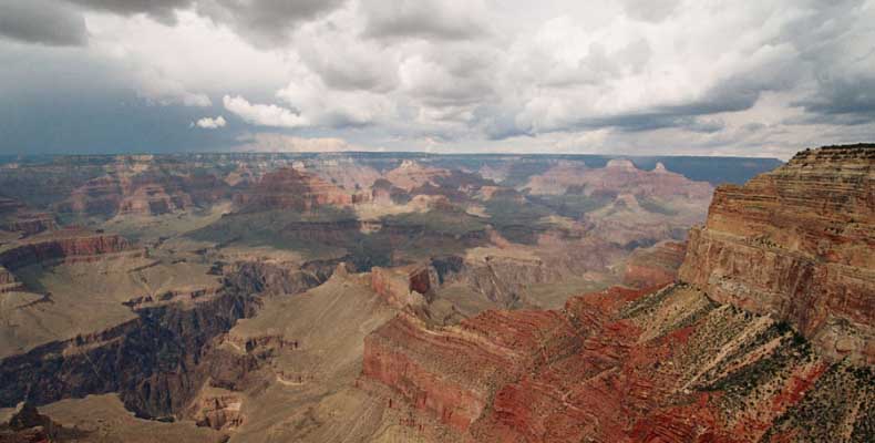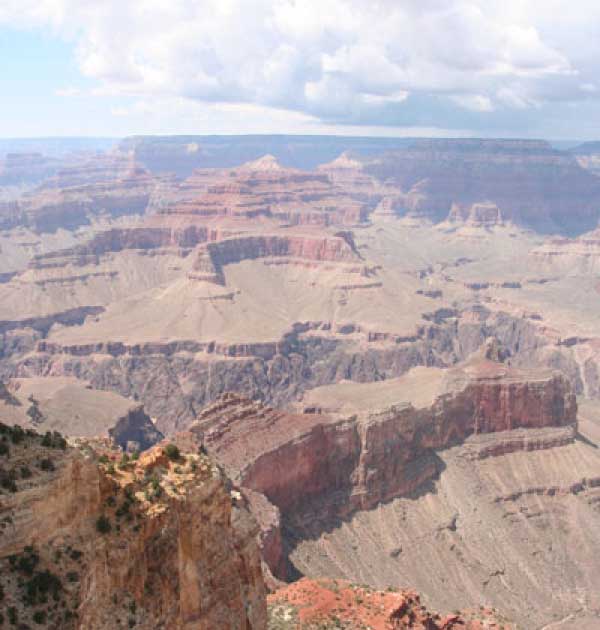 Южный берег обжит довольно сильно, много дорог, рестораны, отелей несколько, наконец, паровоз, который возит желающих вдоль каньона. Народу много. Несколько маршрутов вниз погулять, но каньон за день не перейти, слишком долго. Гранд каньон очень старый, сколько-то там миллионов лет. Речка Колорадо (Colorado River) прогрызла его очень глубоко. Средняя глубина, как пишут, одна миля. Я вниз не пошел, а долго ходил вдоль края и снимал разные ракурсы. За семь лет панорама не изменилась, не тот срок, но каждый раз, забираясь на очередной мыс, или в зависимости от положения солнца, вы видите его по-другому. Честно говоря, очень красиво. Ты стоишь на краю, а в 20 километрах другой берег, абсолютно на том же уровне, и уходящие вниз разноцветные слои, и образовавшиеся замки (или храмы) между берегами внизу. У меня с собой был неплохой бинокль, кстати, вешь необходимая. Все так и ходят с биноклем и фотоаппаратом и камерой. К сожалению, дымка была в этот день. Забегая вперед, скажу, что с северной стороны вид не тот, панорамы нет. Сама речка Колорадо, виновница каньона, видна иногда внизу. Это мутный поток, грязно-желтого цвета. Как на нем устраивают рафтинг, я не знаю. Наверное, где-нибудь выше по течению. Весь день я проходил по берегу, а вечером, когда начало темнеть, поехал к восточному выходу, чтобы каньон обогнуть. Впереди были другие виды. У восточного выхода есть сторожевая башня, по-моему, построенная в псевдоиндейском стиле. Я сделал несколько снимков каньона на закате... и небо снял. Небо вообще меня зачаровывало на этих просторах. В Москве и даже Подмосковье такого, конечно, не встретишь.
