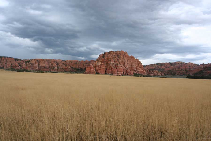 Далее уже в сумерках дорога на городок Cameron, и далее на север. Как выяснилось, на восточном отроге каньона есть красивые места. Река протекает по зеленой равнине, в которой она промыла глубокий ход с отвесными стенами. Я, к сожалению, уже не фотографировал - было темно и устал. Целью следующей остановки был городок, который я выбрал накануне, под названием Канаб (Kanab). Забыл сказать, что изначально в Москве я выбрал три точки, вернее, четыре. Гранд-Каньон с юга и севера, Заян каньон (Zion canyon) (про него я как-то в интернете прочел, что там красиво) и Брайс каньон (Bryce canyon), про который я слышал, что там снимали мой любимый фильм детства "Золото Маккены". Я думаю, многие ровесники помнят этот фильм. Городок Канаб находится на юге штата Юта на приблизительно равном расстоянии от всех трех точек. Надо сказать, что вообще район не очень обжит. Нет огромных супермаркетов, набитых шмотками, местность заселена не густо. Можно за 80 миль не встретить ни одной бензоколонки. Однажды еле доехал до заправки - бензин был на полном нуле. Но дороги все равно отличные! В этот вечер до Канаба не доехал - стемнело, пошел ливень. Остановился в городке Page на границе штатов, но еще в Аризоне. Найдя недорогой мотель, пошел поесть в мексиканский ресторан. Вообще мексиканские рестораны были самые популярные на всем пути: фахитос, начас (или начос), сальса, буритто... В общем, вкусно. Я вообще считал, что в Америке еду не уважают. Везде фаст-фуд, хватай жратву у стойки и вали давай отсюда. Но это не совсем так. Может, французских деликатесов вы и не найдете повсеместно, но стейк всегда хорош. Берите стейк - не ошибетесь! В ресторане мне попалась рекламка каньона Антилоп. Случайно попалась. И я вспомнил, что читал про него в Интернете. Была заметка-инструкция, как в этом каньоне делать суперснимки. Сам каньон на карте я не нашел, спросить было не у кого, агенства были закрыты, а где он находится, я не помнил. Да и цель была у меня другая - добраться до Канаба. Но рекламку забрал...