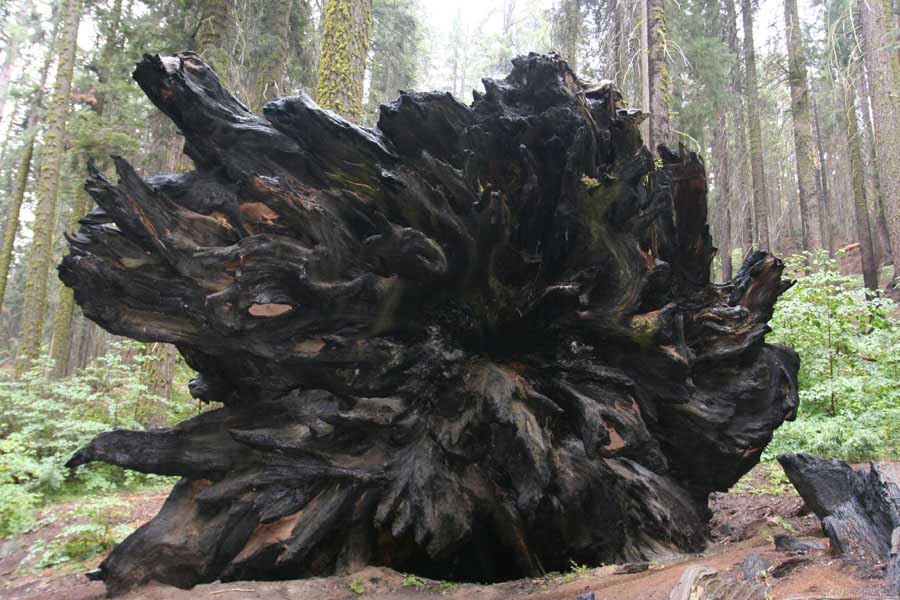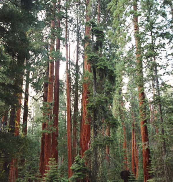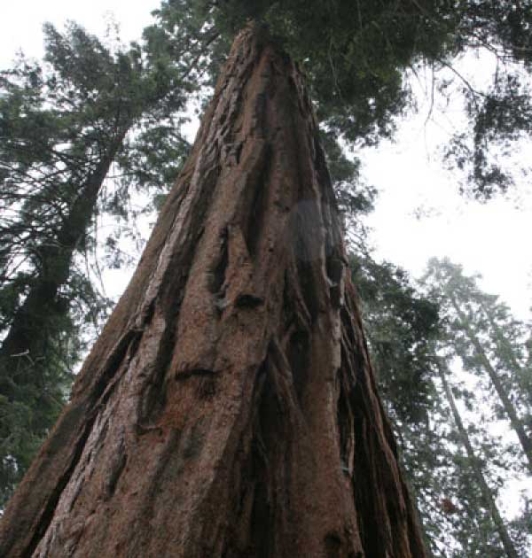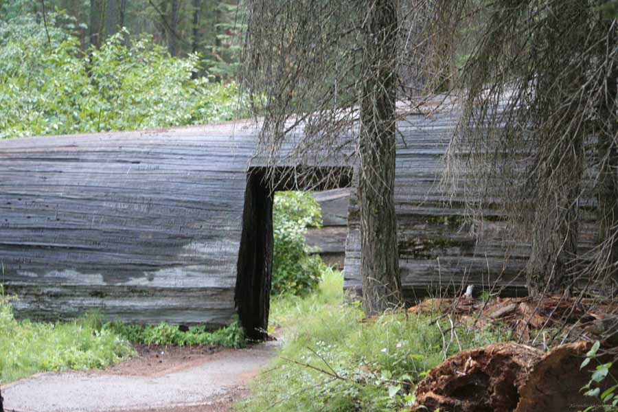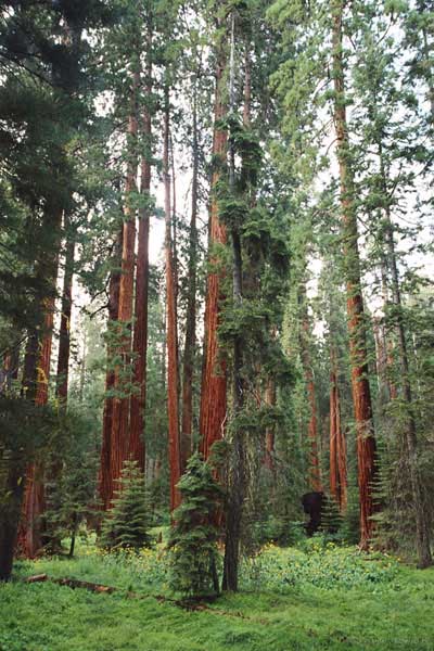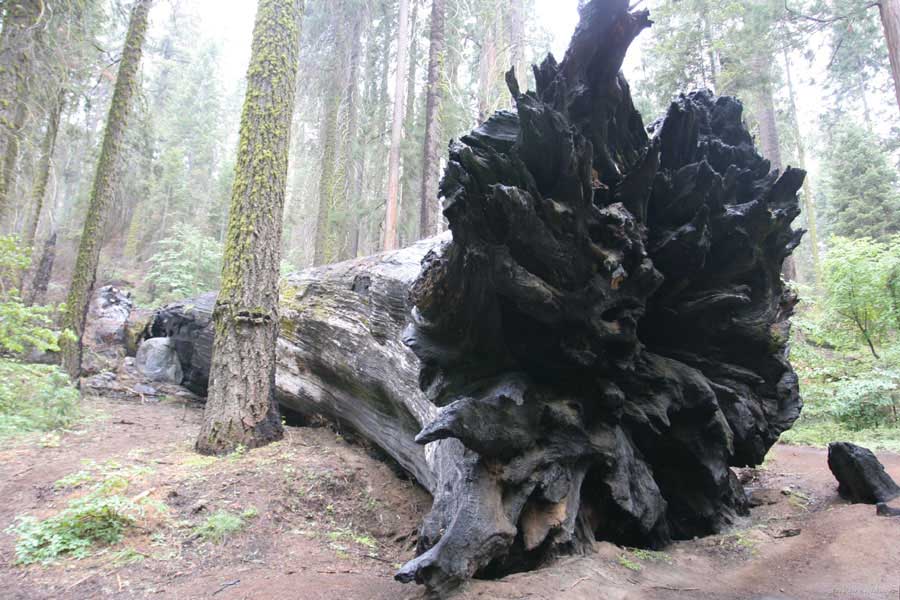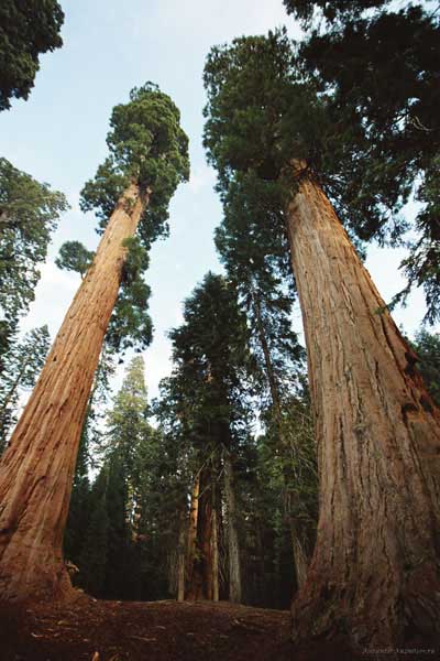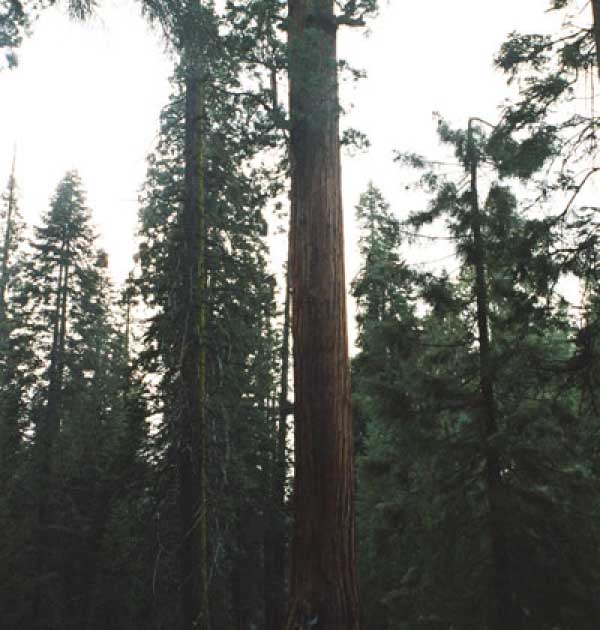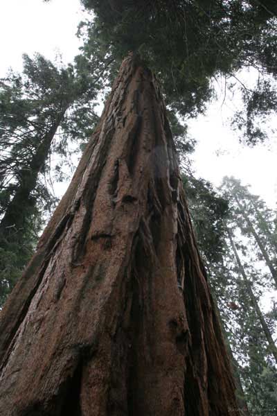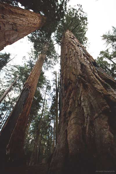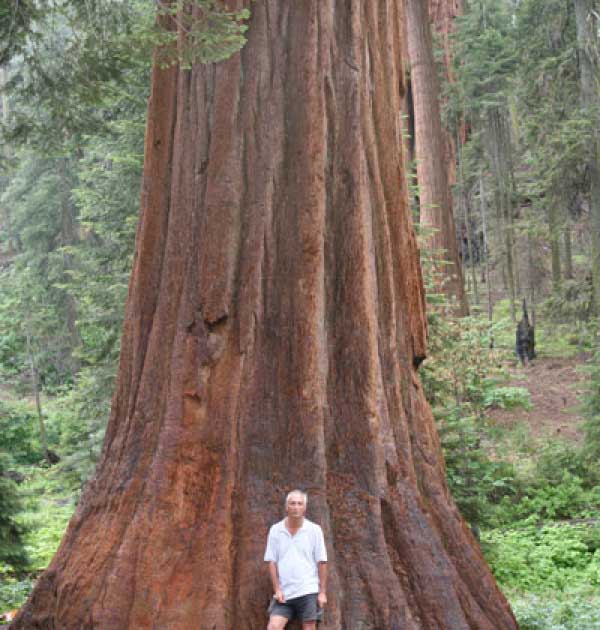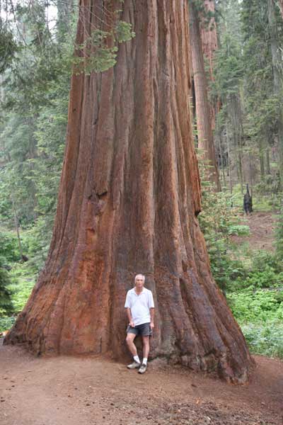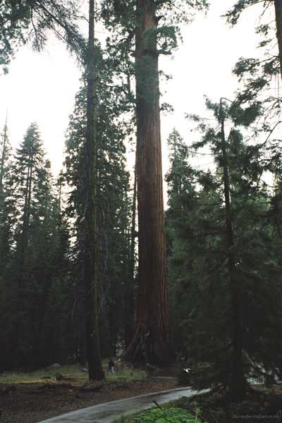 Дальше длинная дорога под вечер в темноте опять через Канаб, через Заян на 15 дорогу. Хотел ехать сколько можно, но сил хватило только до Лас-Вегаса. Понимая, что возможность переночевать - одна из лучших, искал мотель довольно долго. Все в основном для молодоженов и на неделю. Это явно не подходит. Наконец за бешеные деньги (баксов 60) около аэропорта нашел здоровенную комнату с протекшим потолком. Внизу естественно казино. Ничего интересного. Утром опять в путь. Это самый изнурительный переезд. Наконец часам к 15 я подъезжаю к парку секвой в Калифорнии. Все это как бы по дороге в Сан-Франциско. Но секвойи я хотел посмотреть давно. Вернее еще в Лос-Анджелесе. Я зашел в большой книжный магазин купить атлас или карты. Мой атлас с 1998 года я одолжил друзьям в Москве и здесь, в Калифорнии, пытался купить локальные карты или новый атлас. Кстати, атласа не нашел. Ничего не понравилось. Но с полки упала карта Кингс каньона и парка секвой. Естественно, я забрал. Так вот, по дороге в Сан-Франциско решил заехать и посмотреть, так ли эти деревья велики. Крюк получился приличный. Только в парке по серпантину надо ехать миль 20. На карте отмечено три места, где растут гигантские растения. Наконец приехали. Смотрю - и правда, гигантские. Похожие на большие сосны, только кора цветом светлее. Я почувствовал себя коротышкой из цветочного города, который на луне пытался продать акции гигантских растений. Этих самых. Или гномом лесным. Конечно, между секвойями растут обычные ели, но они им мешают. Секвойям нужен открытый свет, поэтому им хорошо, когда обычные ели сгорают от пожаров и секвойям дышится легче. Кстати, секвой тоже много упавших и обгоревших. Я не люблю людей фотографировать, но здесь надо было для сравнения.