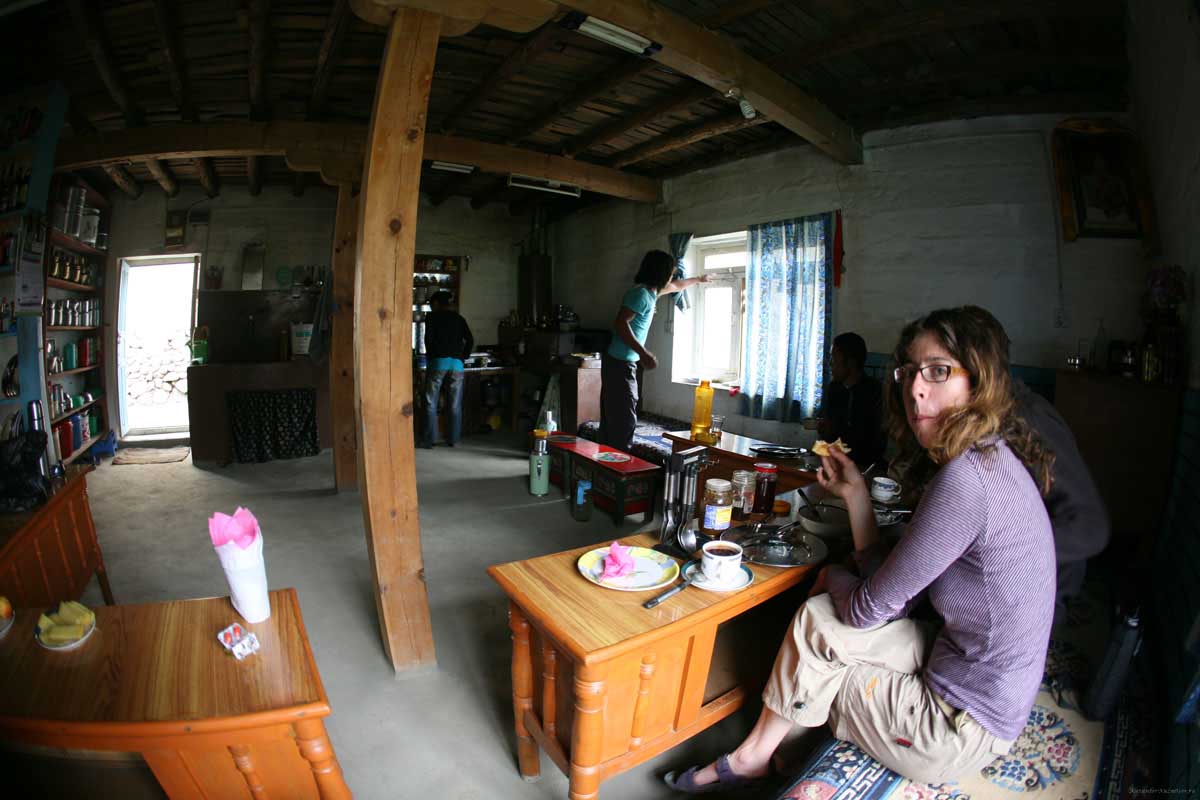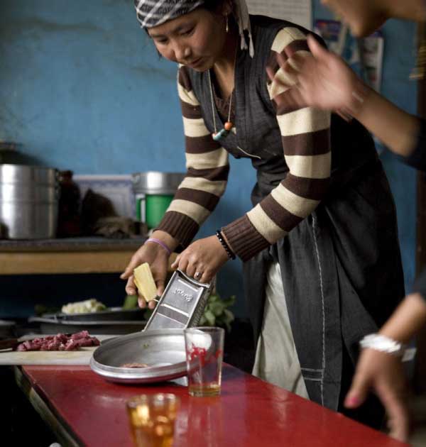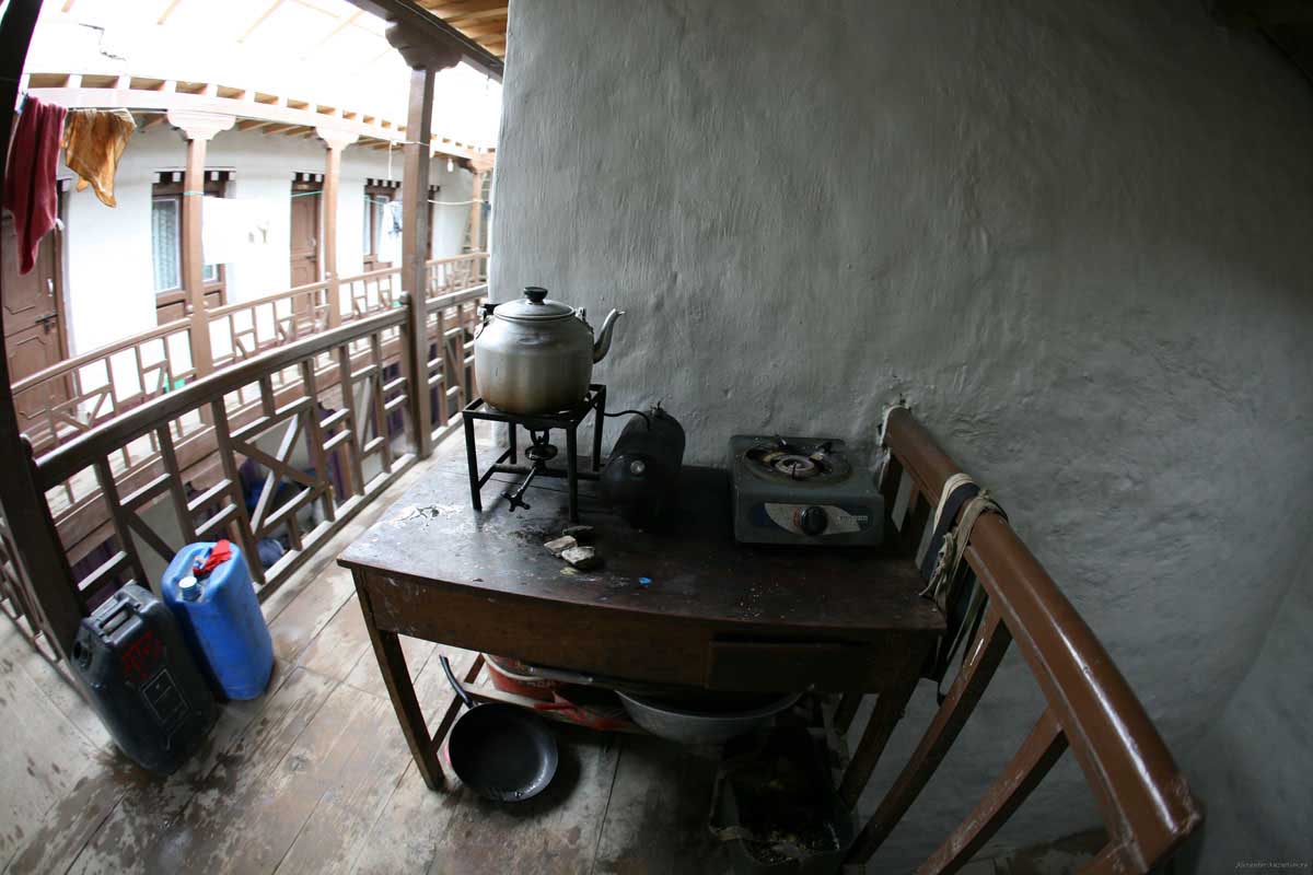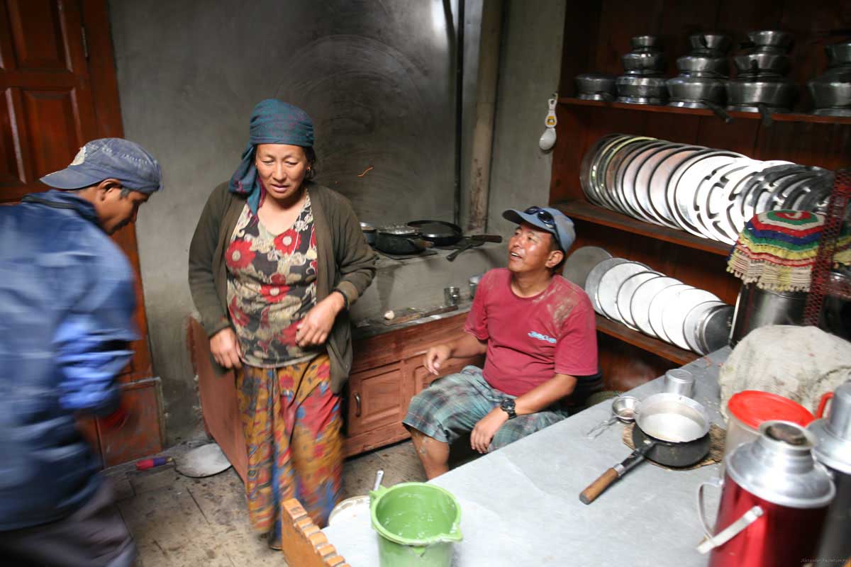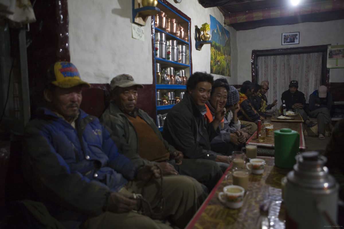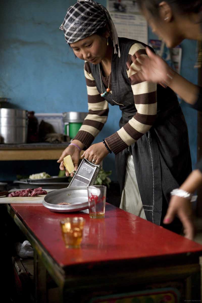 На кухне передо мной его мама, его жена, главный почтальон и приглашенная посудомойка. Все дружно готовят еду с 5 вечера до 10 вечера. Рис варят в скороварках, тут же рубят мясо барана, взбивают в специальной ступе тибетский чай с маслом. Если группа большая, то еду по тарелкам раскладывают на полу, отгоняя назойливую кошку по имени Пэ-э. В общем, все, как у нас.