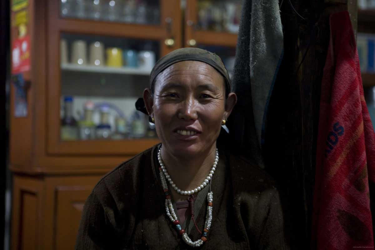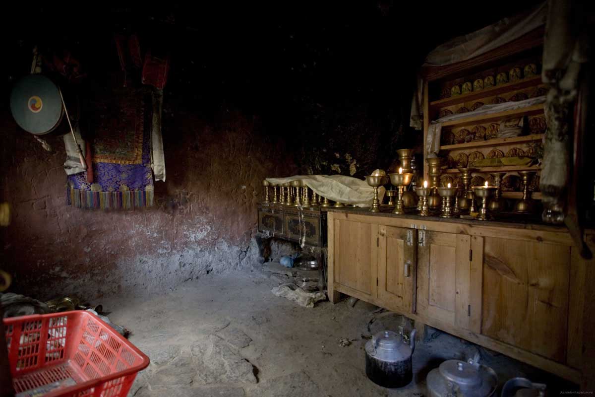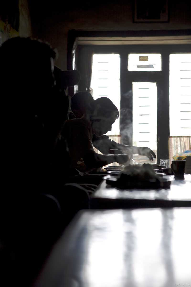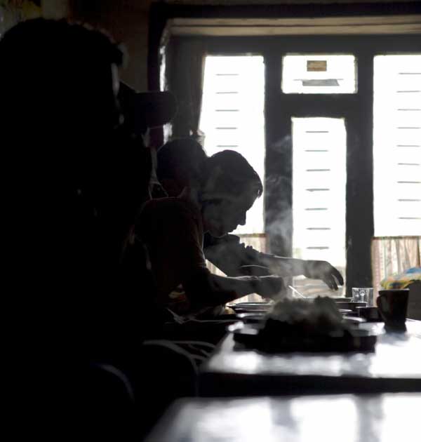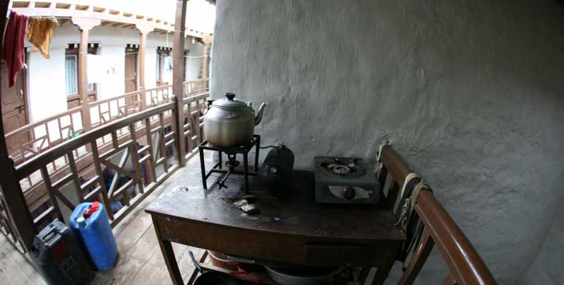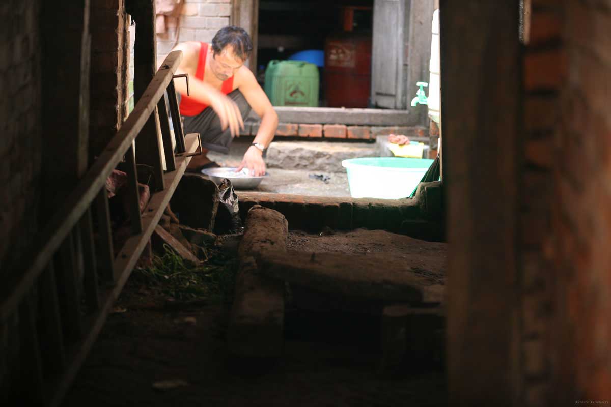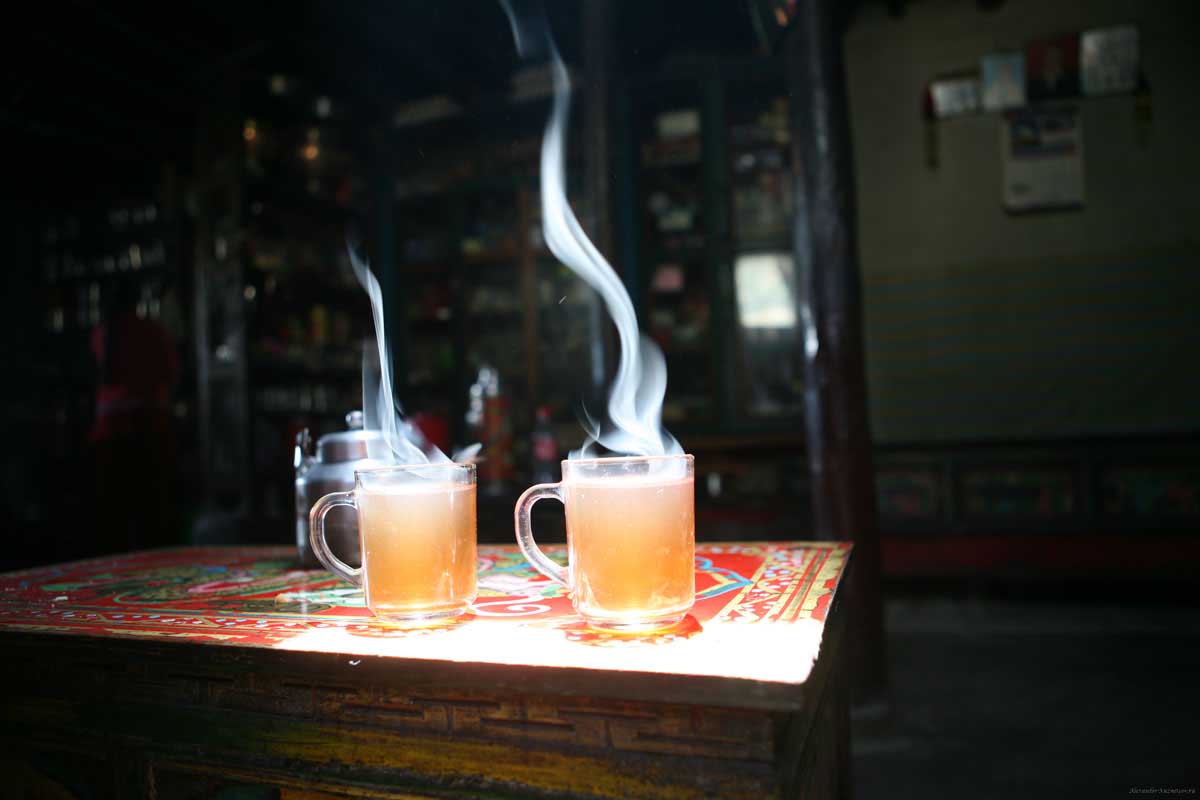 На кухне передо мной его мама, его жена, главный почтальон и приглашенная посудомойка. Все дружно готовят еду с 5 вечера до 10 вечера. Рис варят в скороварках, тут же рубят мясо барана, взбивают в специальной ступе тибетский чай с маслом. Если группа большая, то еду по тарелкам раскладывают на полу, отгоняя назойливую кошку по имени Пэ-э. В общем, все, как у нас.