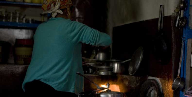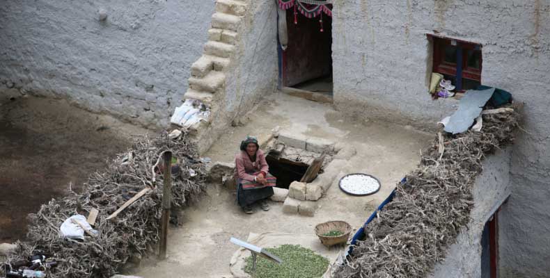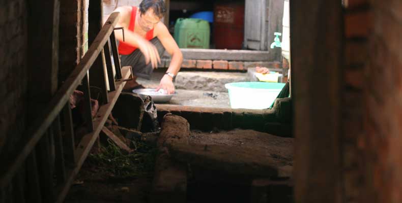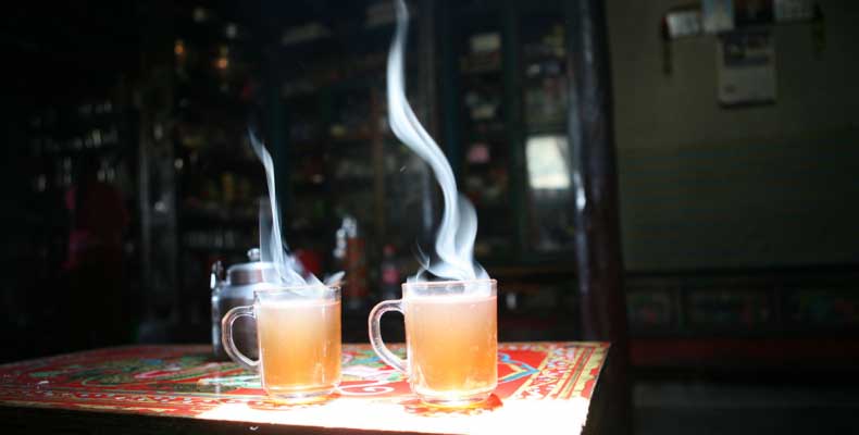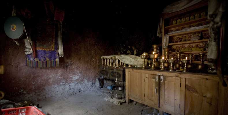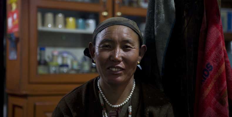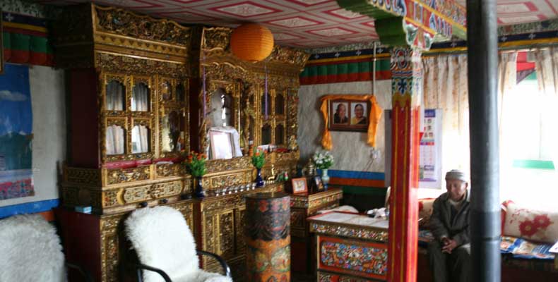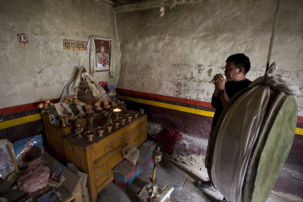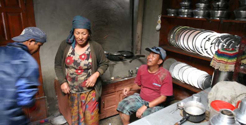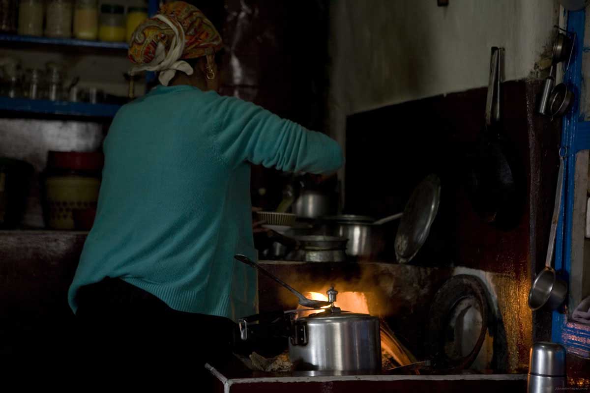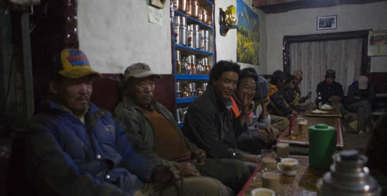 На кухне передо мной его мама, его жена, главный почтальон и приглашенная посудомойка. Все дружно готовят еду с 5 вечера до 10 вечера. Рис варят в скороварках, тут же рубят мясо барана, взбивают в специальной ступе тибетский чай с маслом. Если группа большая, то еду по тарелкам раскладывают на полу, отгоняя назойливую кошку по имени Пэ-э. В общем, все, как у нас.
