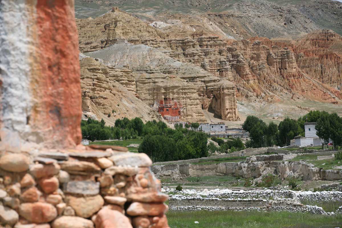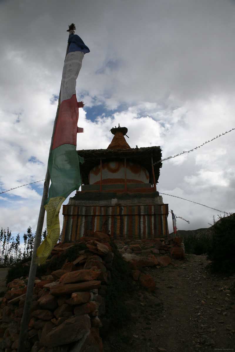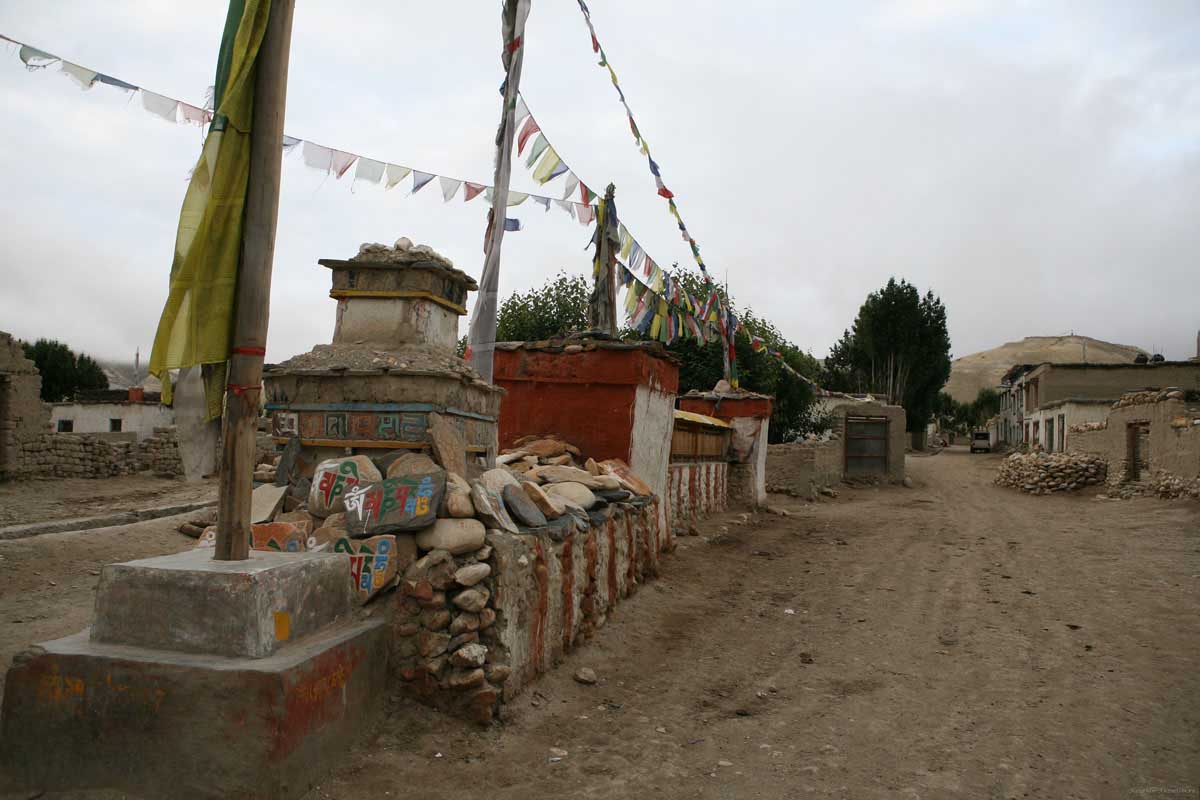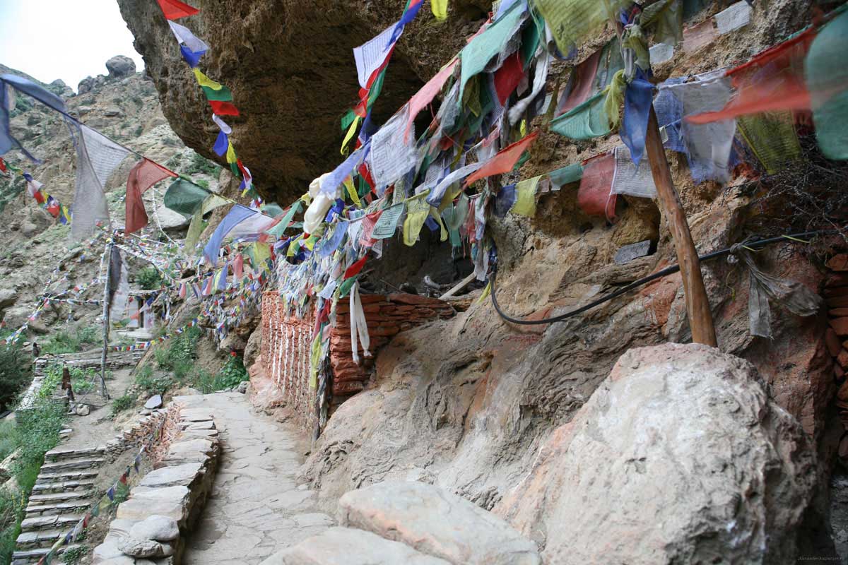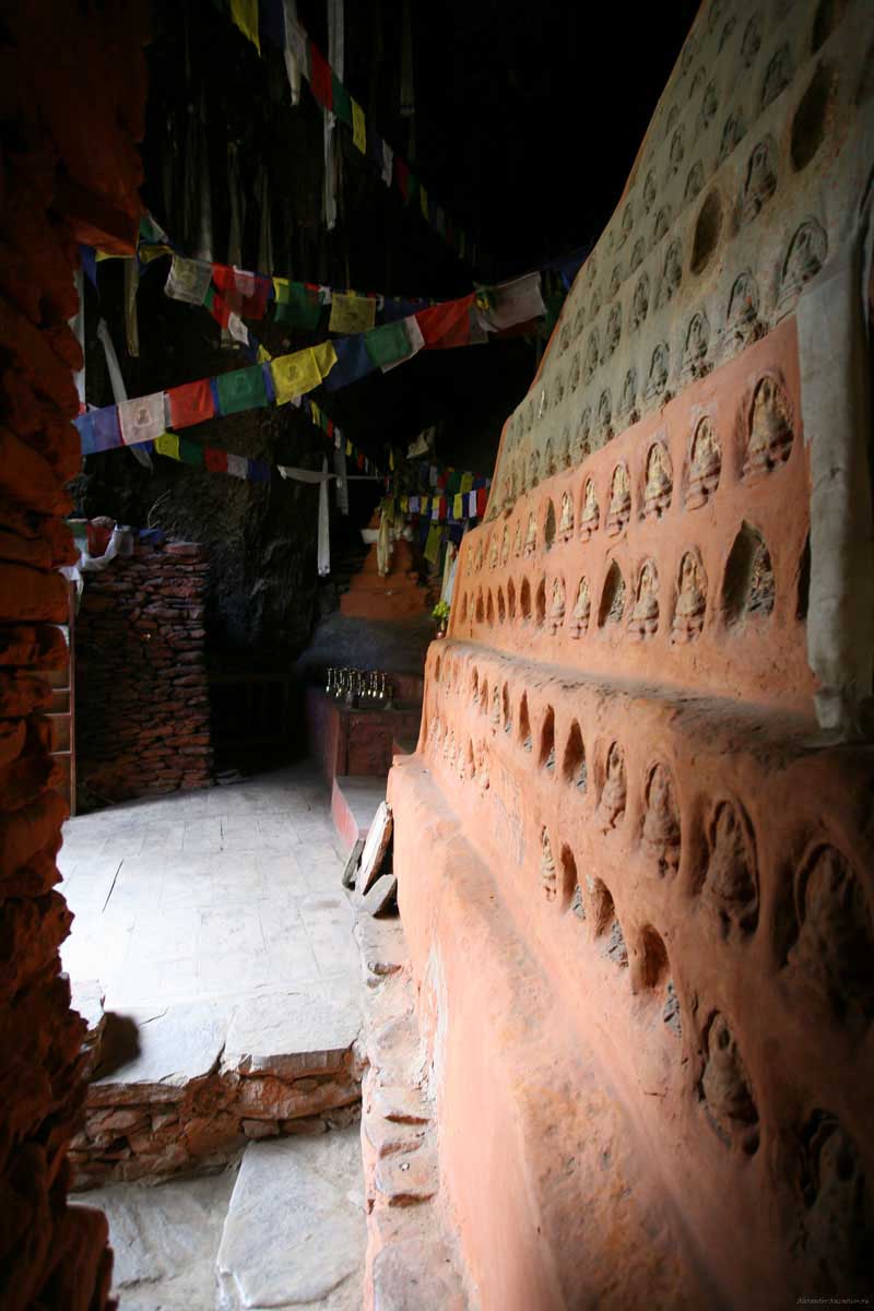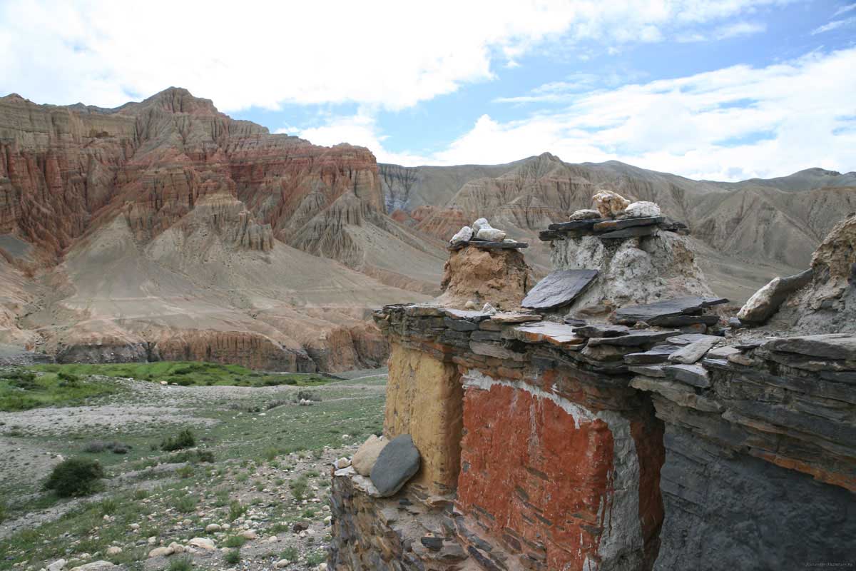 Падма провел рекогносцировку, понял, что это демон кирпичи ворует, и принял решение биться с демоном как раз на месте Дагмара. Демона убил, кишки его размотал и получилась самая длинная молельная стена (mani wall) – 240 метров. А скалы кровью демона измазал. Поэтому они и красные. А сердце демона закопал под ступу в Гар Гомпа (мы еще дойдем).