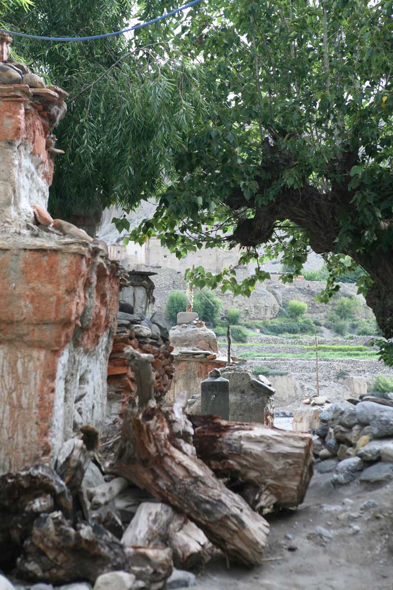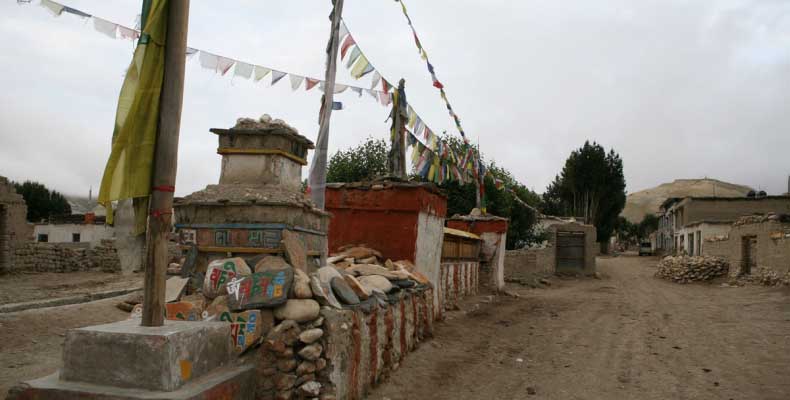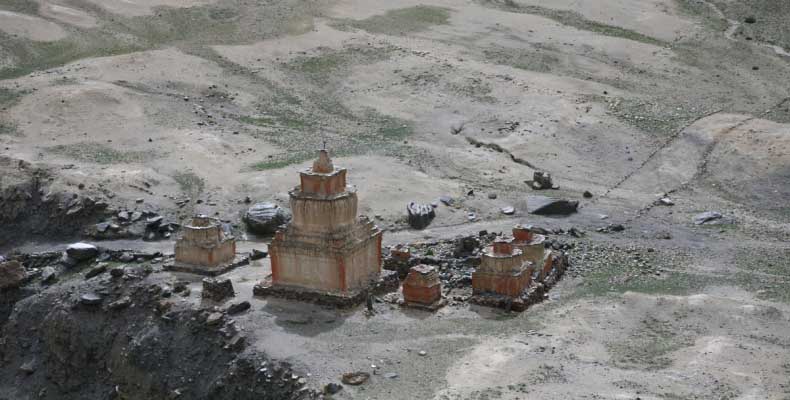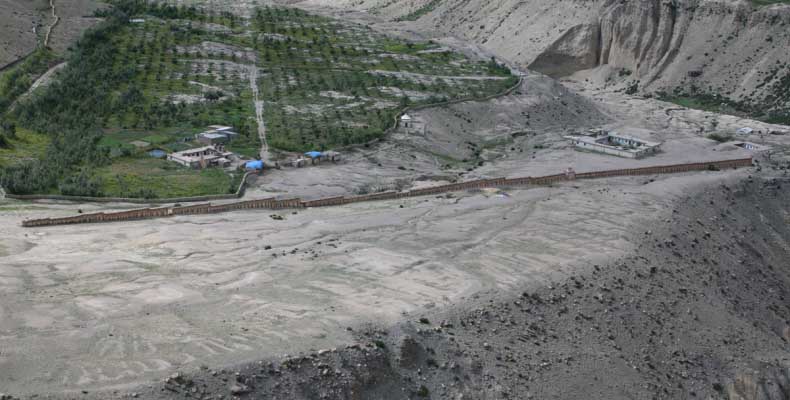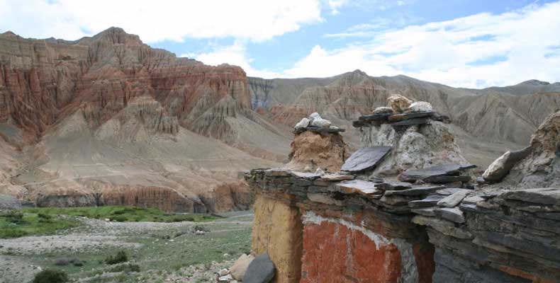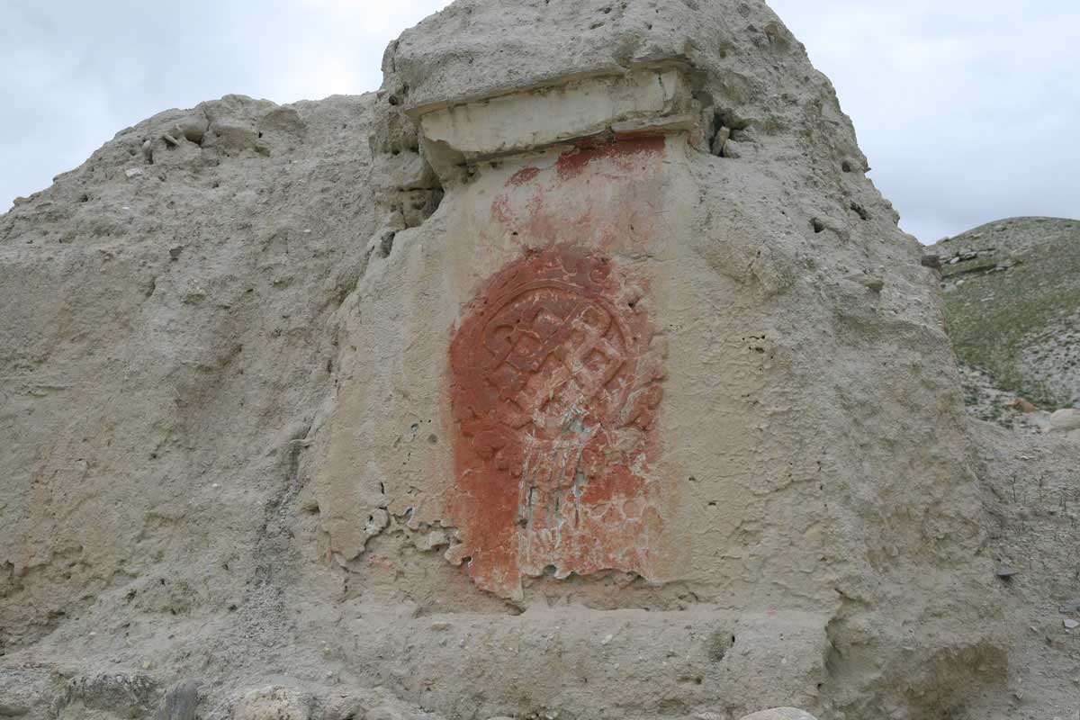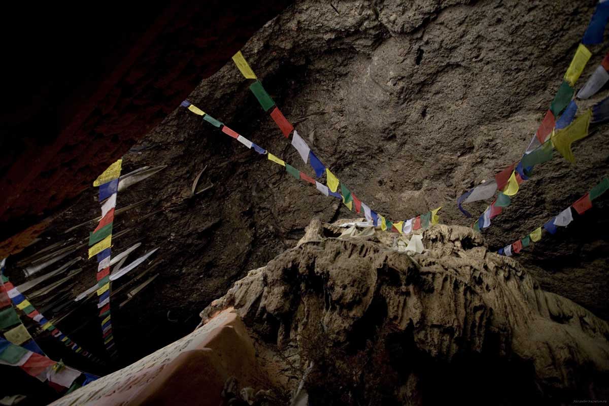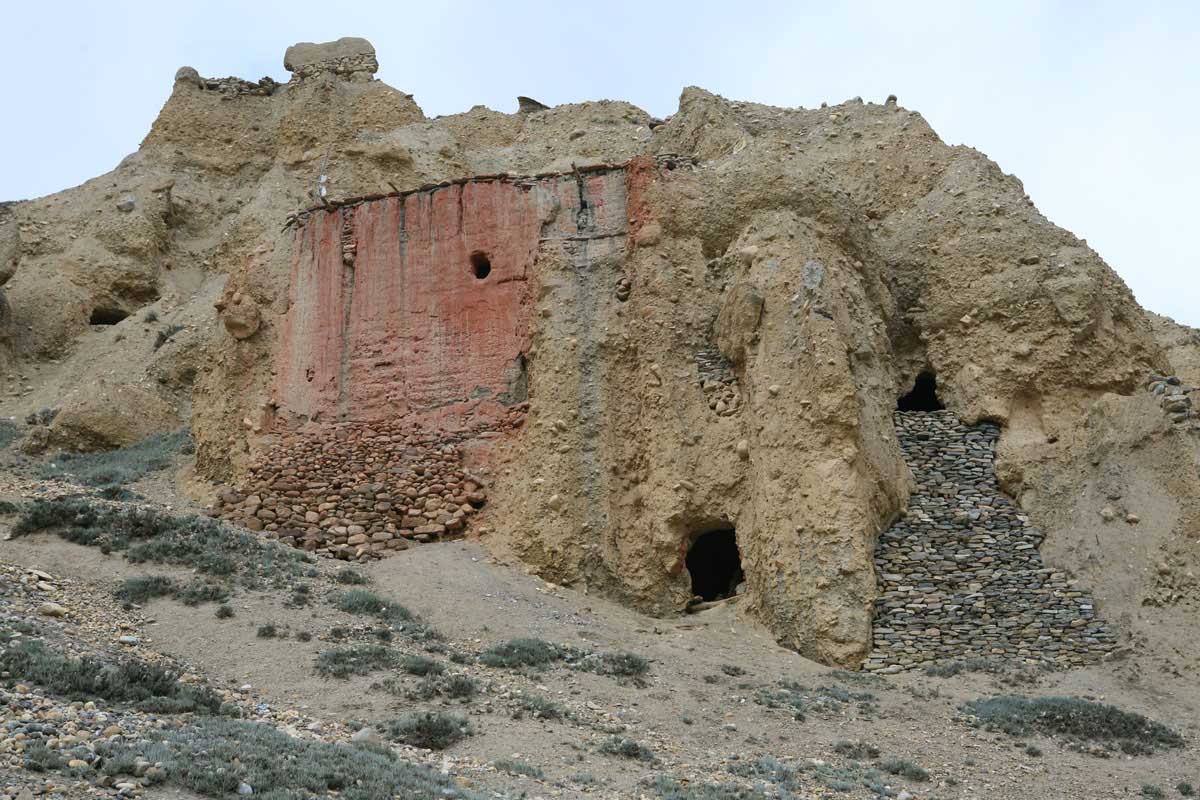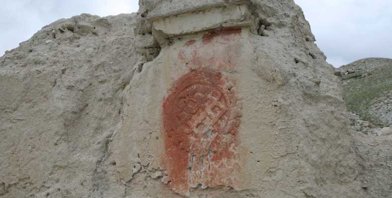 Падма провел рекогносцировку, понял, что это демон кирпичи ворует, и принял решение биться с демоном как раз на месте Дагмара. Демона убил, кишки его размотал и получилась самая длинная молельная стена (mani wall) – 240 метров. А скалы кровью демона измазал. Поэтому они и красные. А сердце демона закопал под ступу в Гар Гомпа (мы еще дойдем).