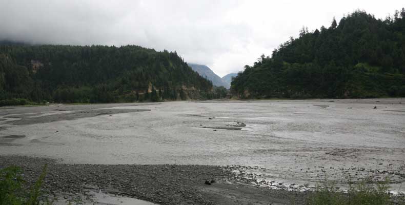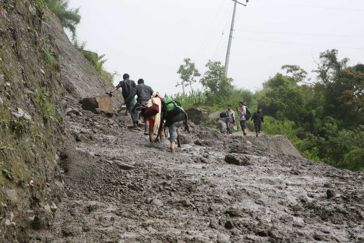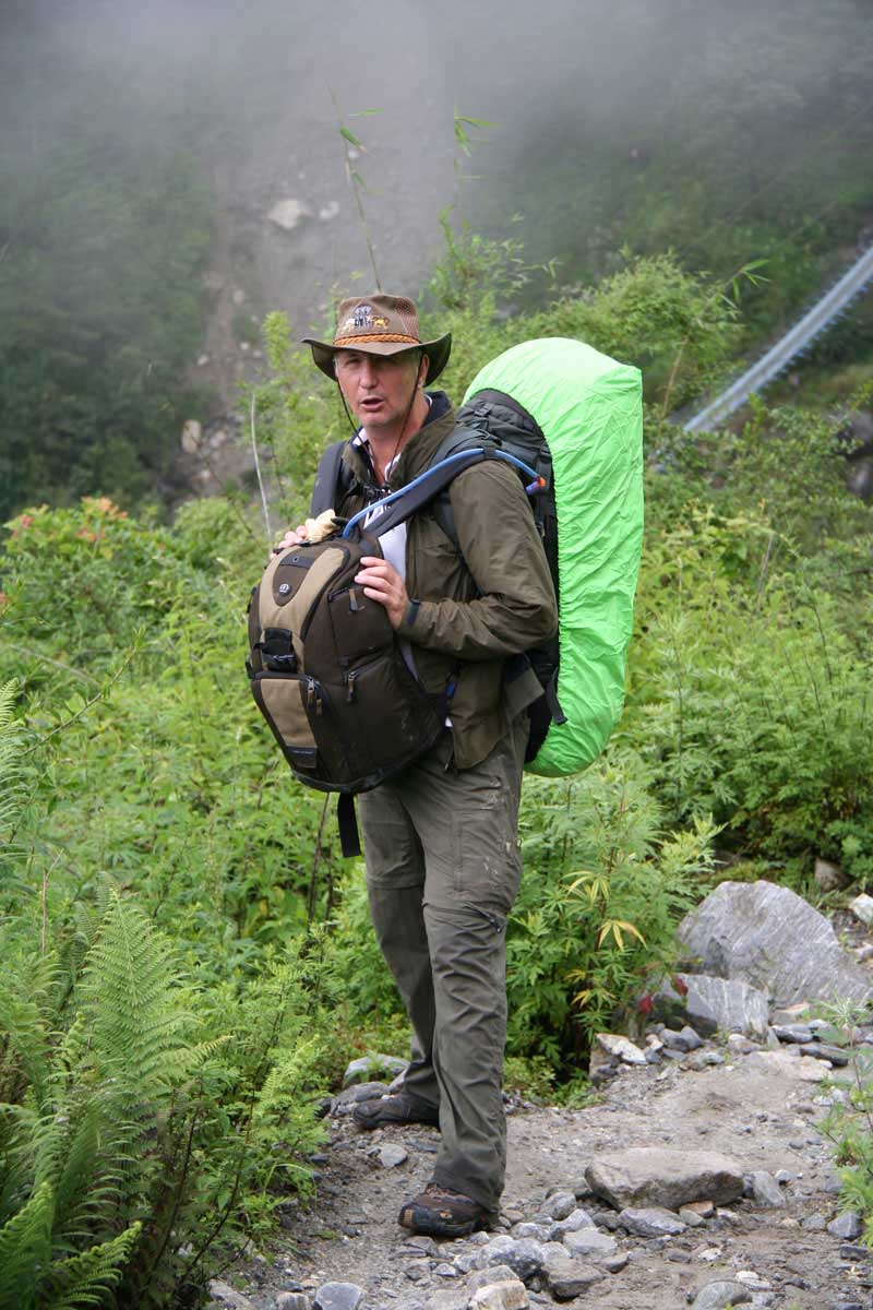 Потом опять два километра проехали на автобусе. И опять оползень. После него спустились к реке и поднялись на другой берег метров на сто. Я тащу два своих рюкзака.