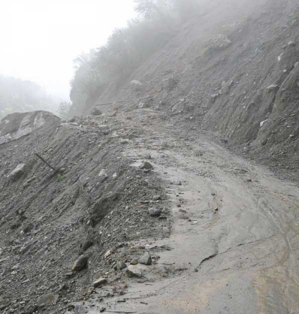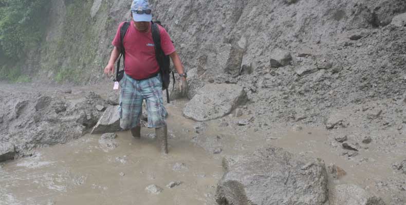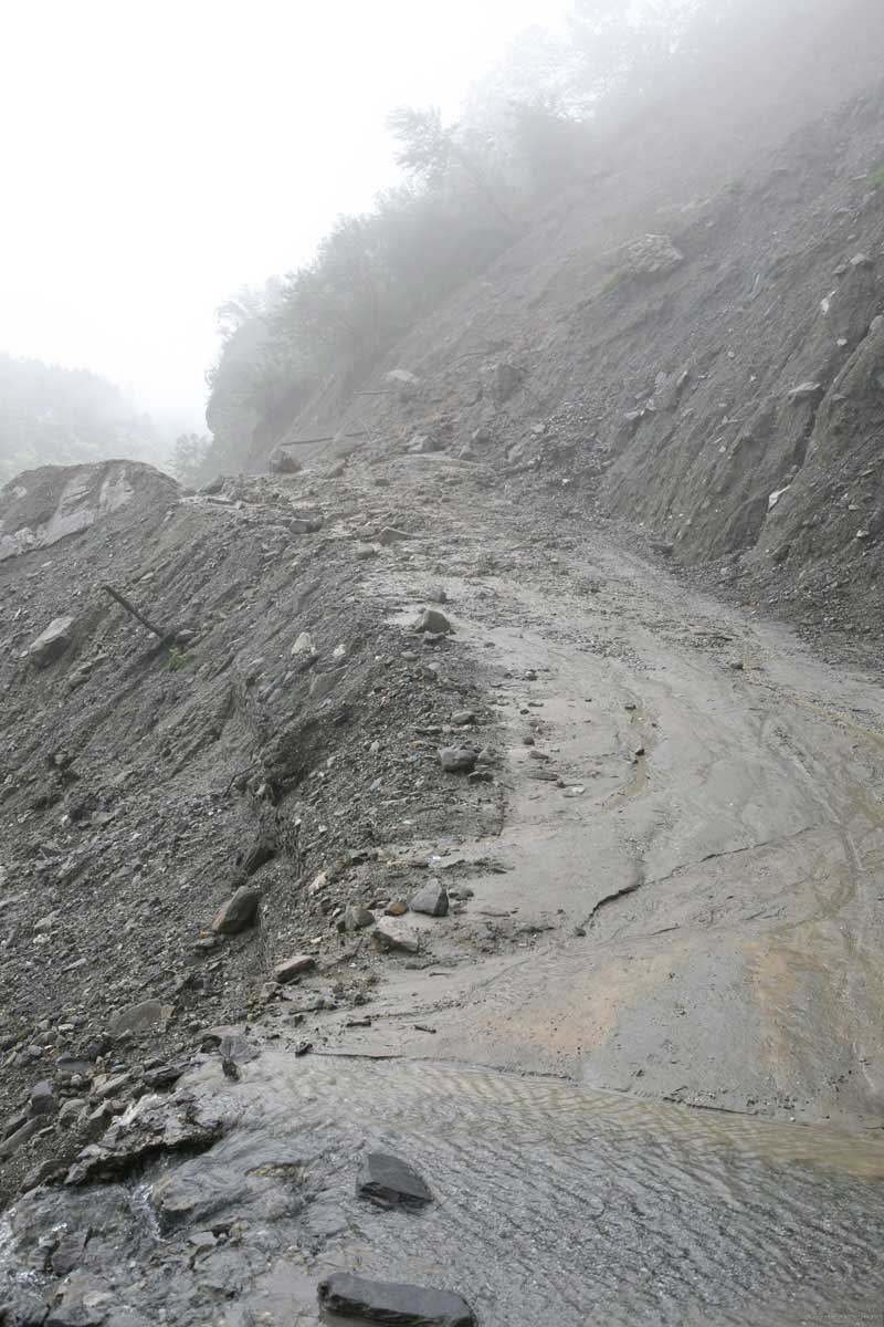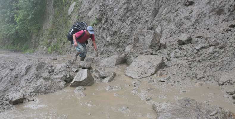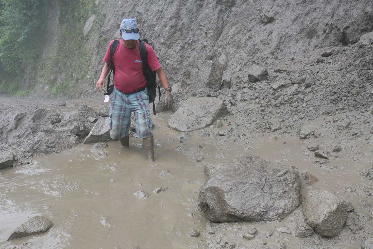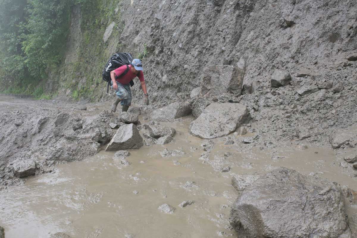 На автобусе проезжаем всего километра 2. Впереди оползень. Грязь с камнями съехала вниз и завалила дорогу. Все выходят, разуваются и засучивают брюки до колен. Бредешь метров двадцать в грязи, под которой острые камни, тихонько нащупывая на дне место поровнее. Вдруг сзади тебя с громким хлюпом падает большой камень сверху. У тебя резко возрастает скорость передвижения. В результате ободранные ноги и большой синяк на подошве. Нога болела дня четыре.