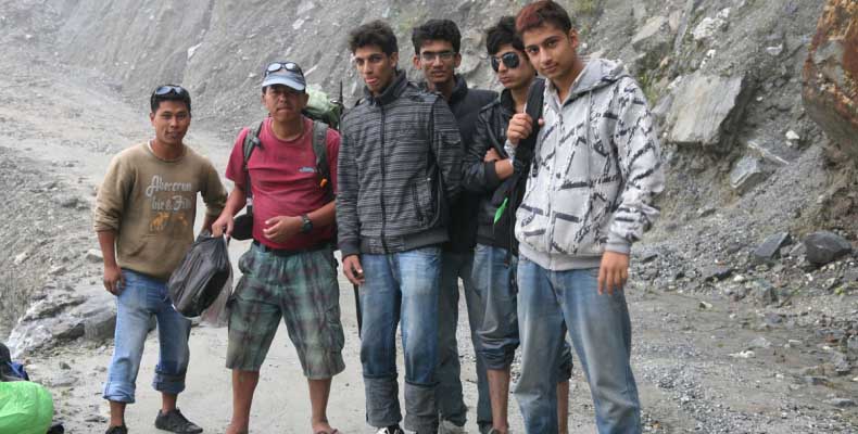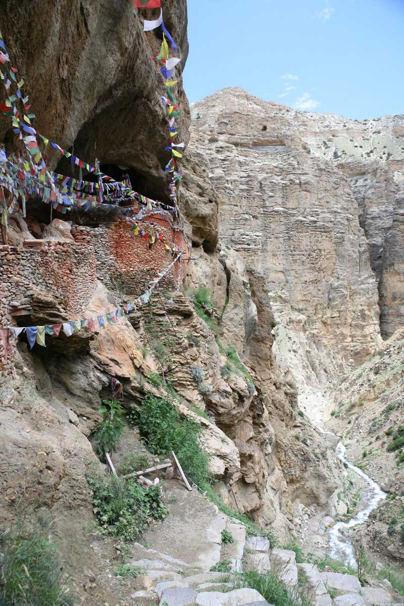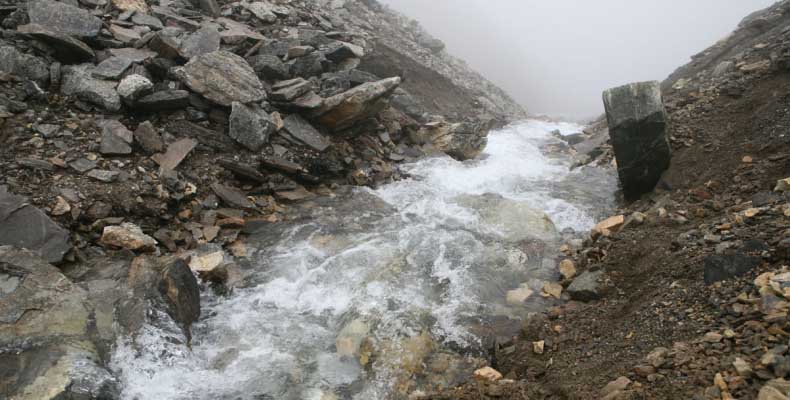 Дорога вначале несложная, но уже после 5200 русло резко забирается вверх, мы идем по краю воды, по камням, которые Пема сбрасывает в воду.
