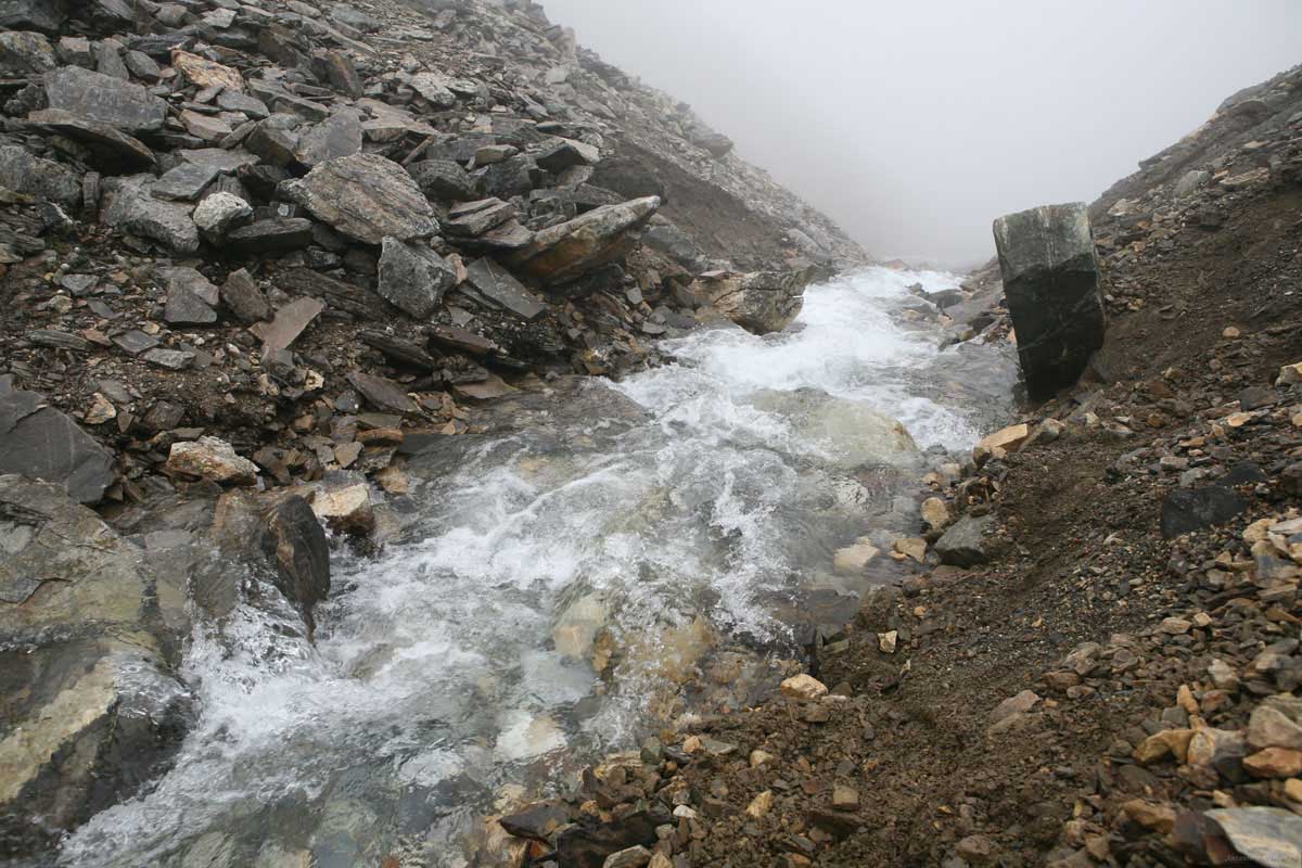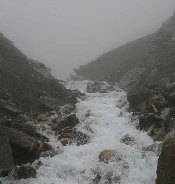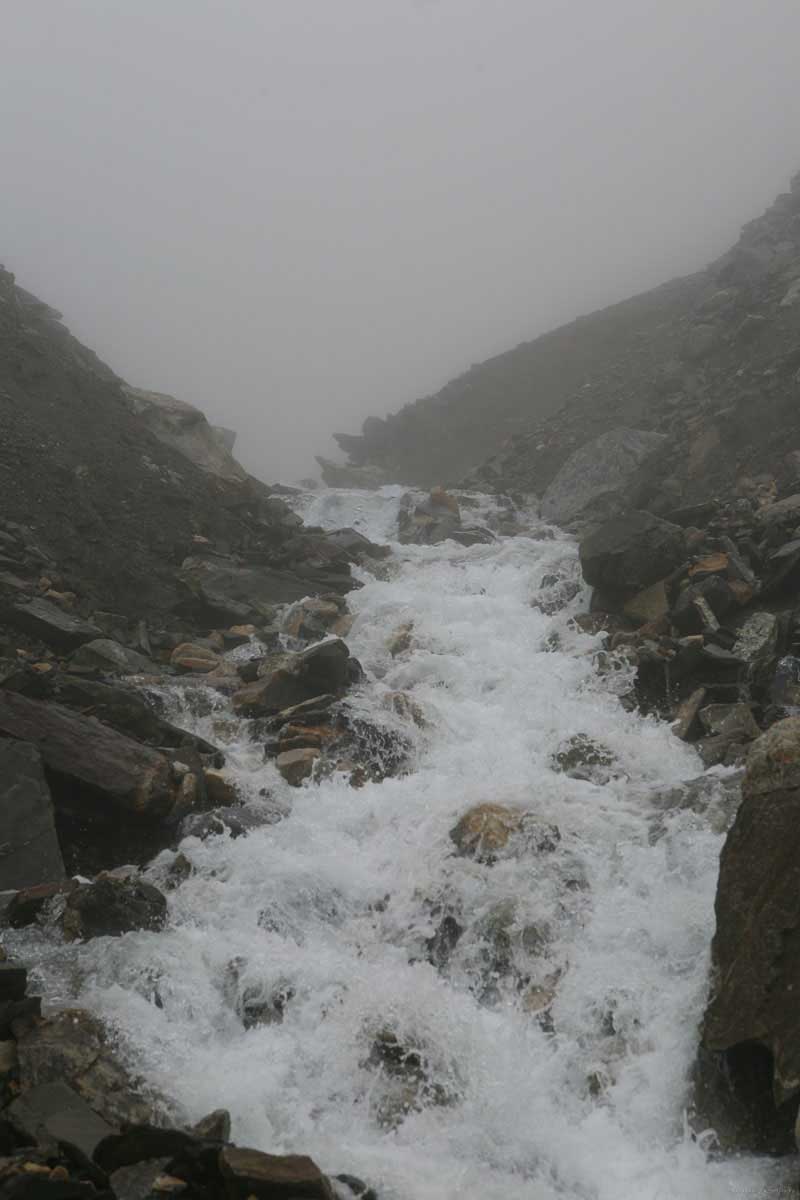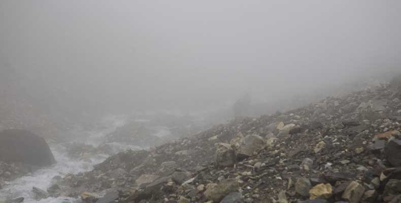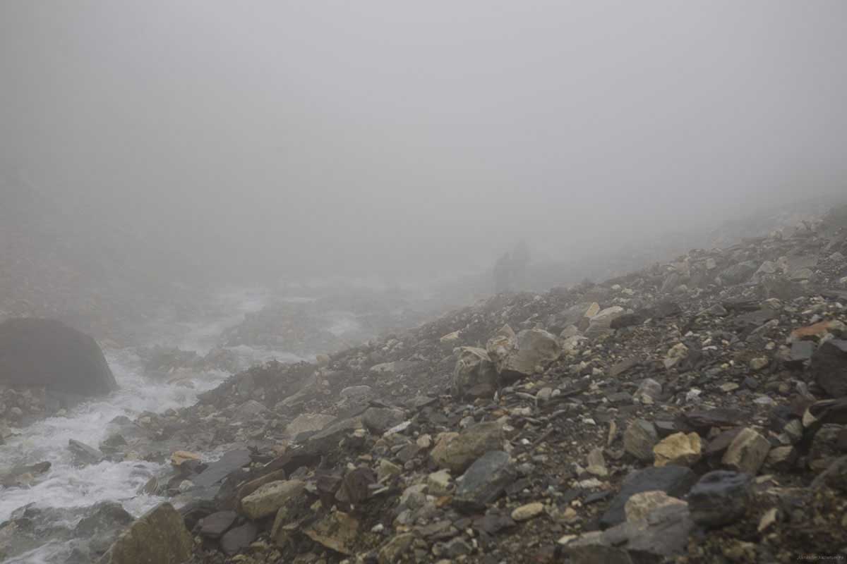 Мы идем по руслу реки, усыпанному разного размера камнями. Тропы нет. Русло медленно, но неуклонно поднимается вверх. Вокруг облако — видимость метров 20.