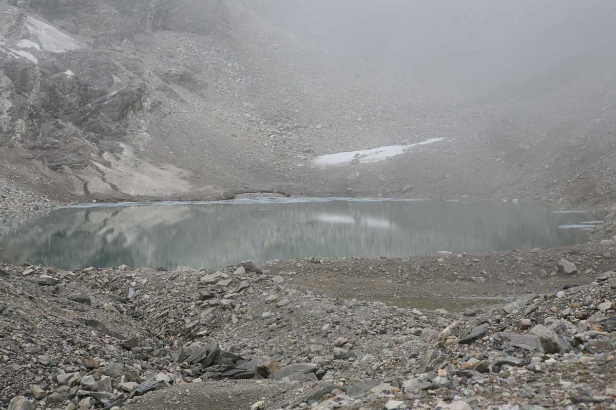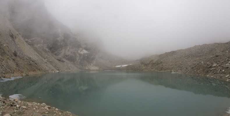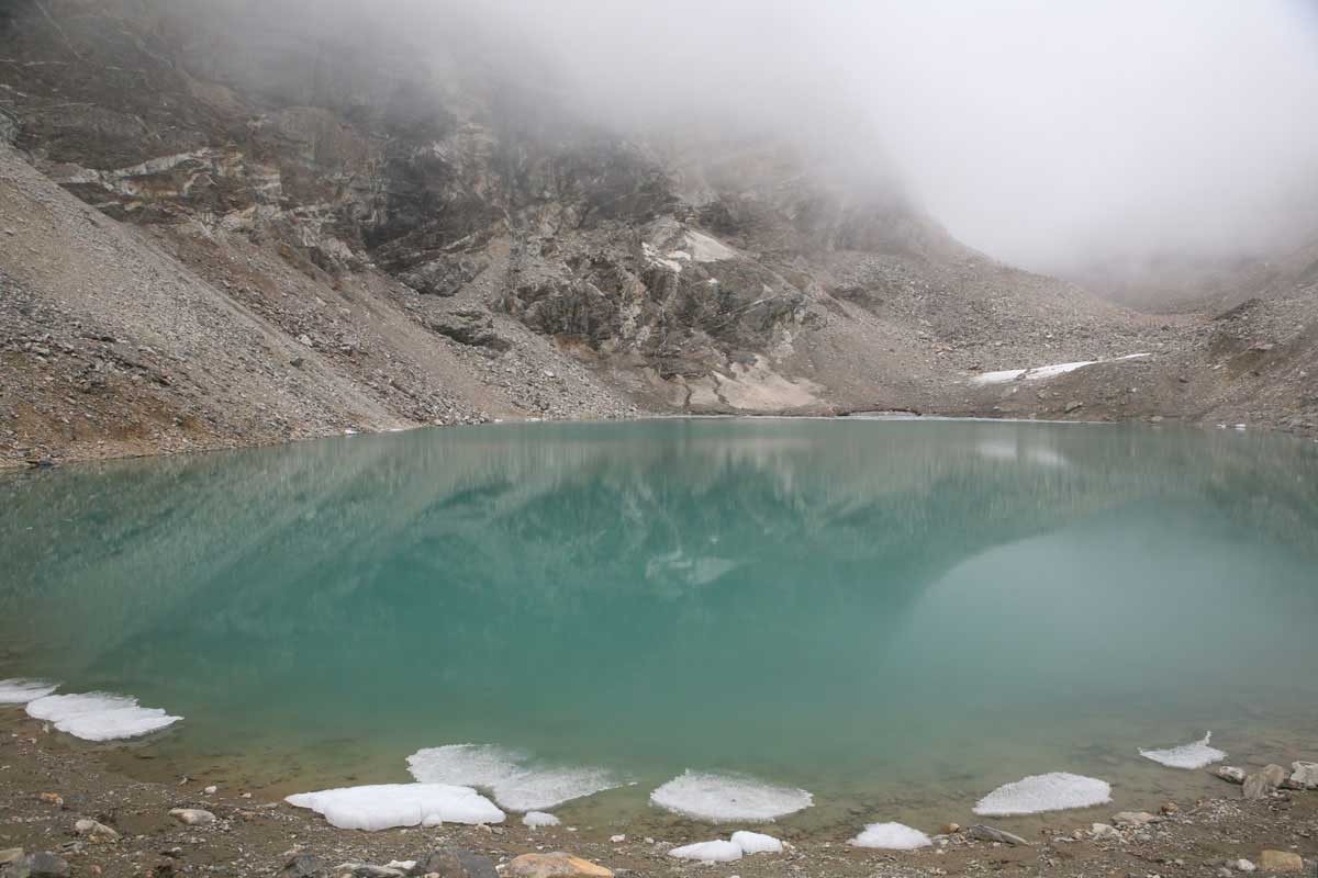 И тут с очередного перевальчика открывается небольшое озерцо с темно-бирюзовой водой. Тучки расходятся и появляются в поле зрения два ледника. Солнечный свет хоть и пробивается с трудом через облако, но это реальный солнечный свет.