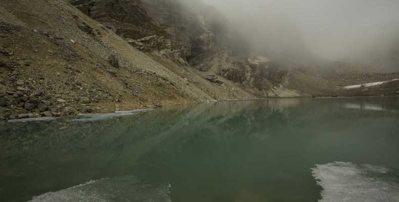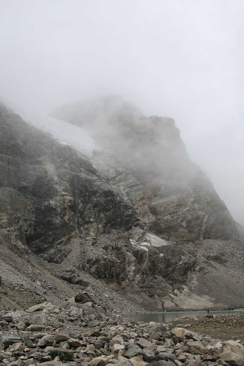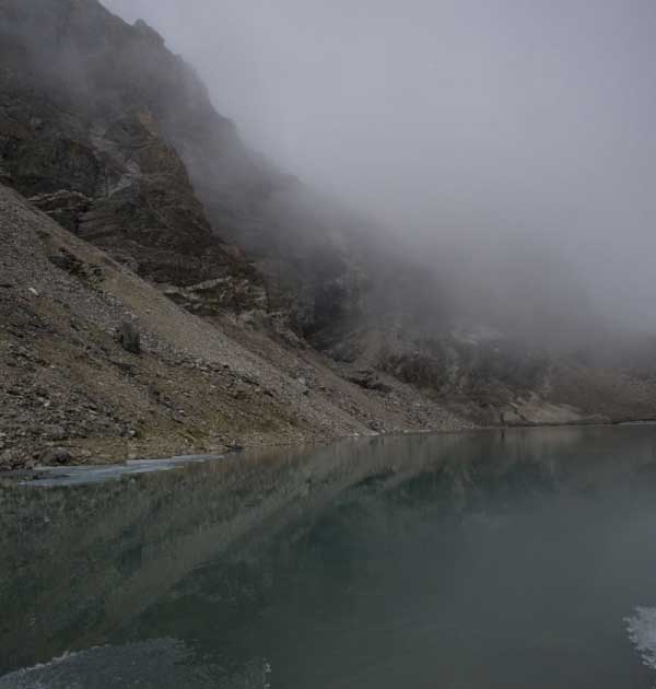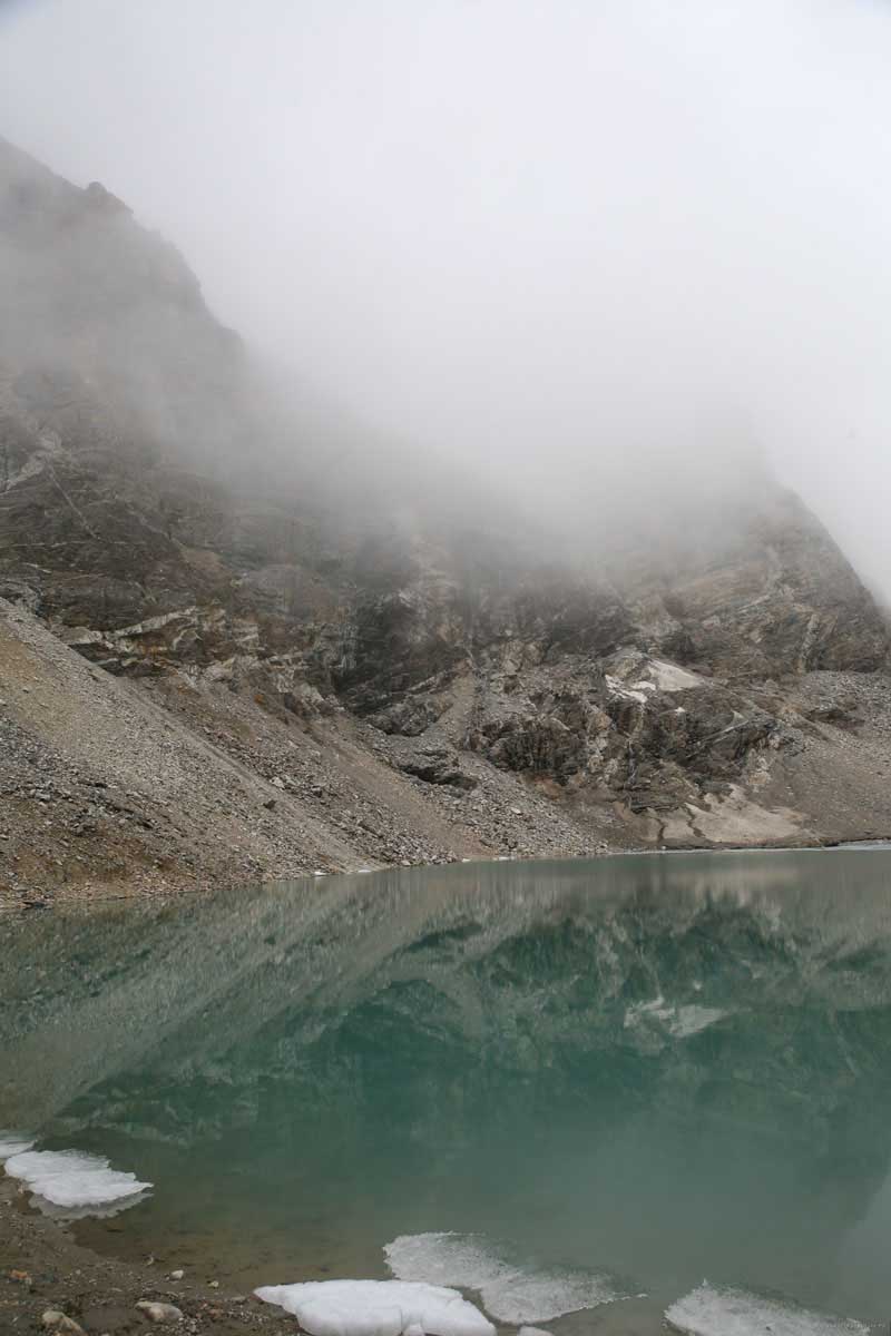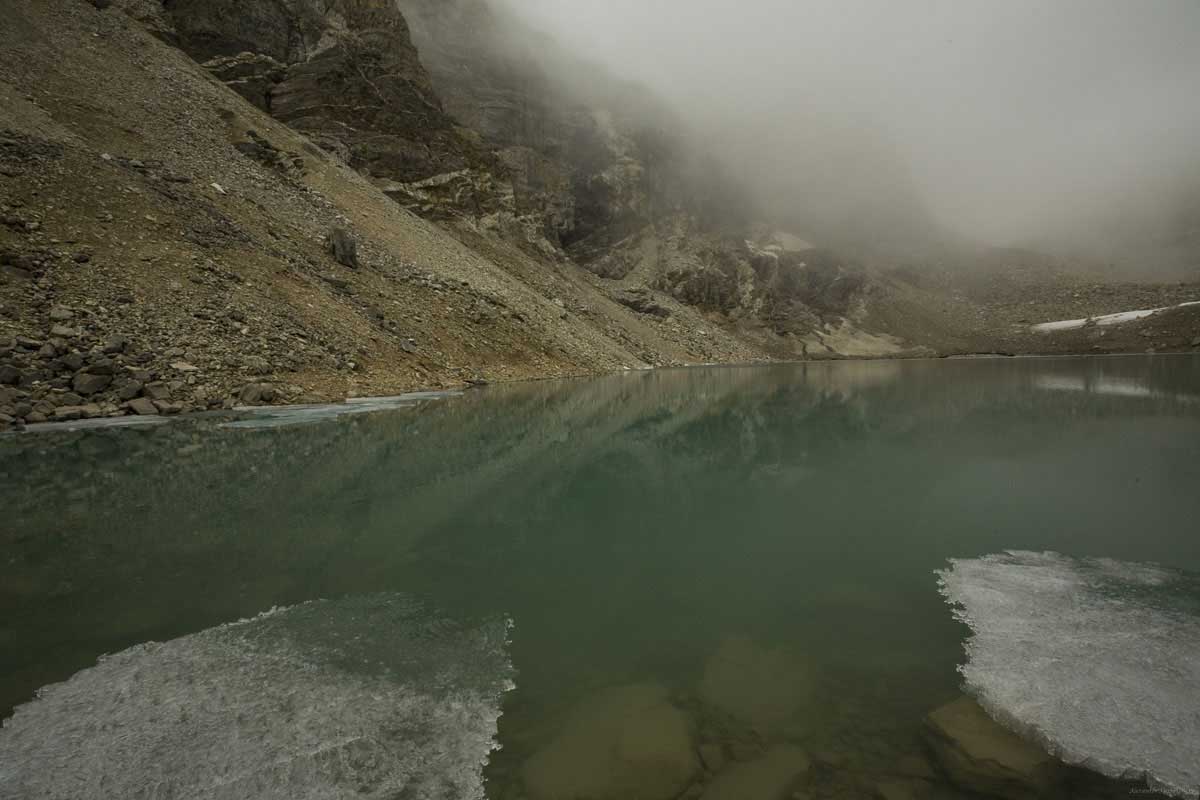 Это свежий снег, он выпал сегодня ночью. Если бы мы пошли на день позже к озеру, то ночевали бы в снегу. Это не проблема, но берега реки еще выше покрылись бы снегом и льдом. А это уже морена, и просто так не пройти. Это к вопросу о неуловимом Джо.