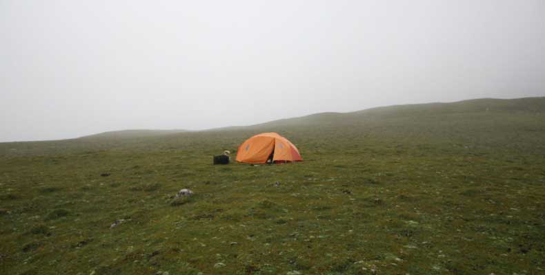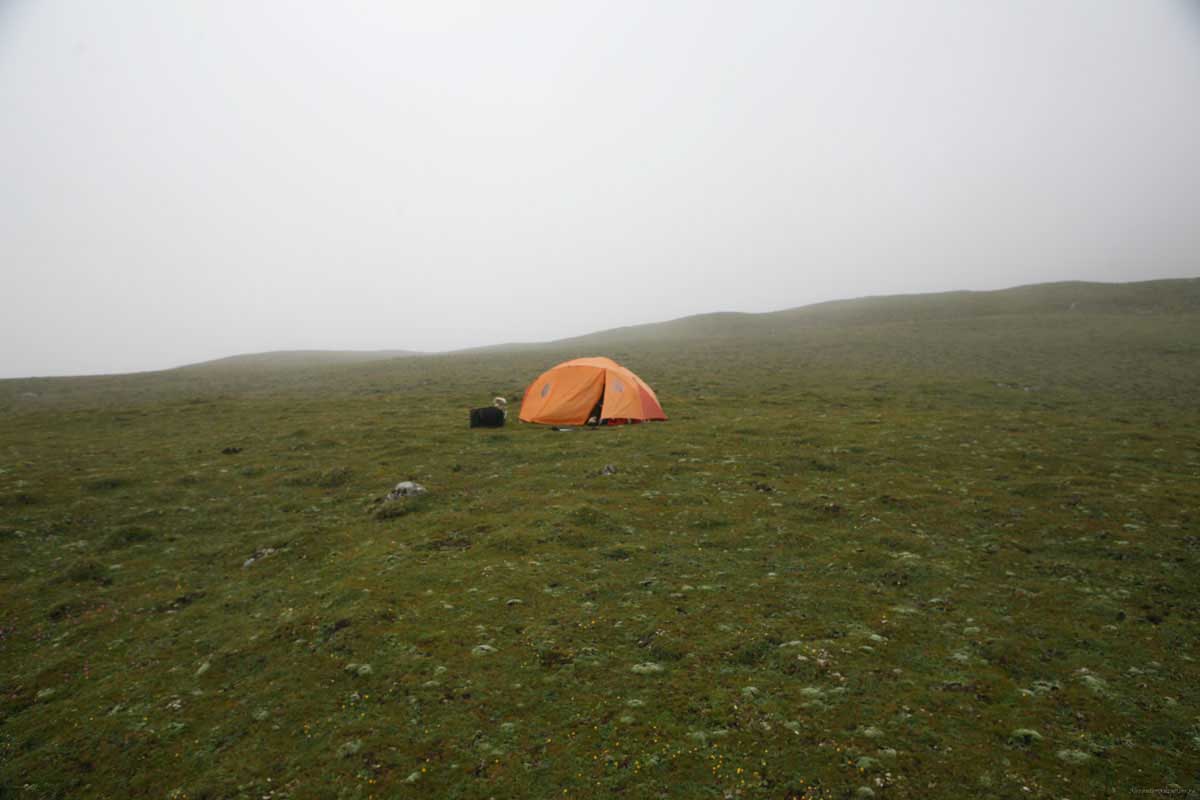 Разбиваем лагерь на пустом месте на высоте 4900. Мы в облаке, время – чуть за полдень. Дождь. Чем заняться?