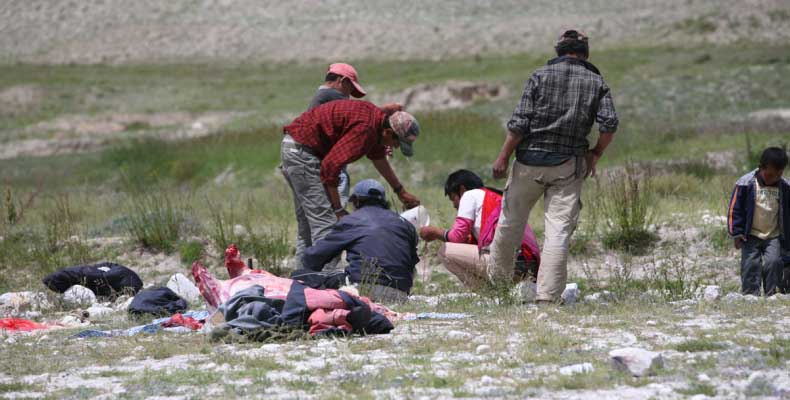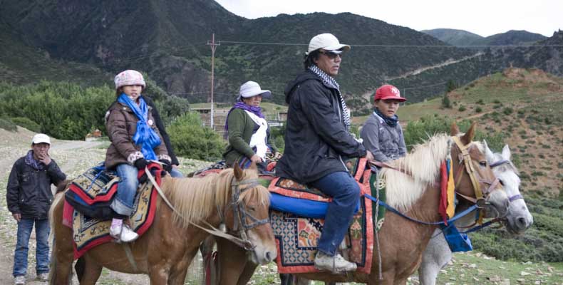 Вдоль дороги бабушки и дедушки тянут мелиорационную пластиковую трубу. Попросили у меня конфет, а я, дурак, все детям отдал. Знайте, не только дети, но и взрослые с удовольствием едят конфеты-леденцы: и Дава, и Пема... и только изредка – лошади.