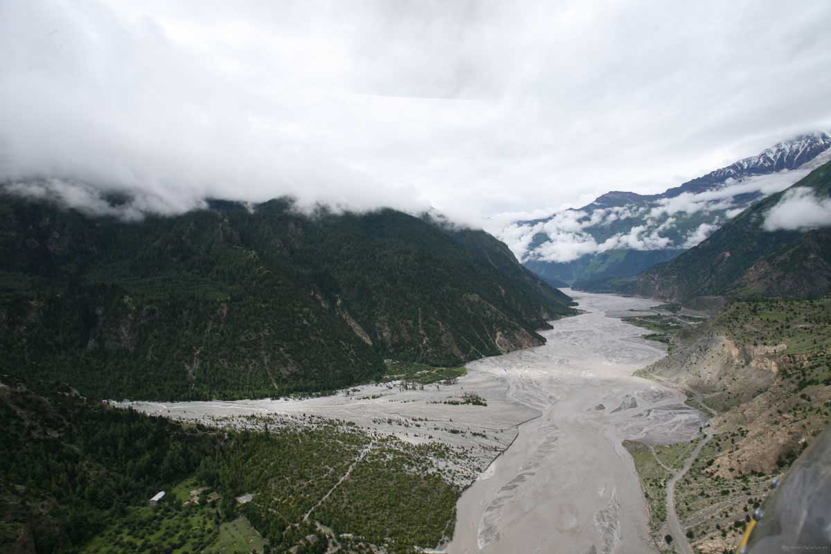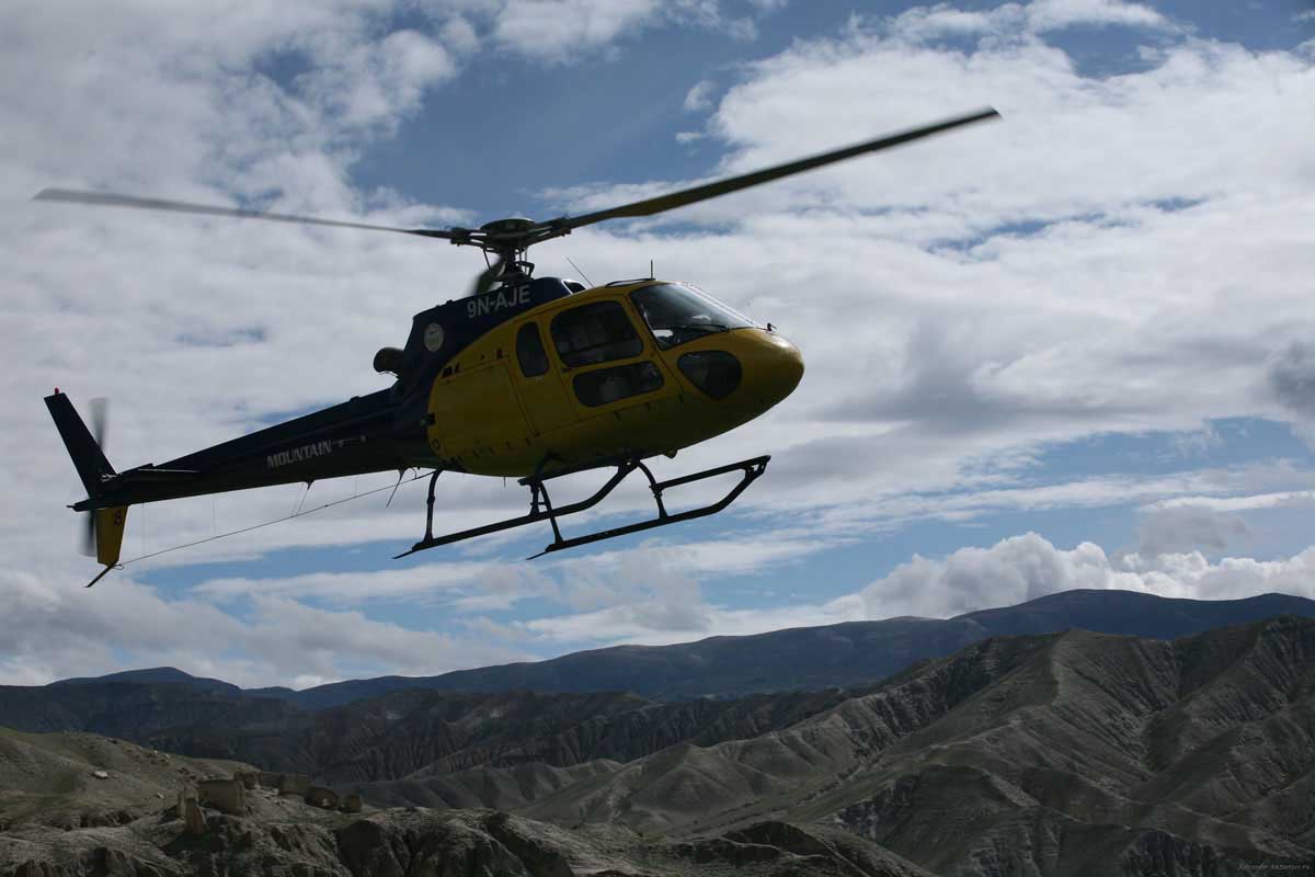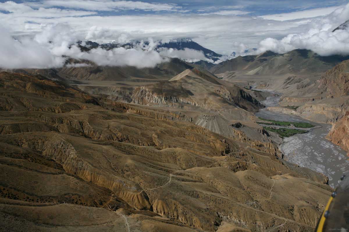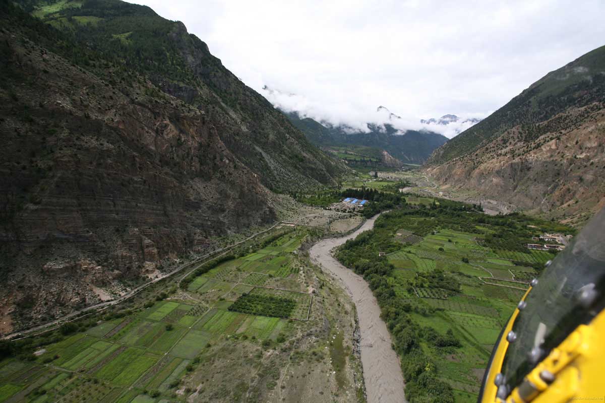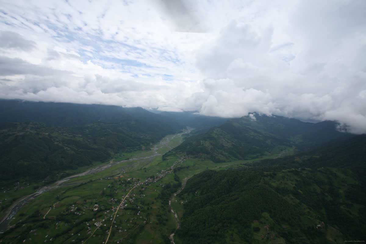 Вертолетик не может забрать сразу всех. Сначала он перебрасывает нас с полицейским на поляну в пяти минутах лёта (опасный участок). Я, как дурак, сижу сзади и ничего не получается сфоткать через стекло. Потом вертолетик возвращается за Давой и багажом, и теперь уже мы все вместе летим в Джомсом. Я уже сижу на месте полицейского и, высунув руку с привязанном аппаратом в окно, снимаю все в автоматическом режиме. Нацелиться в видоискатель на уровне пупка нет никакой возможности.