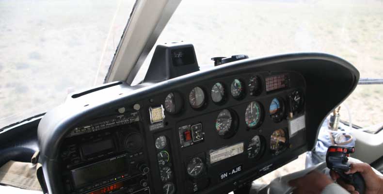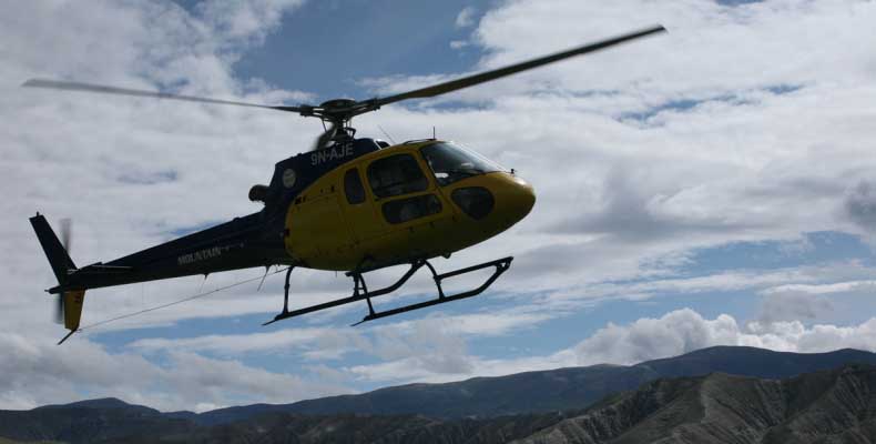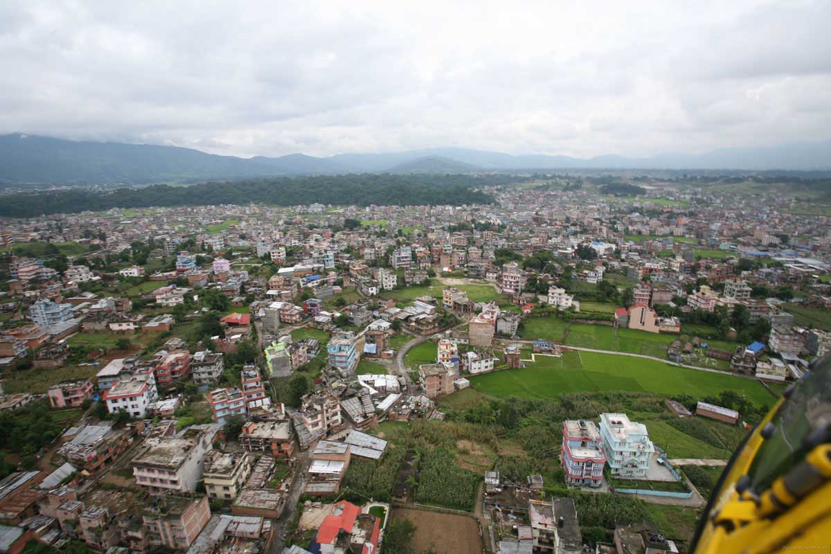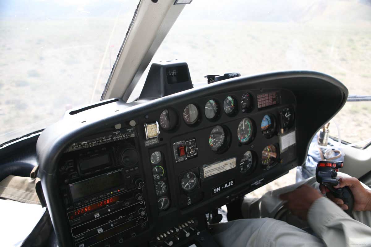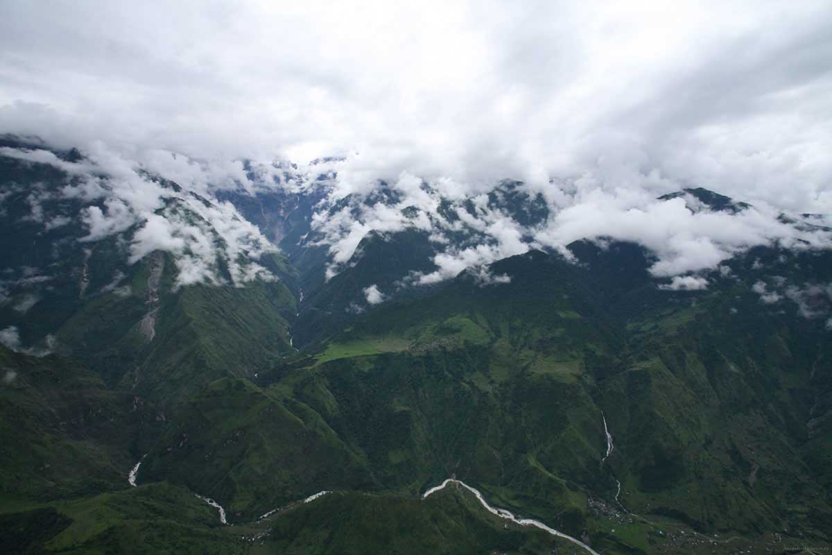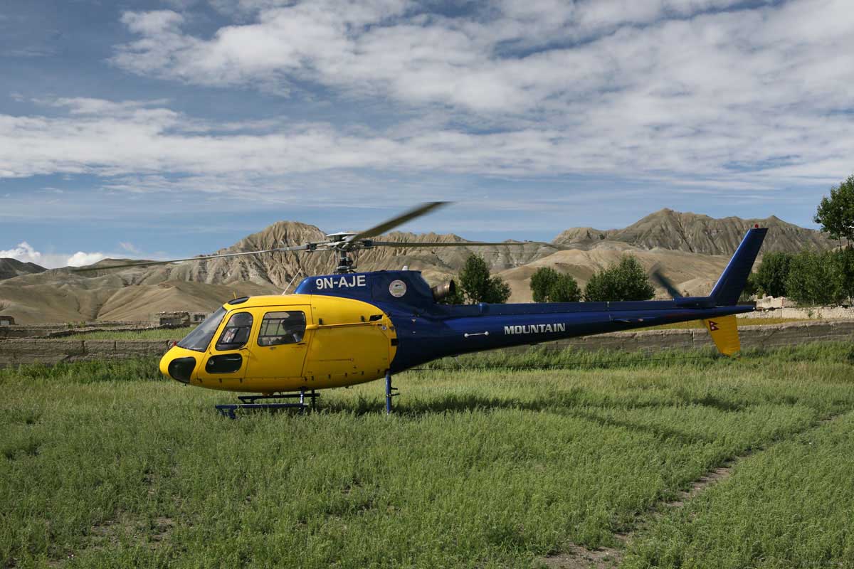 Вертолетик не может забрать сразу всех. Сначала он перебрасывает нас с полицейским на поляну в пяти минутах лёта (опасный участок). Я, как дурак, сижу сзади и ничего не получается сфоткать через стекло. Потом вертолетик возвращается за Давой и багажом, и теперь уже мы все вместе летим в Джомсом. Я уже сижу на месте полицейского и, высунув руку с привязанном аппаратом в окно, снимаю все в автоматическом режиме. Нацелиться в видоискатель на уровне пупка нет никакой возможности.